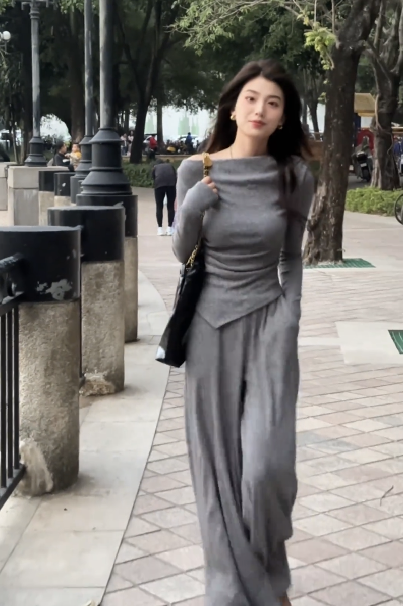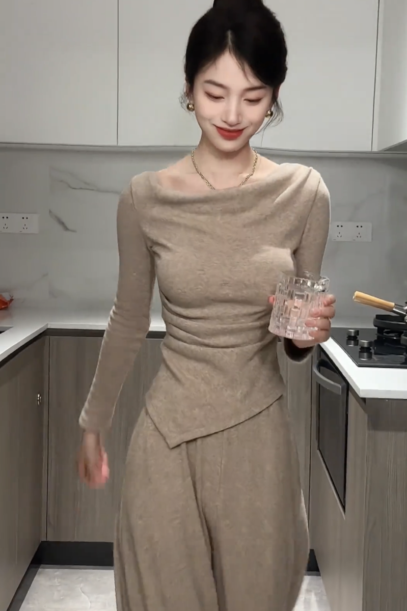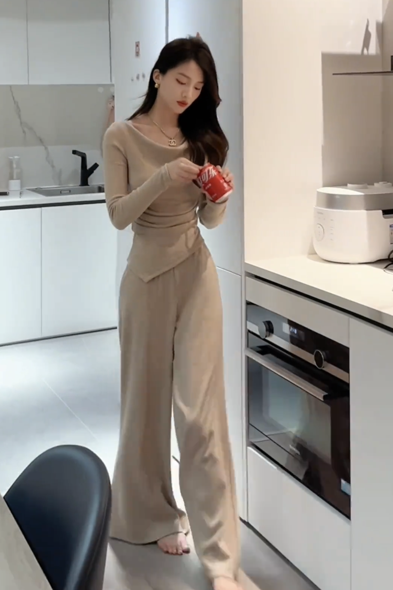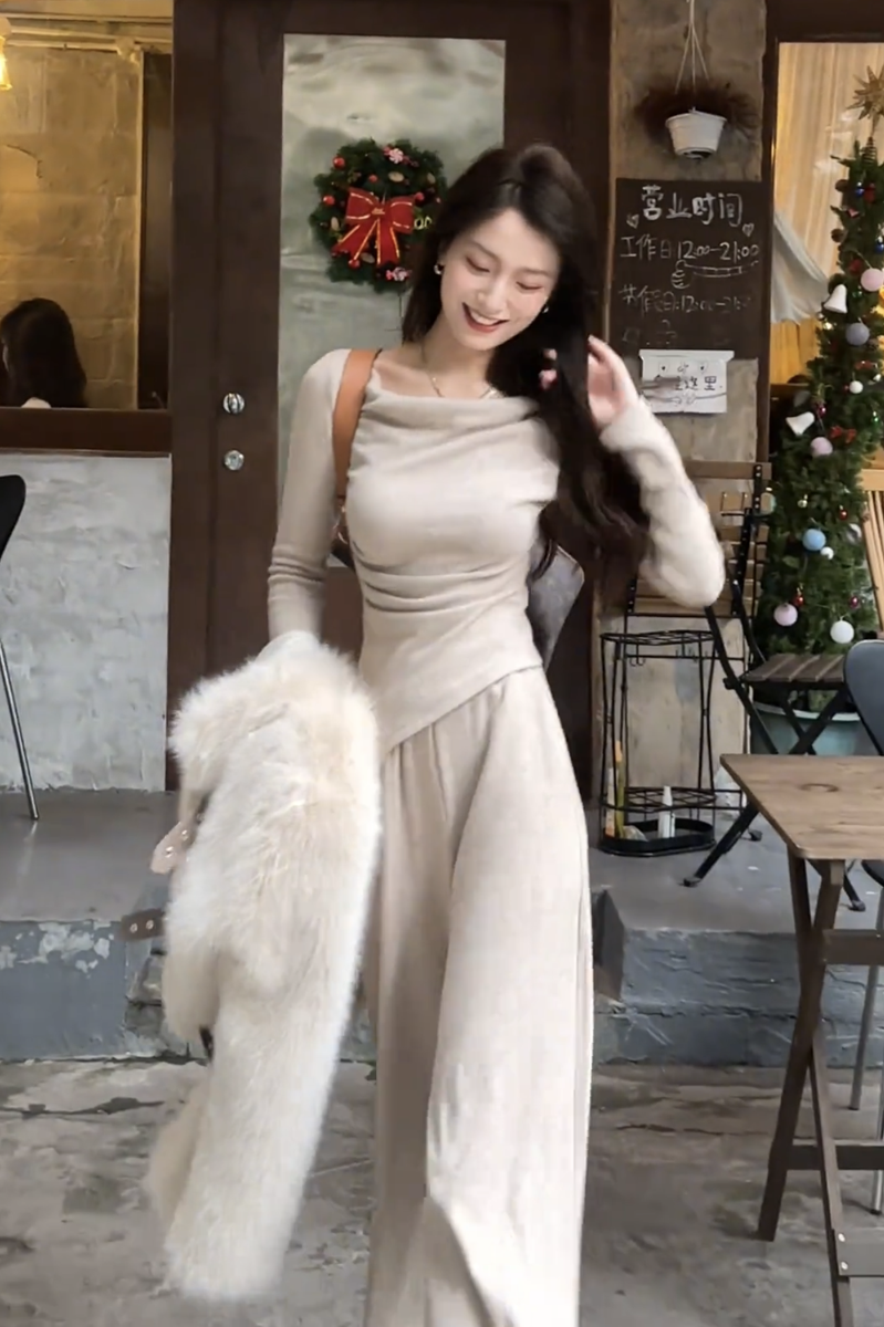 2025 Autumn New Women's Gentle Style Off-Shoulder Irregular Slimming Top Versatile Casual Wide-Leg Pants Two-Piece Set