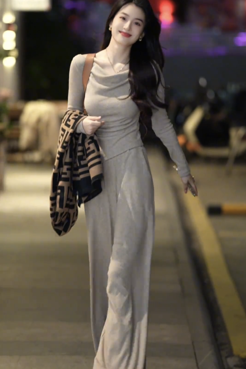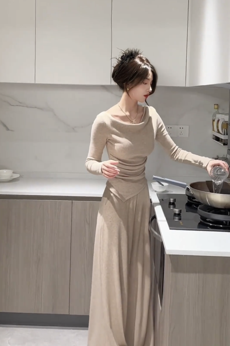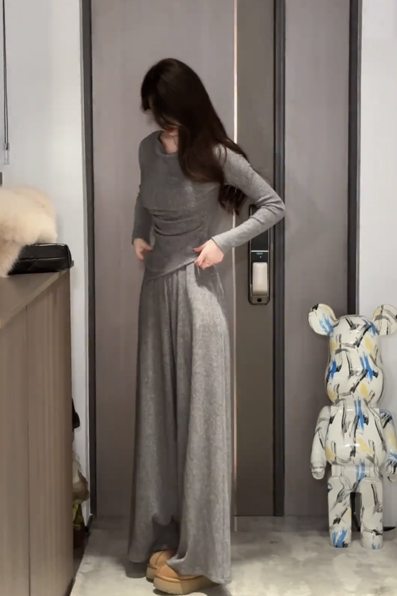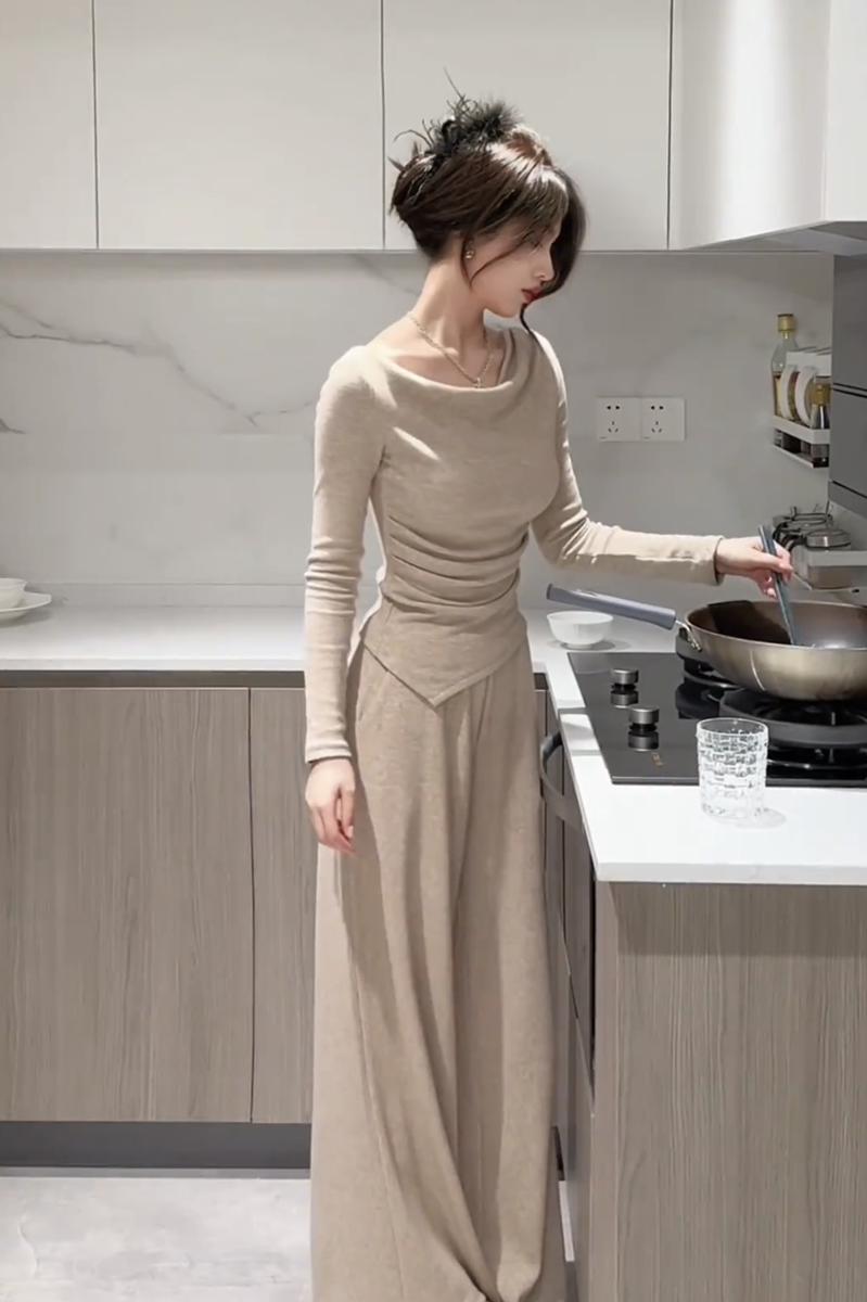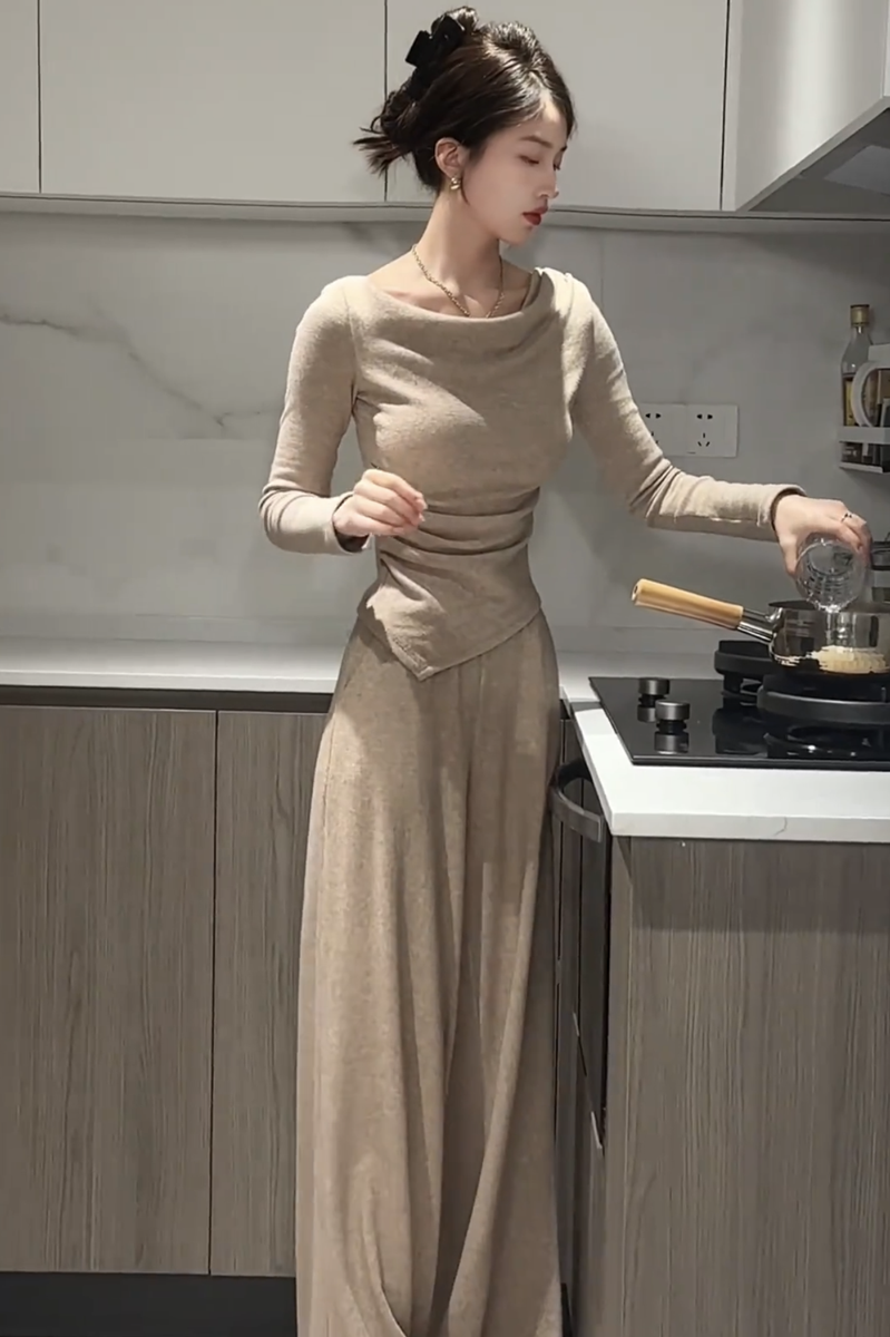 2025 Autumn New Women's Gentle Style Off-Shoulder Irregular Slimming Top Versatile Casual Wide-Leg Pants Two-Piece Set