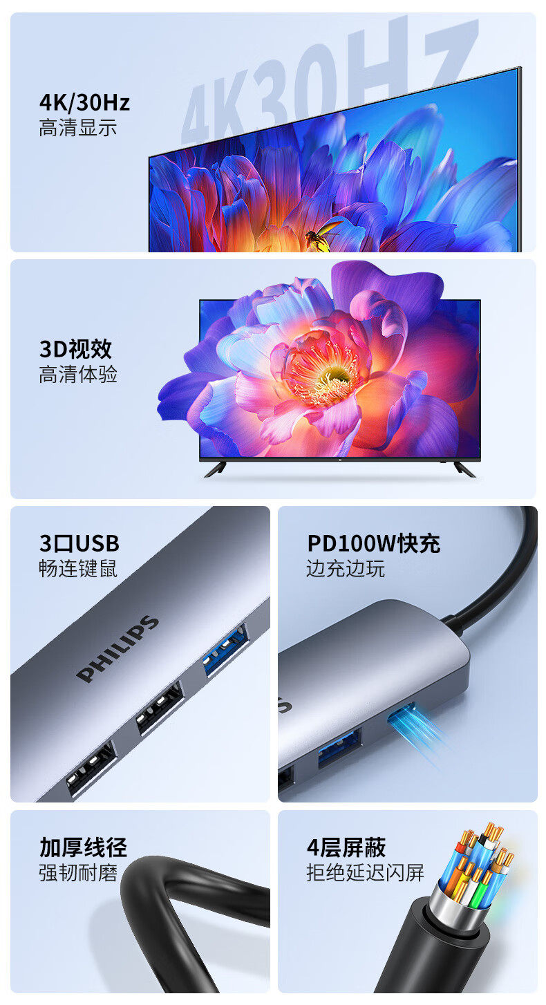 Philips Type-C Docking Station Usb-C to HDMI Thunderbolt 4 Docking Station Splitter Apple 15 Huawei Computer Converter Universal MacBook Laptop iPad Pro Adapter Hub
