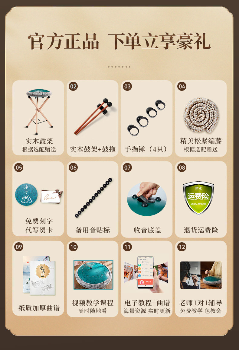 颜色分类 勿拍此项【收藏加购送】纸质曲谱+免费教学,13寸15音祖母绿(C调)+赠品,13寸15音藏青色(C调)+赠品,13寸15音孔雀绿(C调)+赠品,13寸15音鎏金色(C调)+赠品,13寸15音中国红(C调)+赠品,13寸15音(C调)+鼓架+赠品【颜色备注】,勿拍此项——【15音C调升级款音质更好】-----,14寸15音祖母绿(C调)+赠品,14寸15音孔雀绿(C调)+赠品,14寸15音藏青色(C调)+赠品,14寸15音典雅白(C调)+赠品,14寸15音(C调)+鼓架+赠品【颜色备注】,勿拍此项——【学院推荐15音D调款音色更高】-----,D调新旧款音序混发,13寸15音莲韵款祖母绿(D调)+赠品,13寸15音祥瑞款祖母绿(D调)+赠品,13寸15音祥瑞款藏青色(D调)+赠品,13寸15音(D调)+鼓架+赠品【颜色备注】,14寸15音莲韵款祖母绿(D调)+赠品,14寸15音祥瑞款祖母绿(D调)+赠品,14寸15音祖母绿(D调)+赠品,14寸15音藏青色(D调)+赠品,14寸15音(D调)+鼓架+赠品【颜色备注】,勿拍此项——【17音进阶款音域更宽】-----,13寸17音(C调)+赠品【颜色备注】,13寸17音(C调)+鼓架+赠品【颜色备注】,勿拍此项——【演奏组合套餐推荐】-----,20音组合鼓祖母绿(C调)+鼓架1个+藤编1条+配件,20音组合鼓黑耀文(C调)+鼓架1个+藤编1条+配件,20音组合鼓藏青色(C调)+鼓架1个+藤编1条+配件,20音组合鼓中国红(C调)+鼓架1个+藤编1条+配件,勿拍此项——【豪华钛金刚款专业音色】-----,钛金钢14寸15音备注颜色(C调)+鼓包+鼓架+赠品