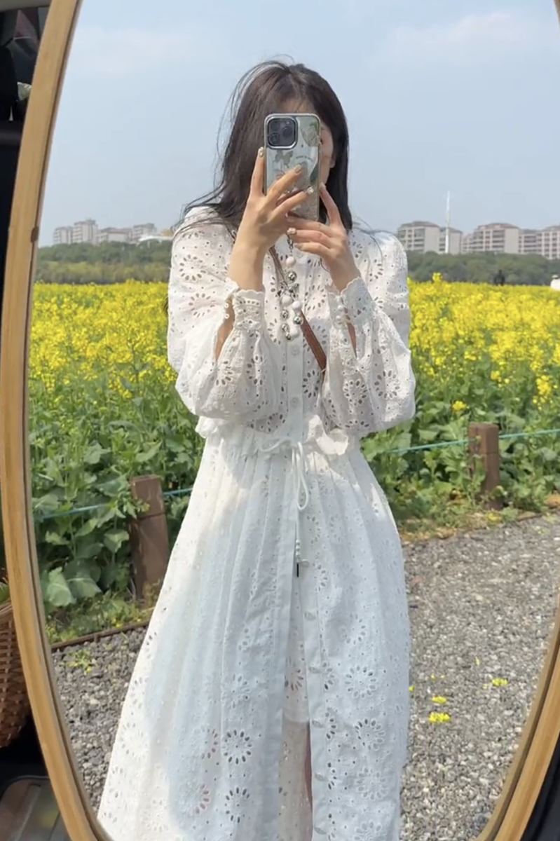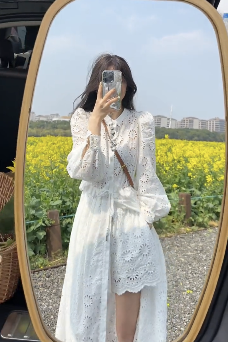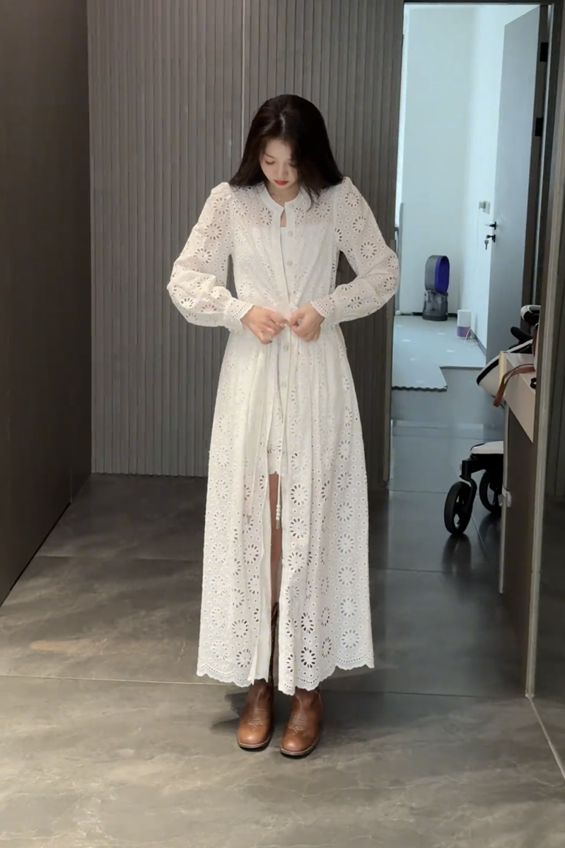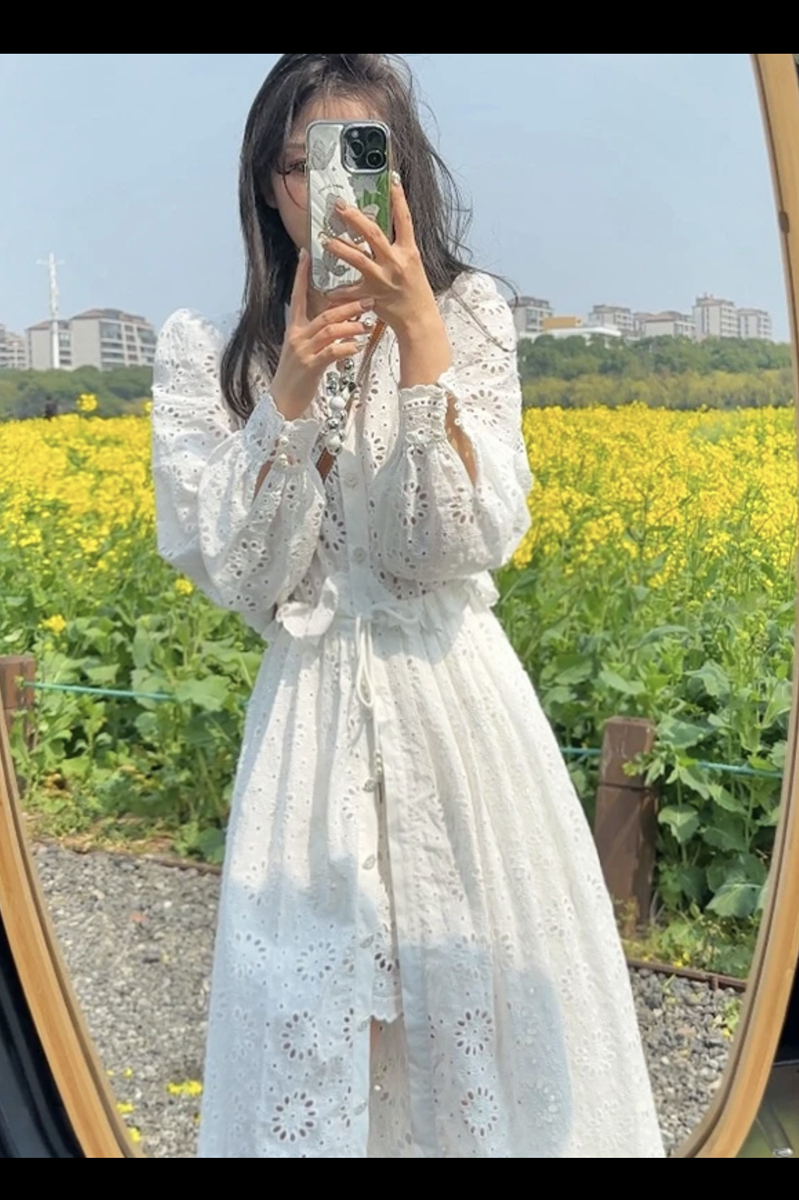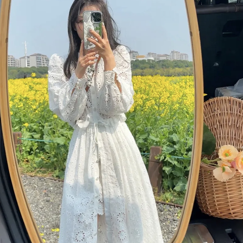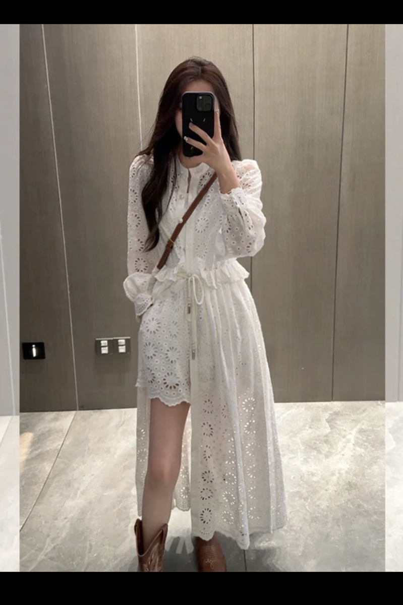 2025 herbst frauen Neue Französisch Sanfte Stil Mid-Länge Spitze Design Schwere Industrie Hohl Kleid Zwei-stück set