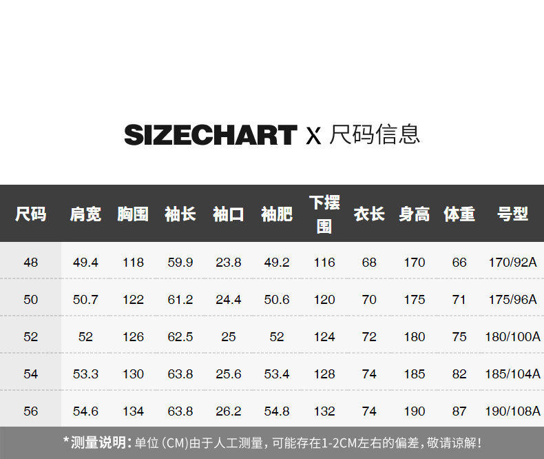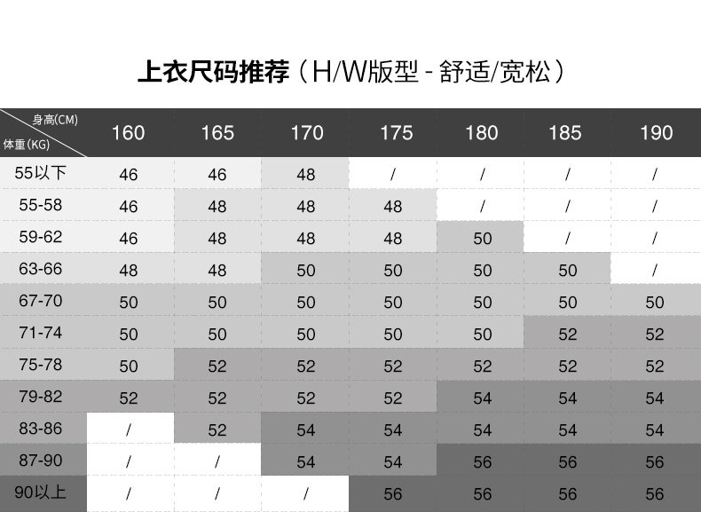 China (cm) 160-165/84-86 165-170 / 88-90 167-172 / 92-96 168-173 / 98-102 170-176 / 106-110
