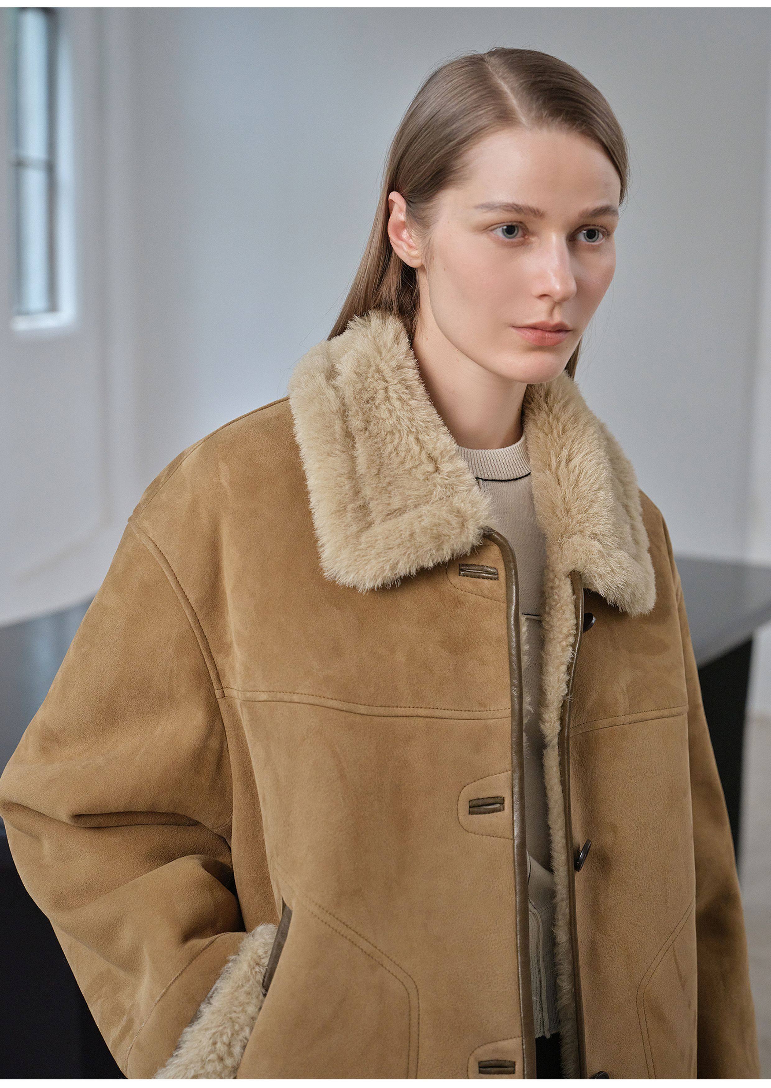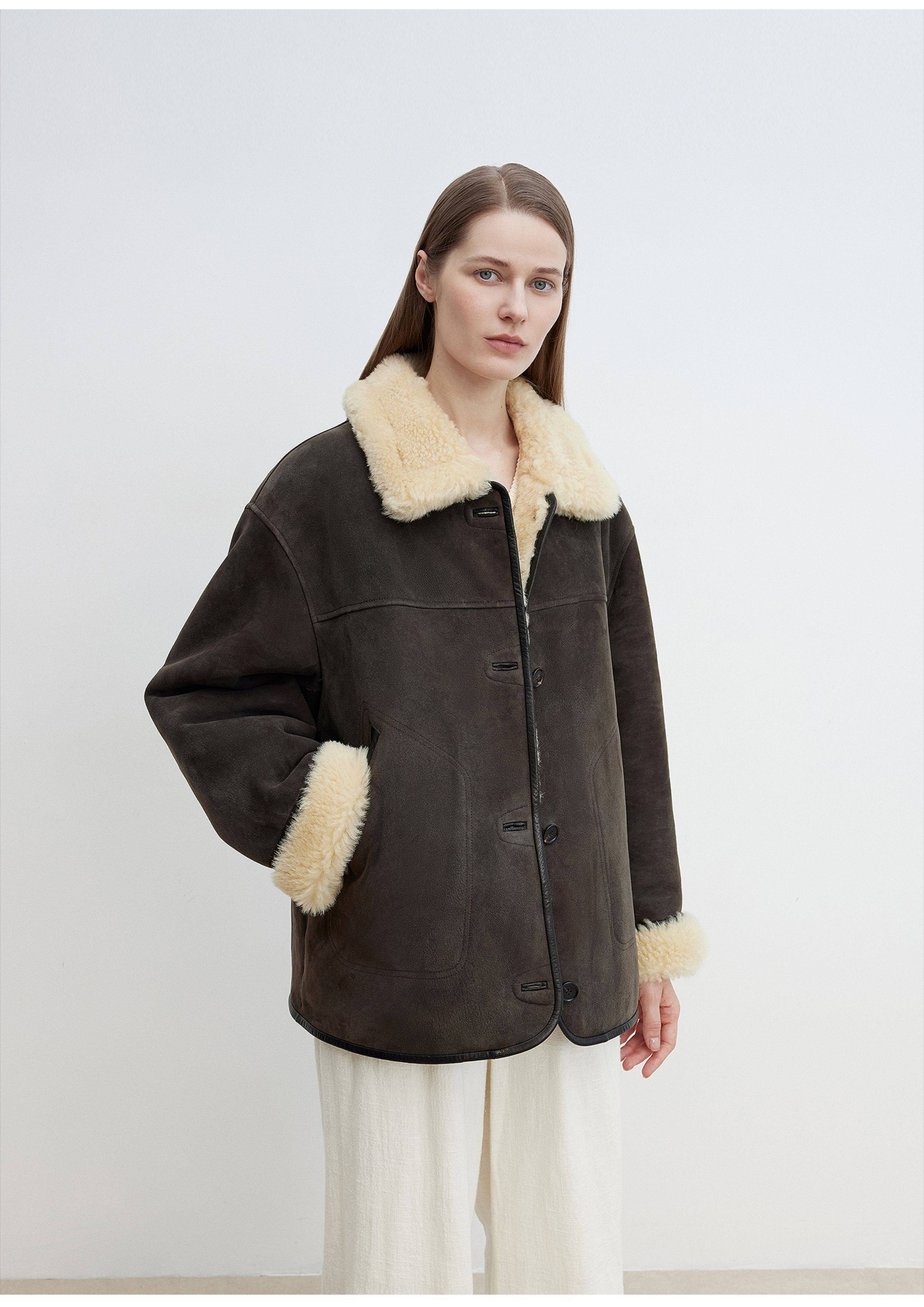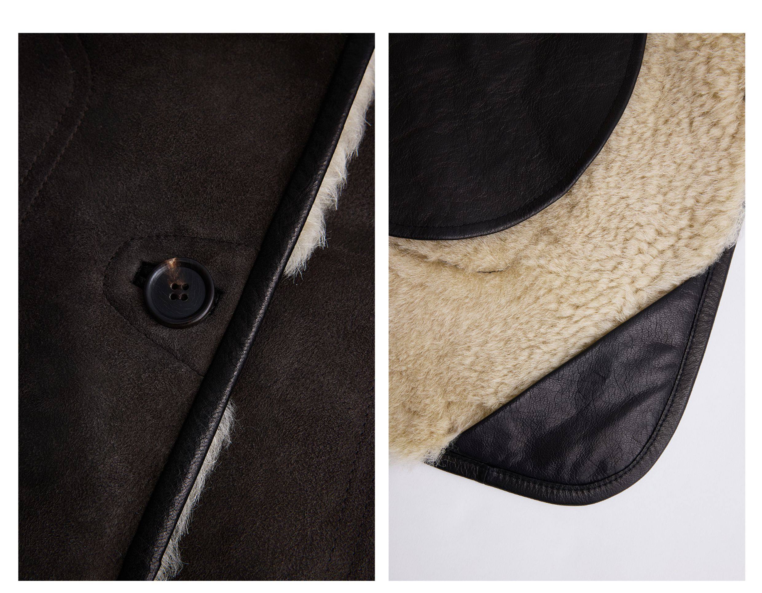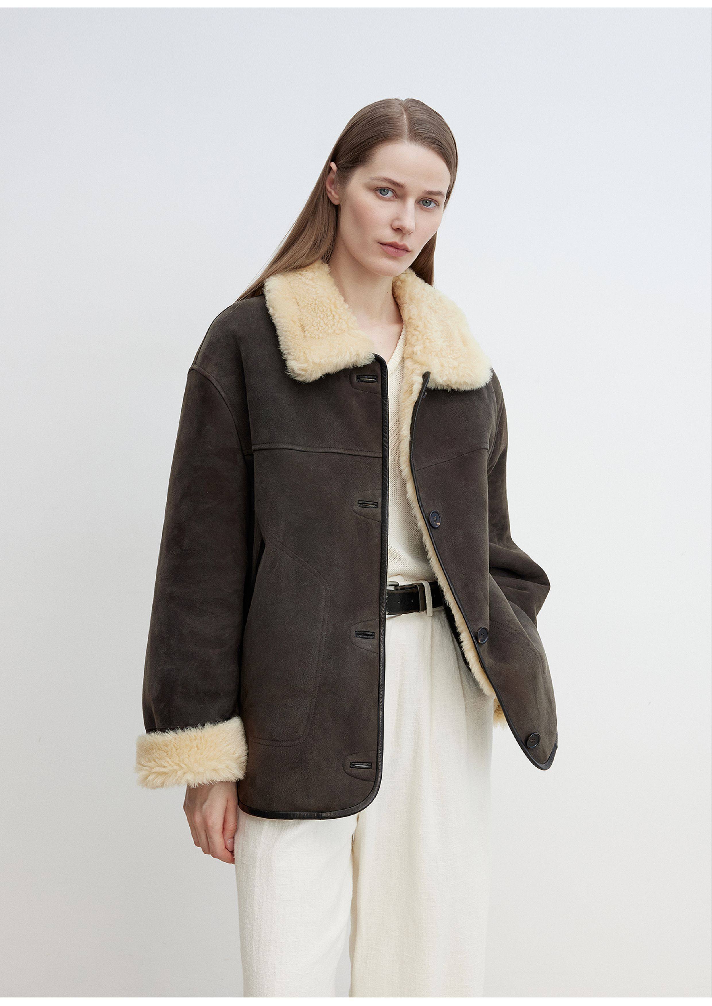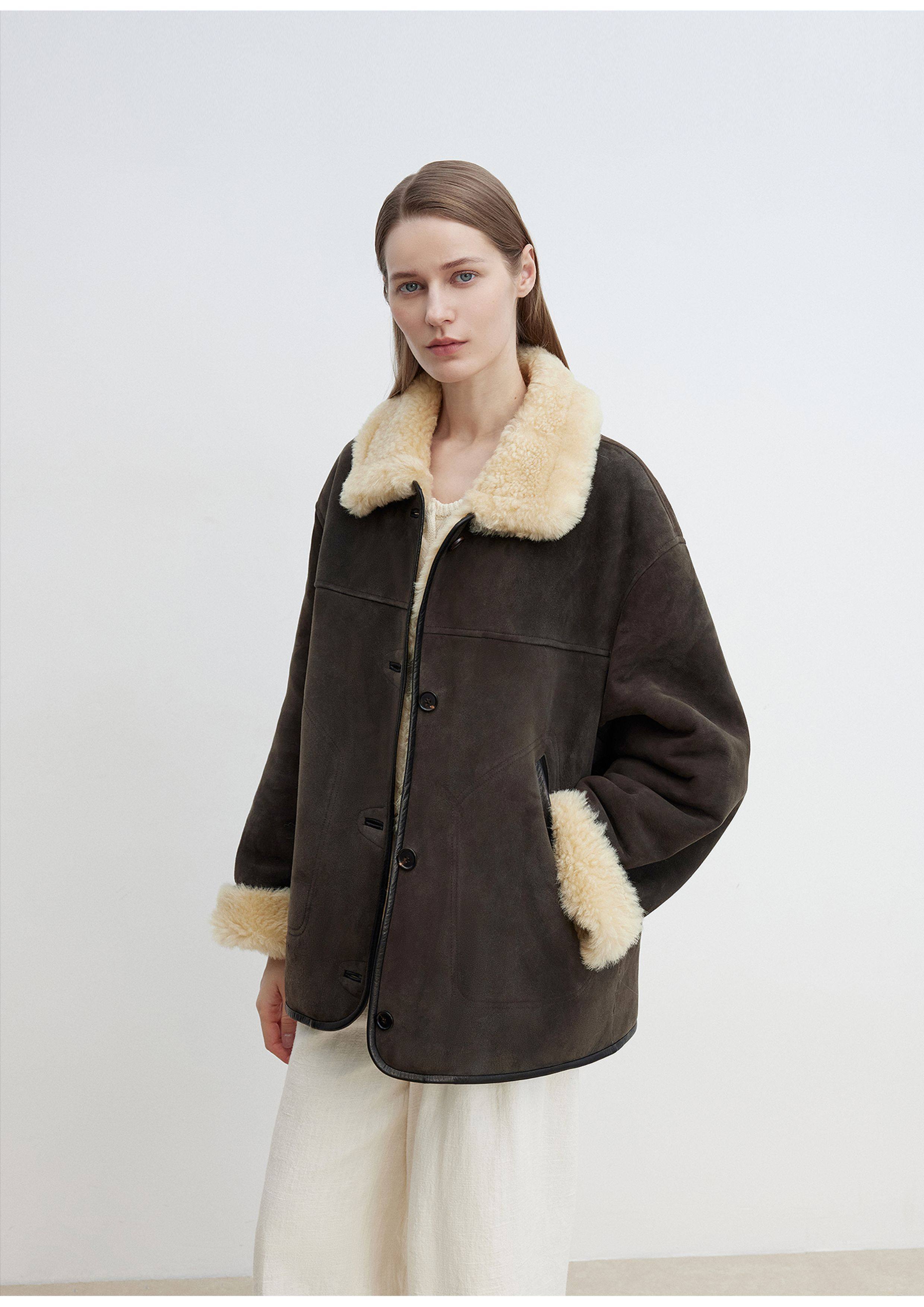 Yuanyi Letrans Winter Coco Merino fur de una sola pieza versión contrastante chaqueta de piel de gamuza mirando hacia afuera