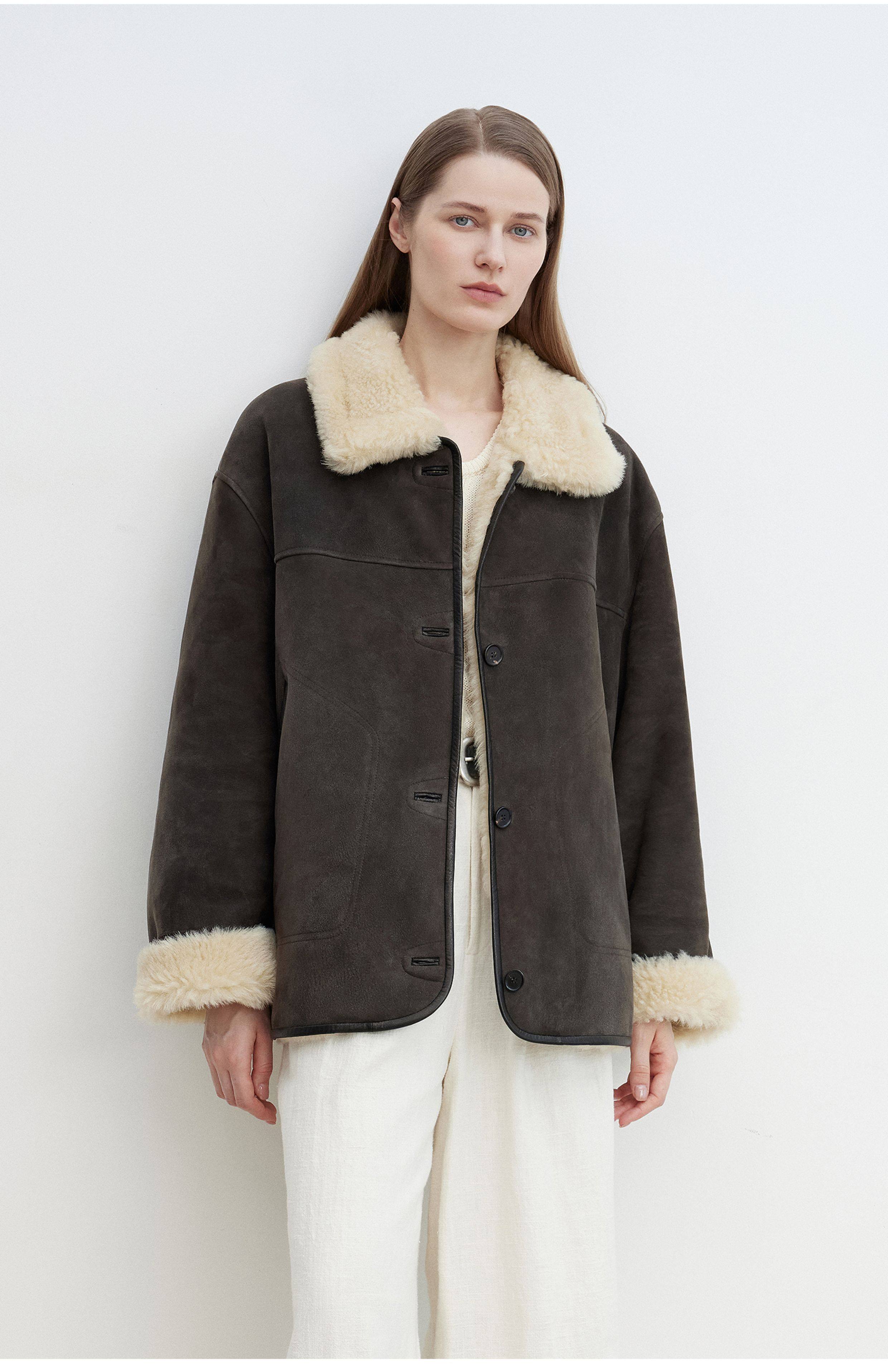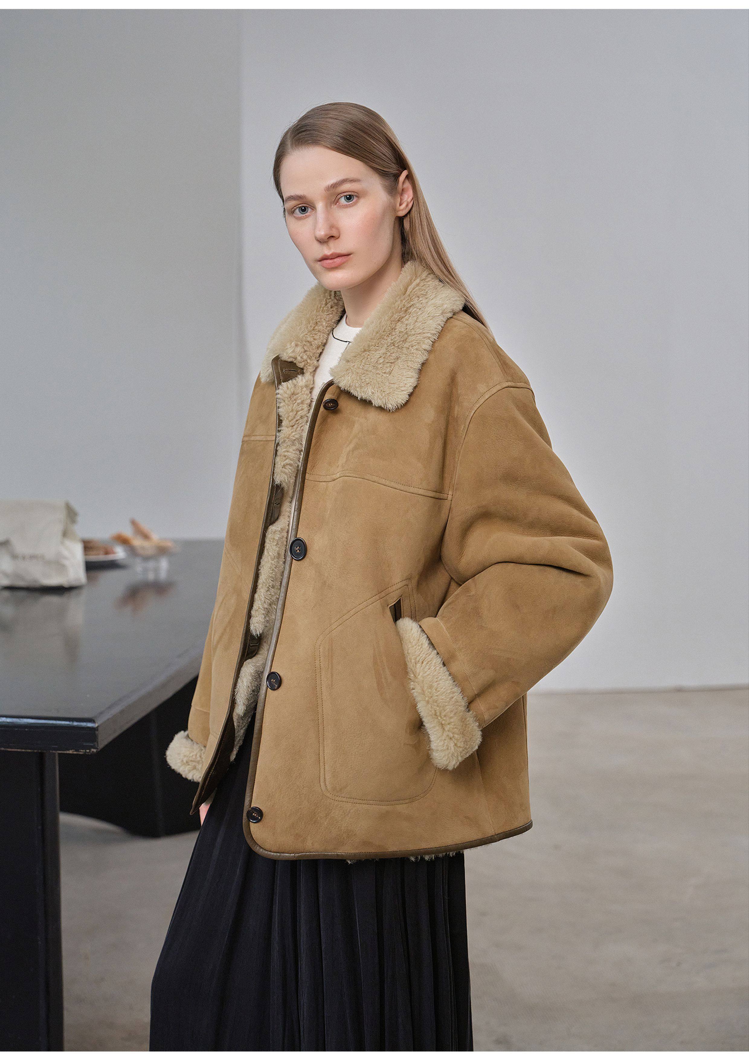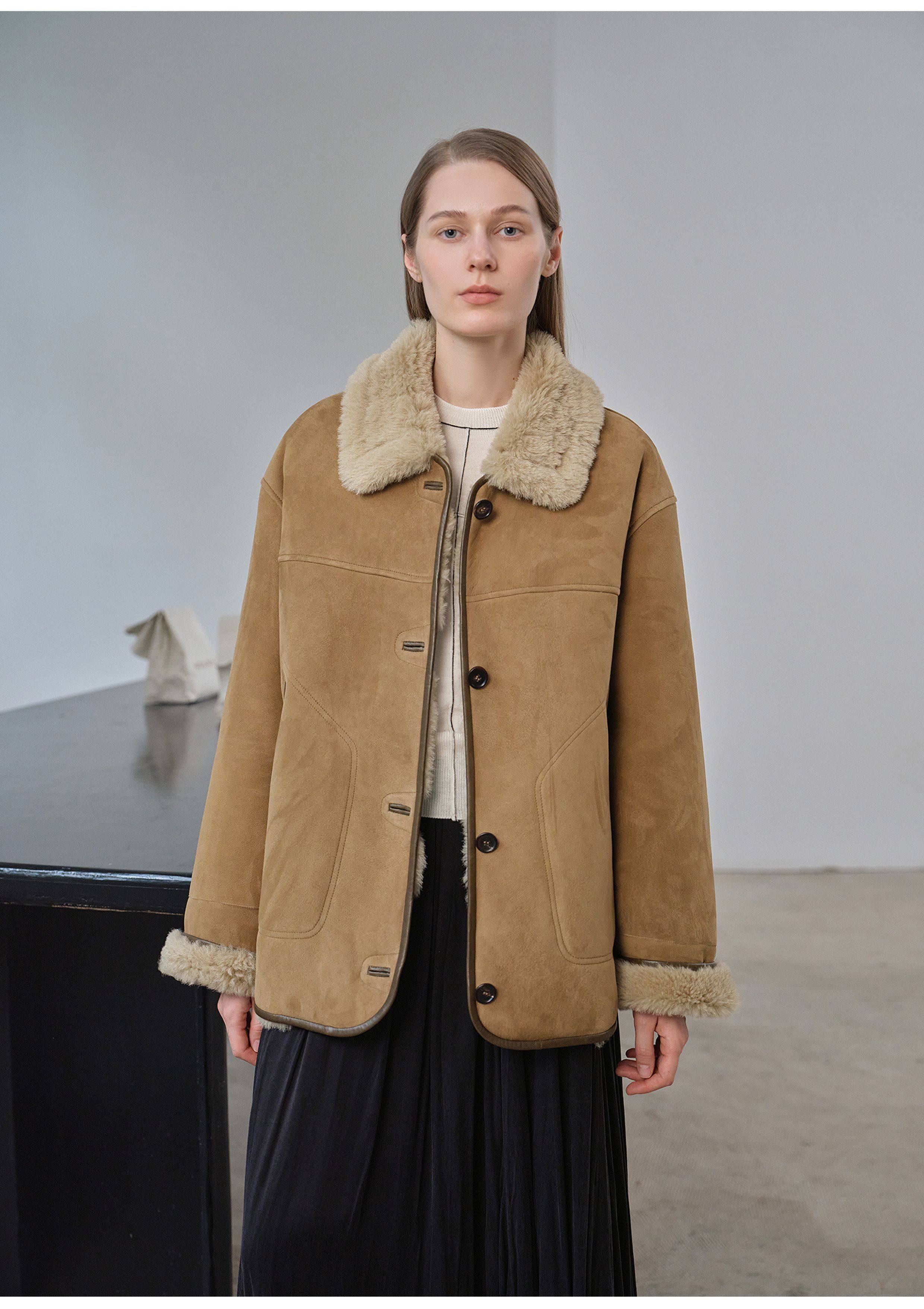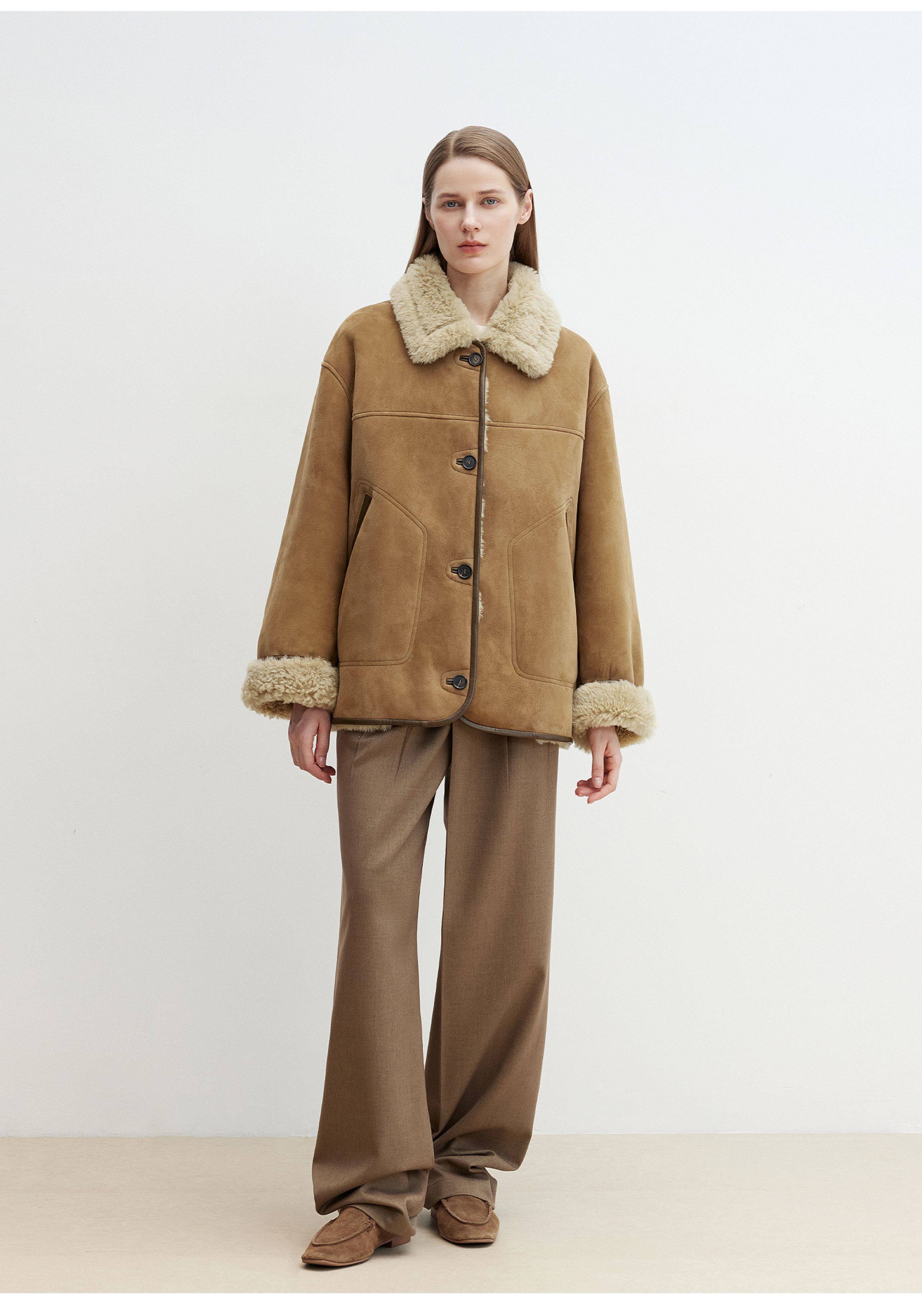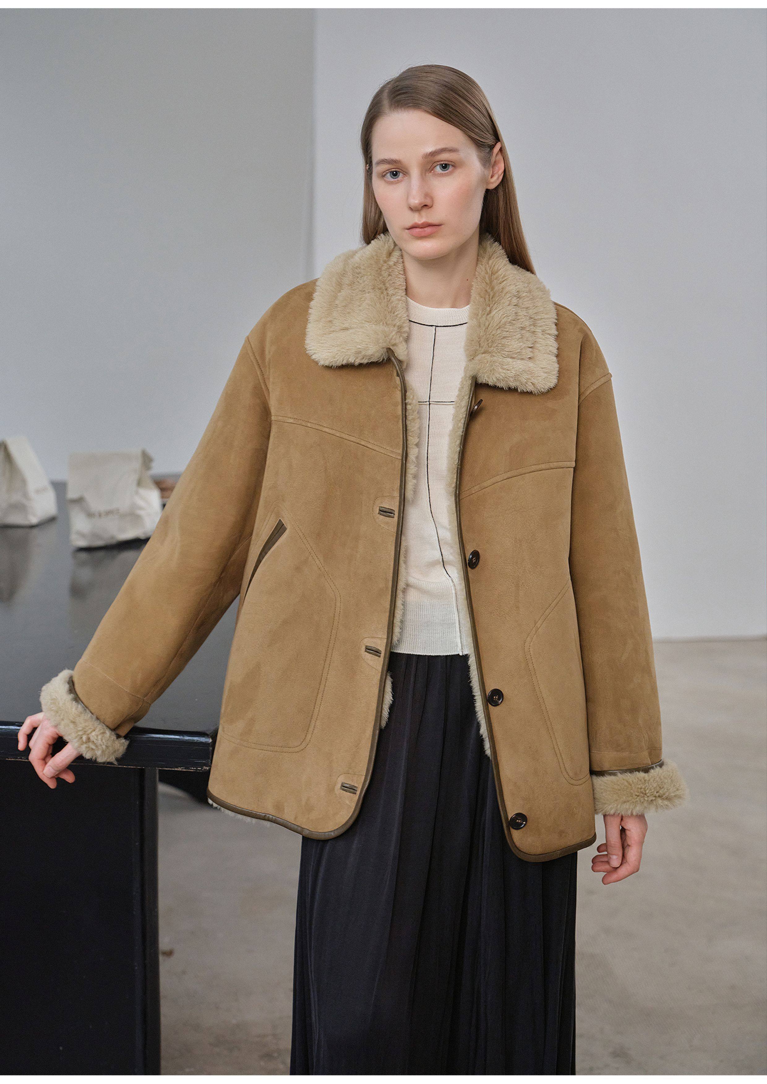 Yuanyi Letrans Winter Coco Merino fur de una sola pieza versión contrastante chaqueta de piel de gamuza mirando hacia afuera