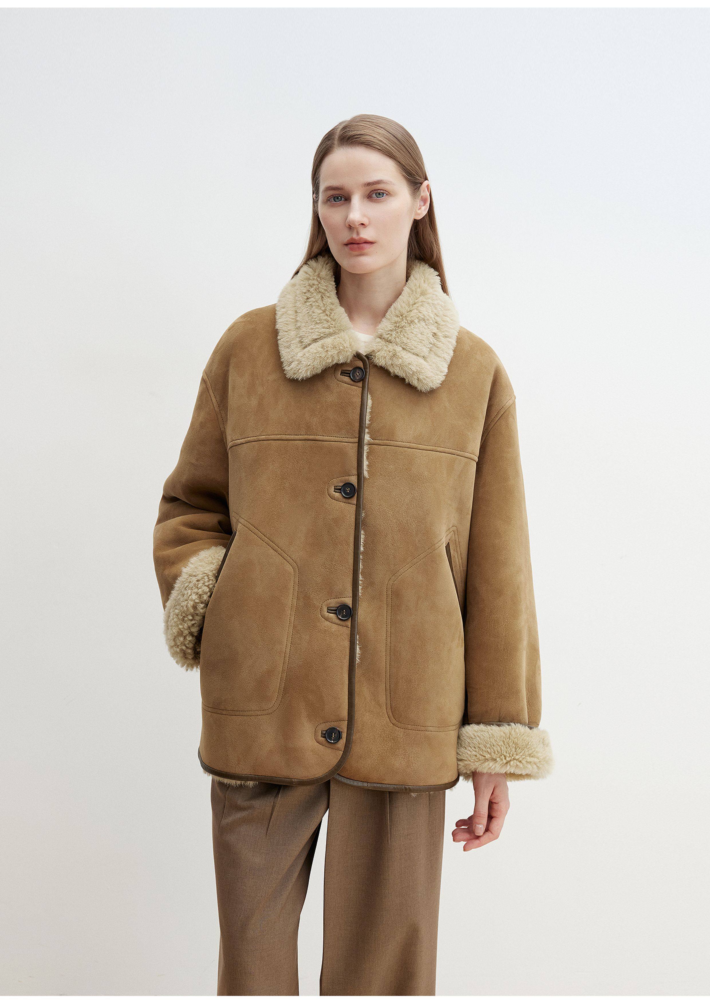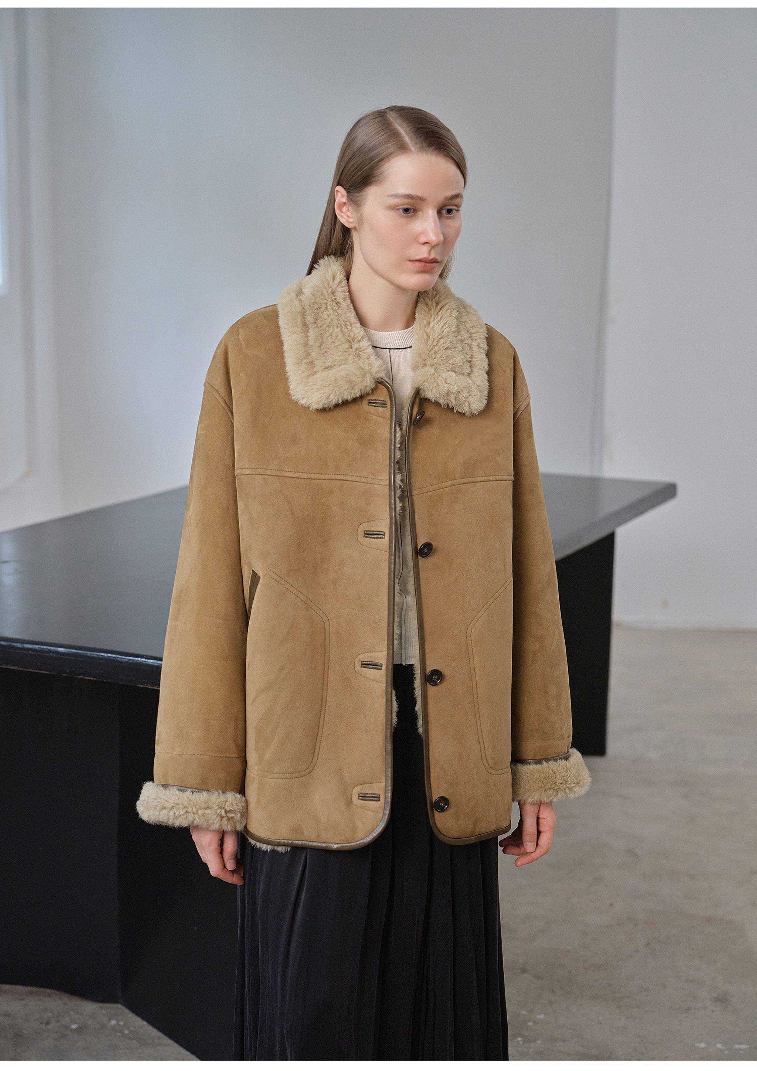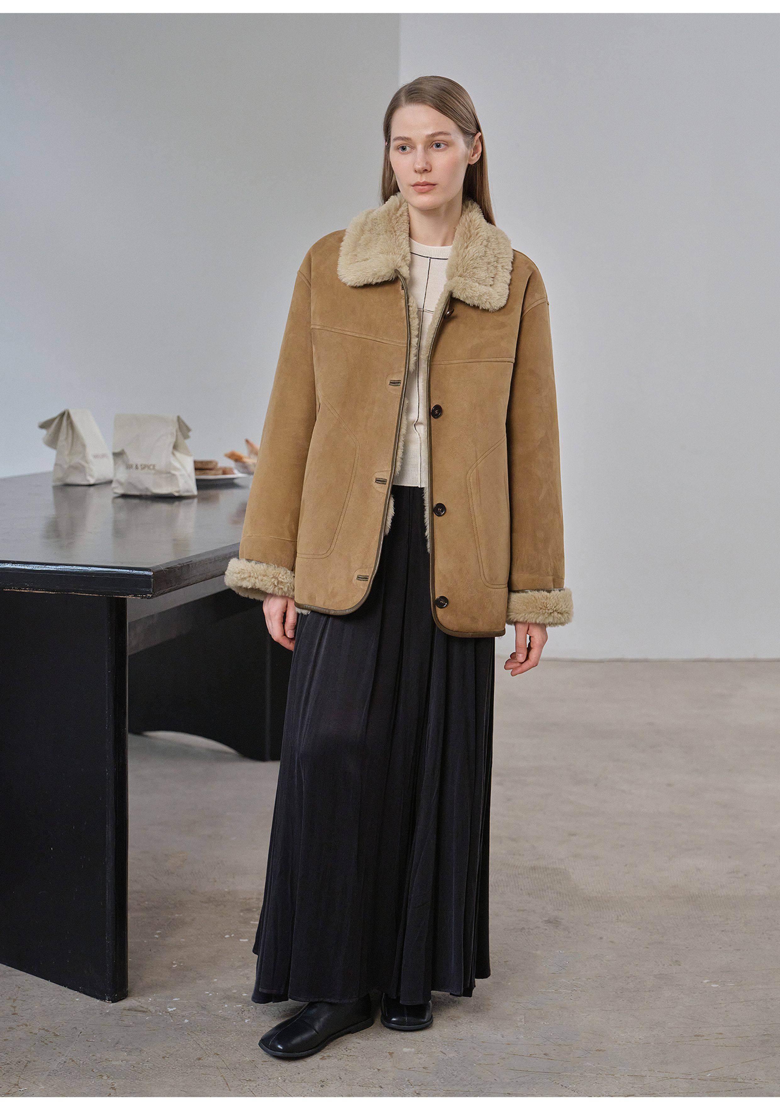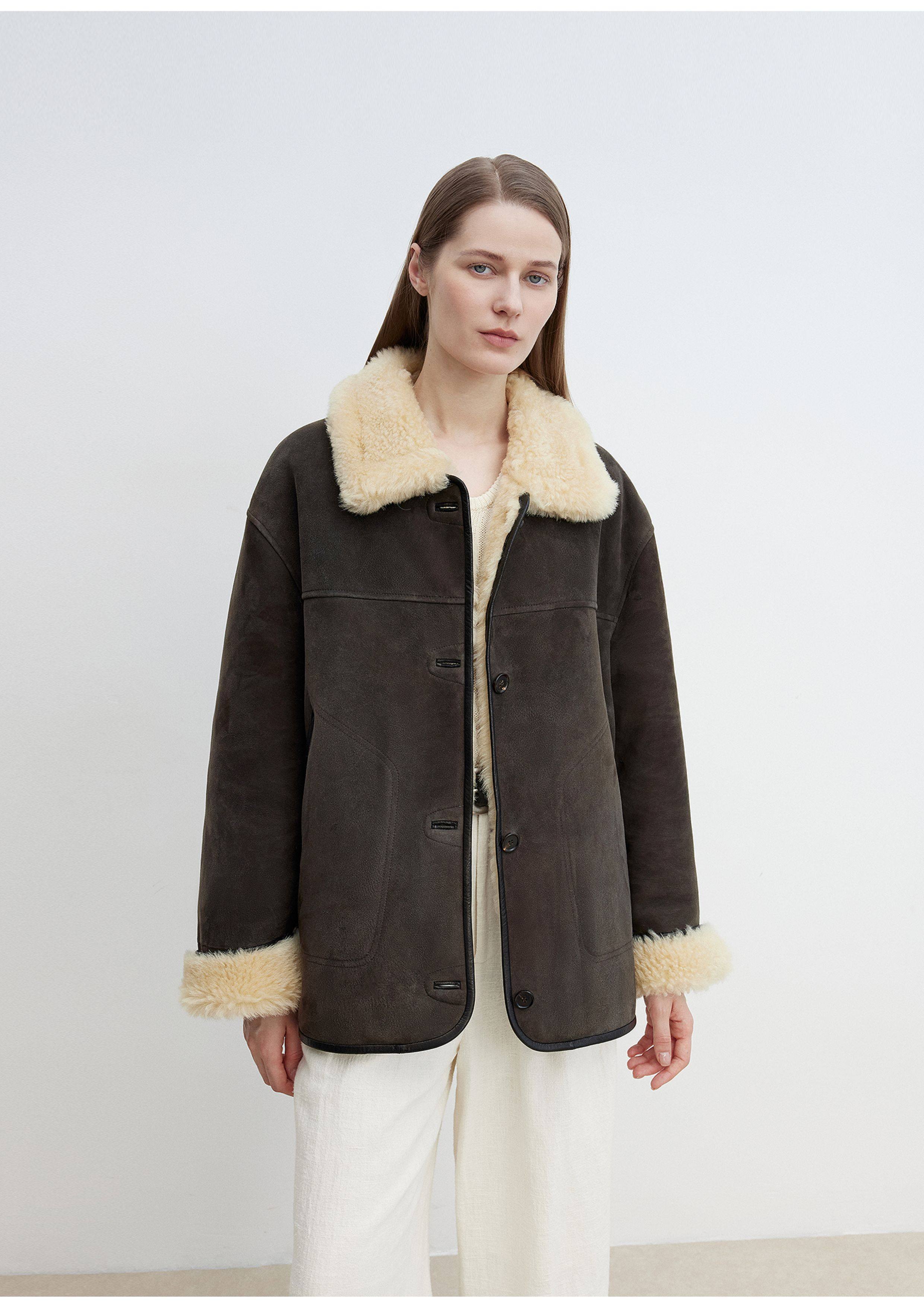 Yuanyi Letrans Winter Coco Merino fur de una sola pieza versión contrastante chaqueta de piel de gamuza mirando hacia afuera