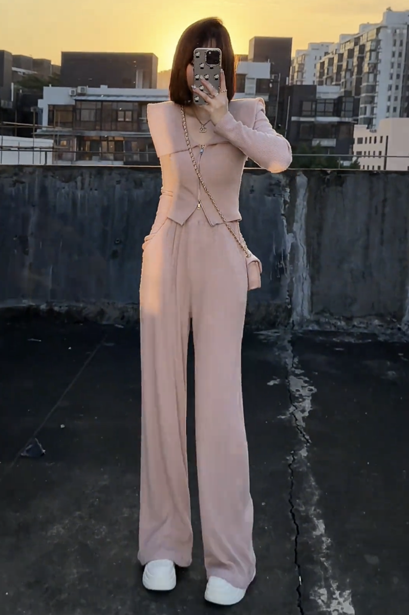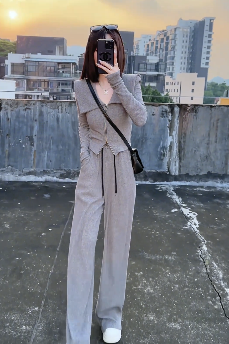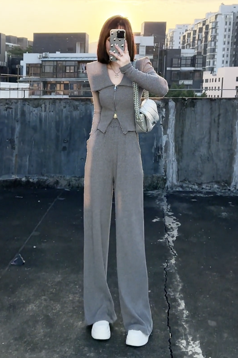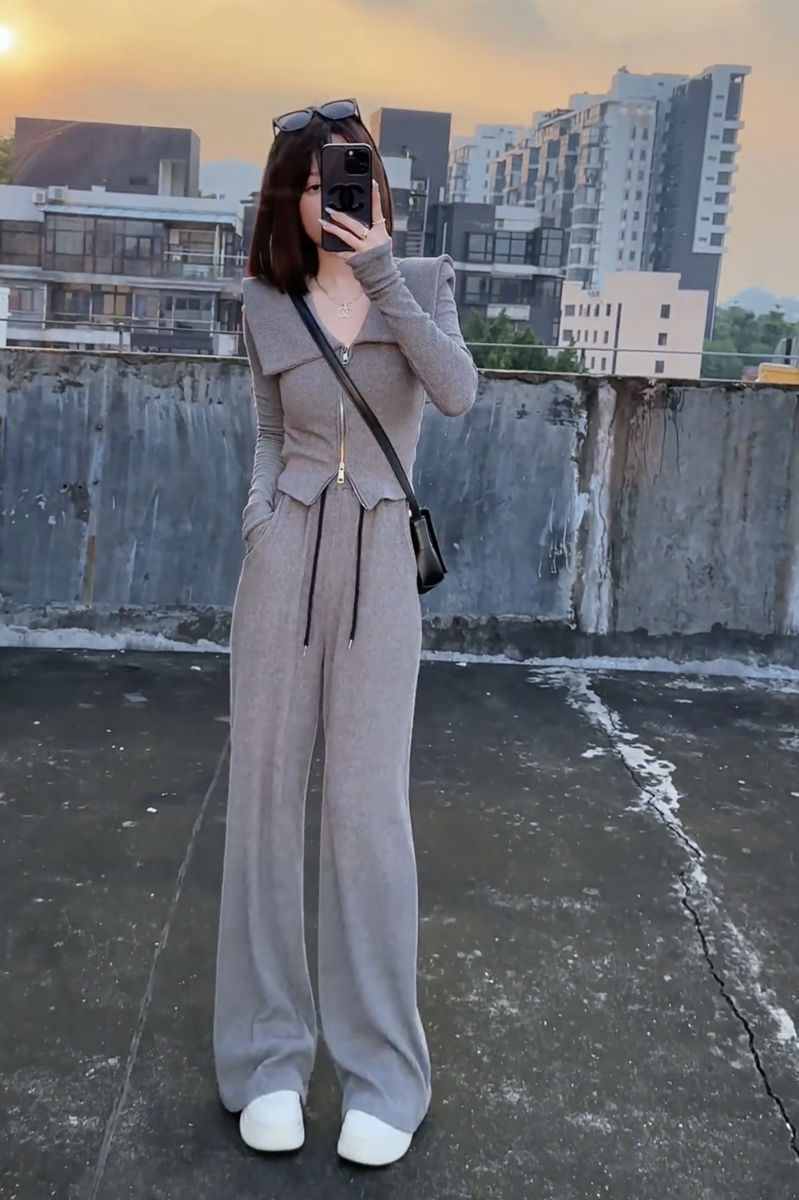 2025 neuer Herbst-Freizeitanzug für Damen, stilvolles kurzes Oberteil und zweiteiliges Set mit gerader, weit geschnittener Hose mit hoher Taille