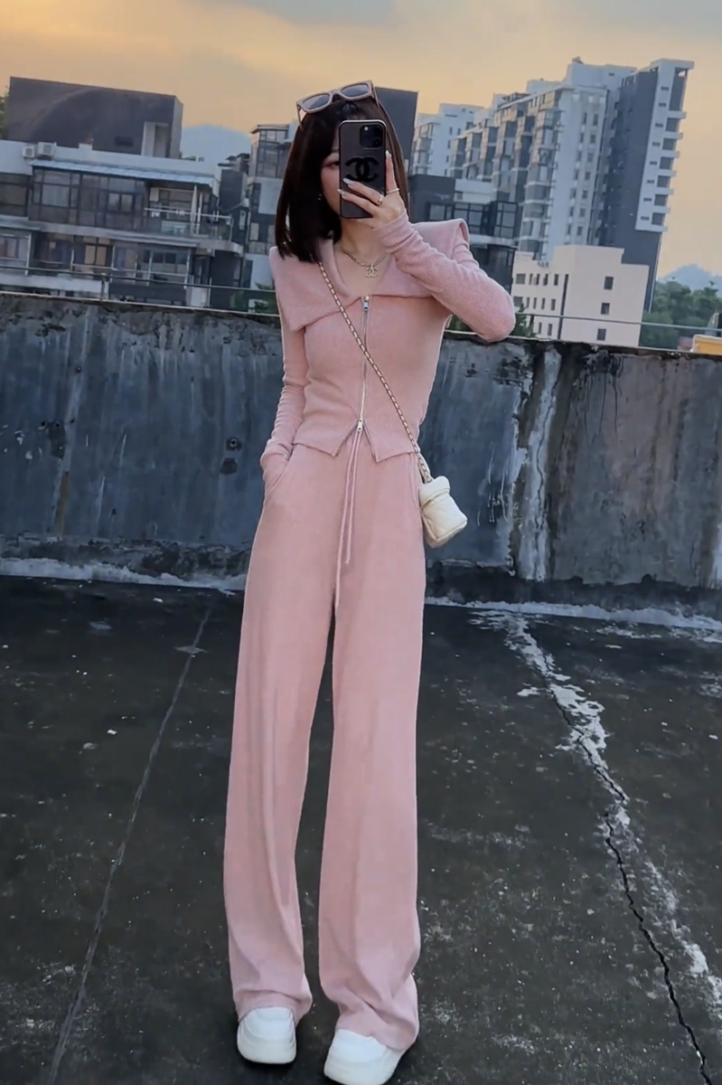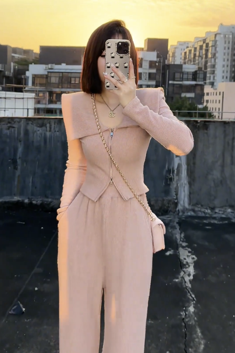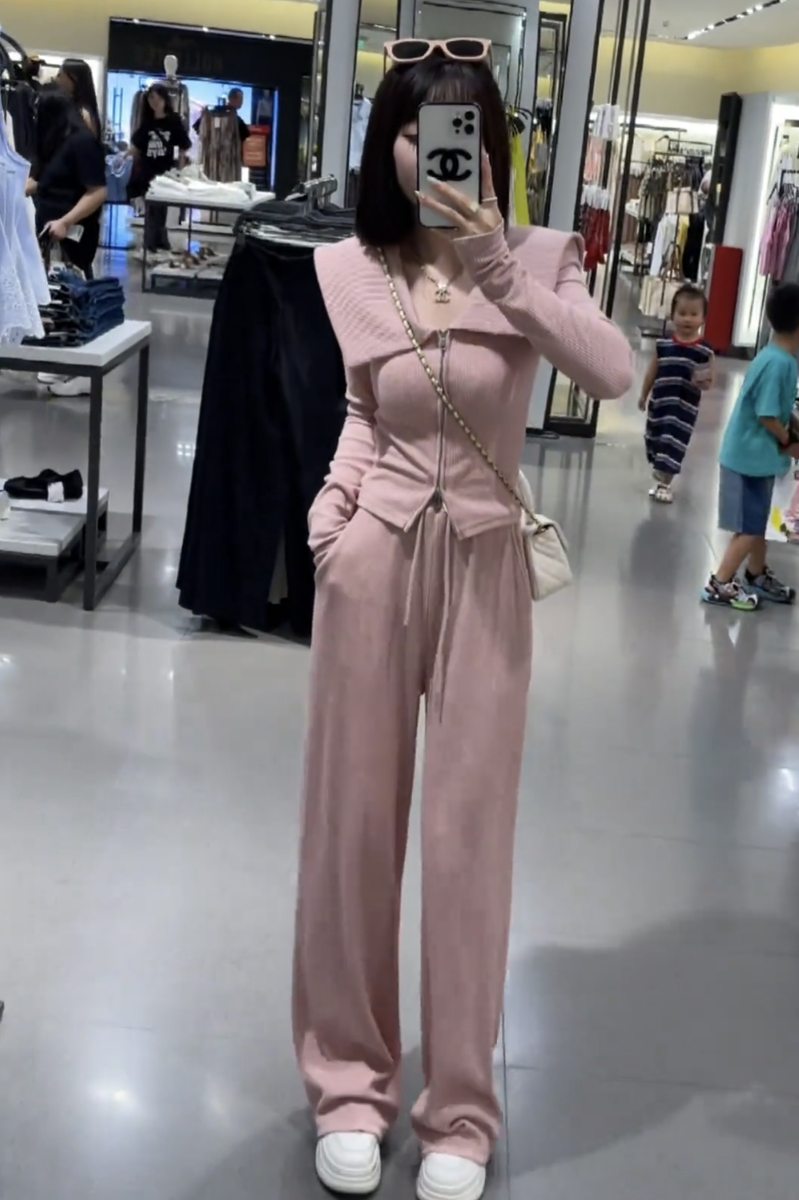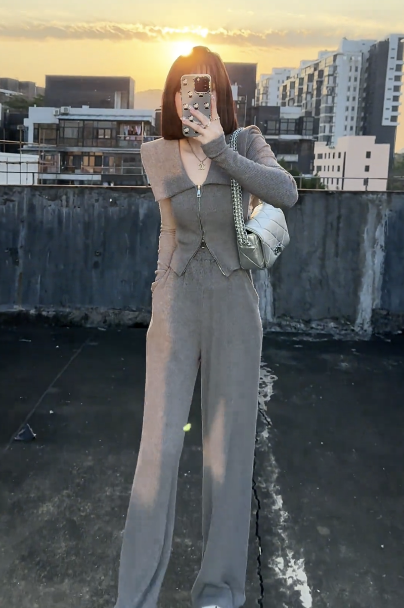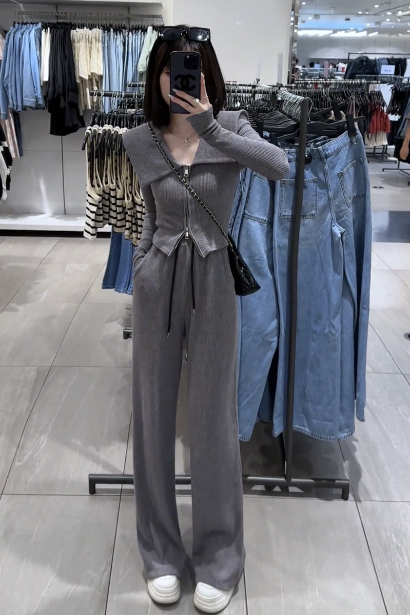 2025 neuer Herbst-Freizeitanzug für Damen, stilvolles kurzes Oberteil und zweiteiliges Set mit gerader, weit geschnittener Hose mit hoher Taille
