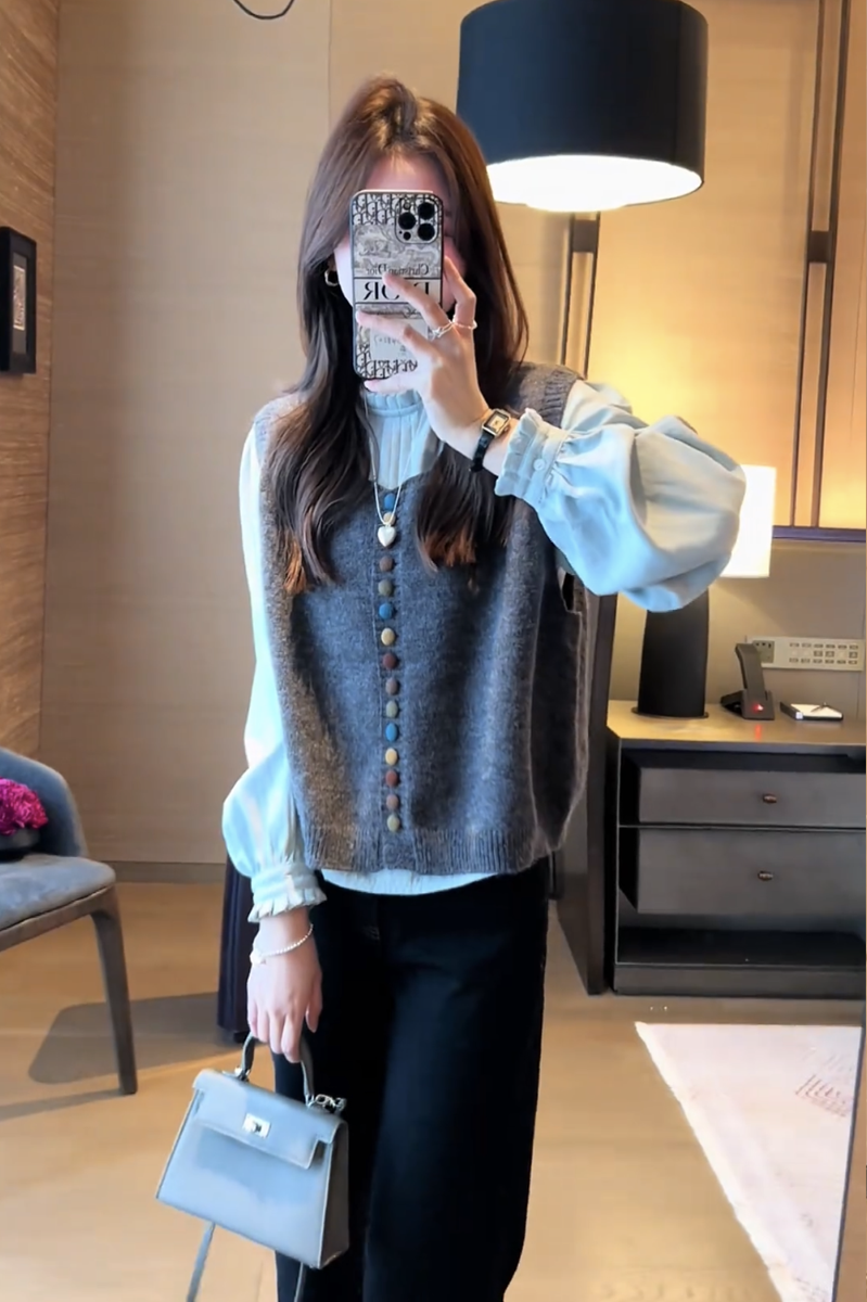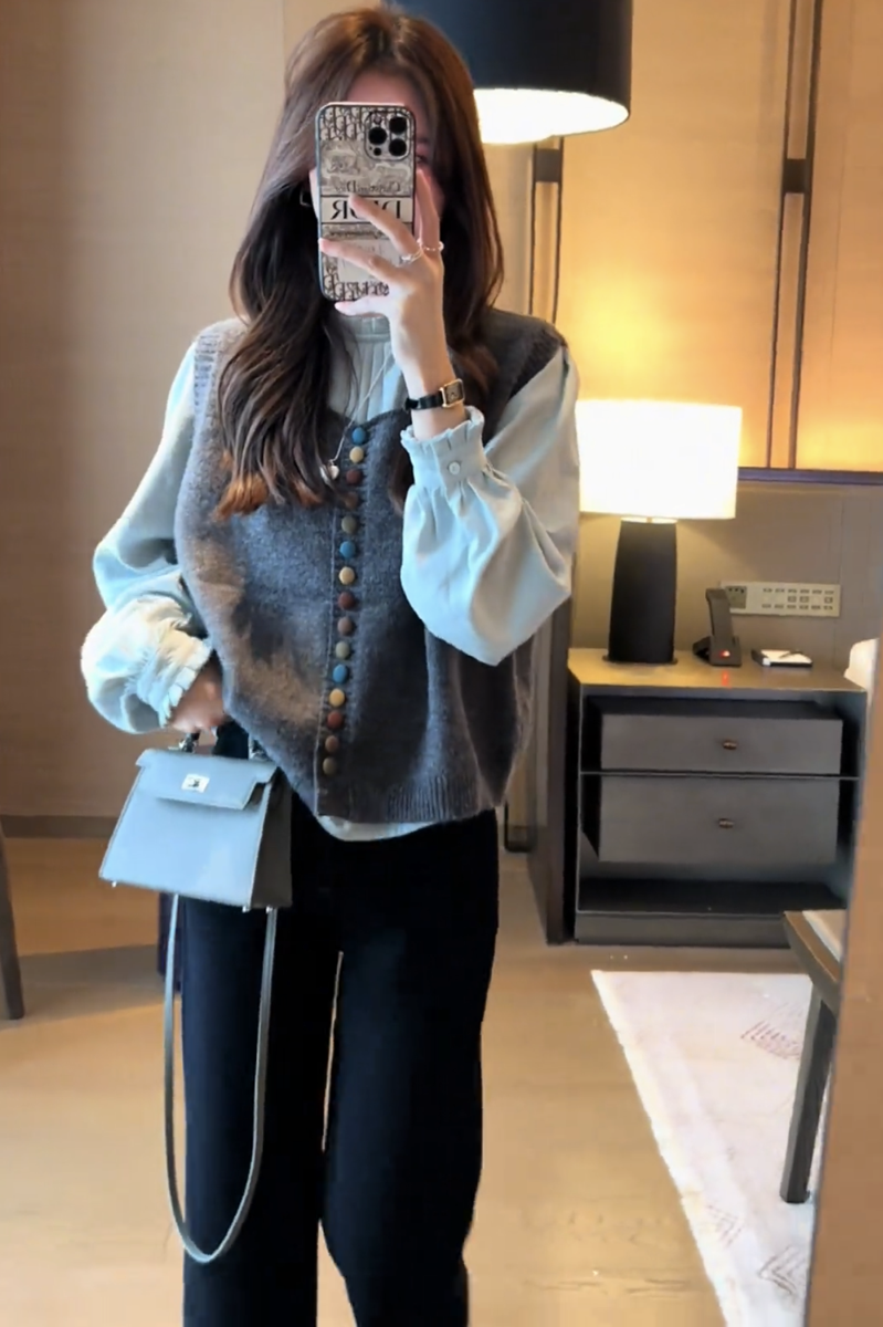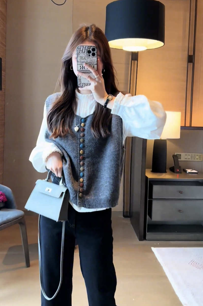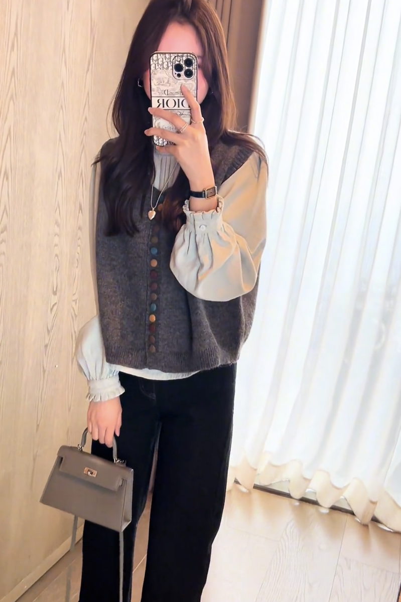 2025 nuevo diseño de otoño para mujer, chaleco tipo suéter ceroso suave, mangas abullonadas versátiles, traje de camisa interior