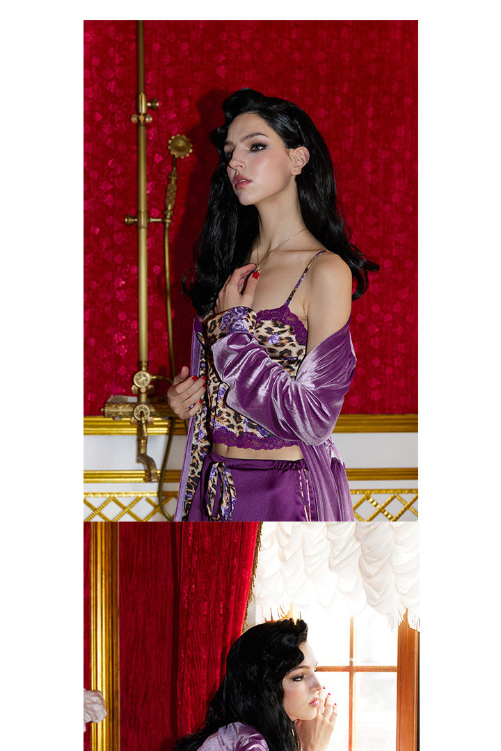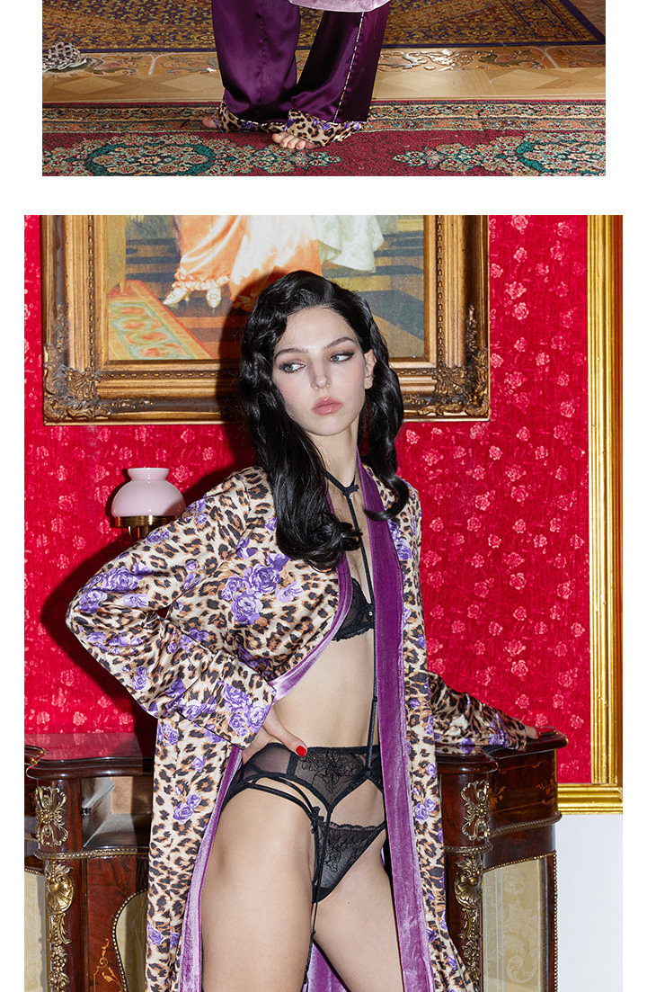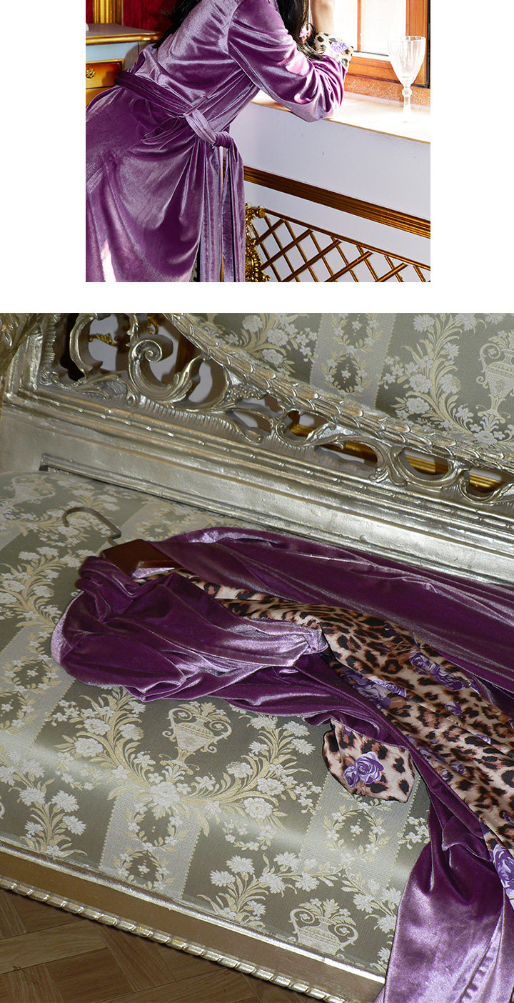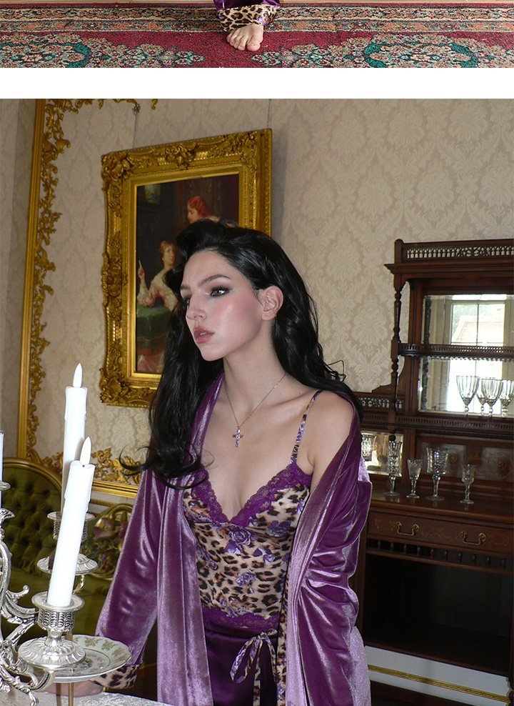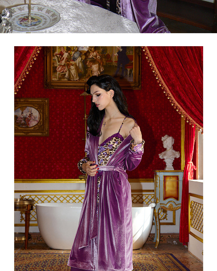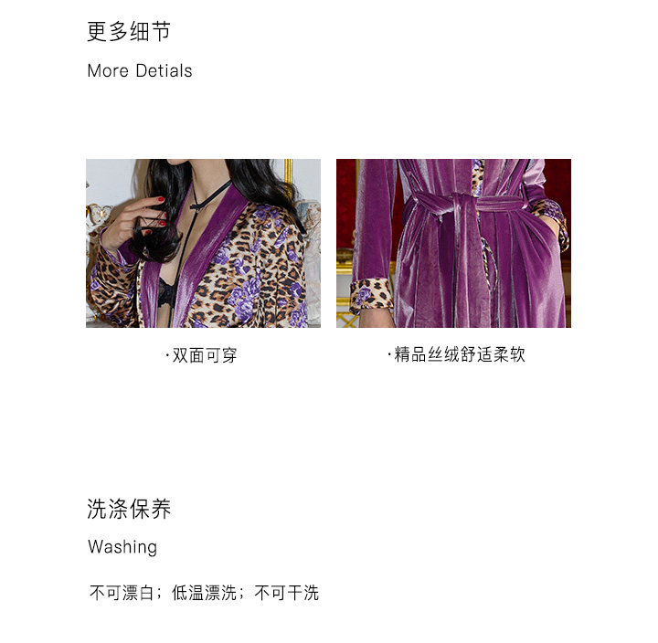 Yesshedoes Purple Velvet Leopard Print Double-Sided Long Robe Sleepwear Morning Gown Autumn Home Wear