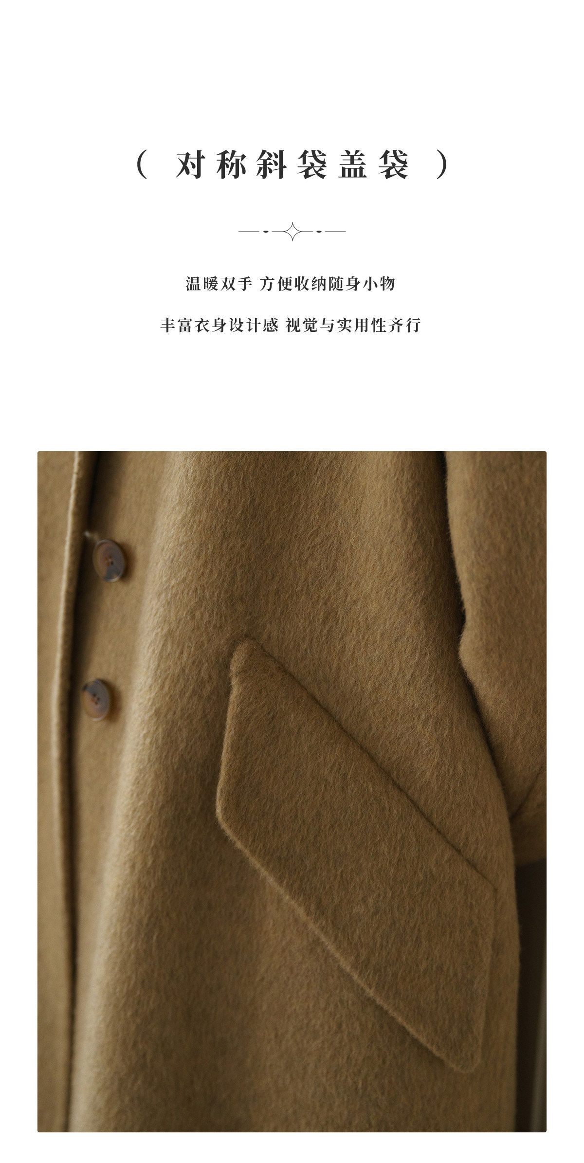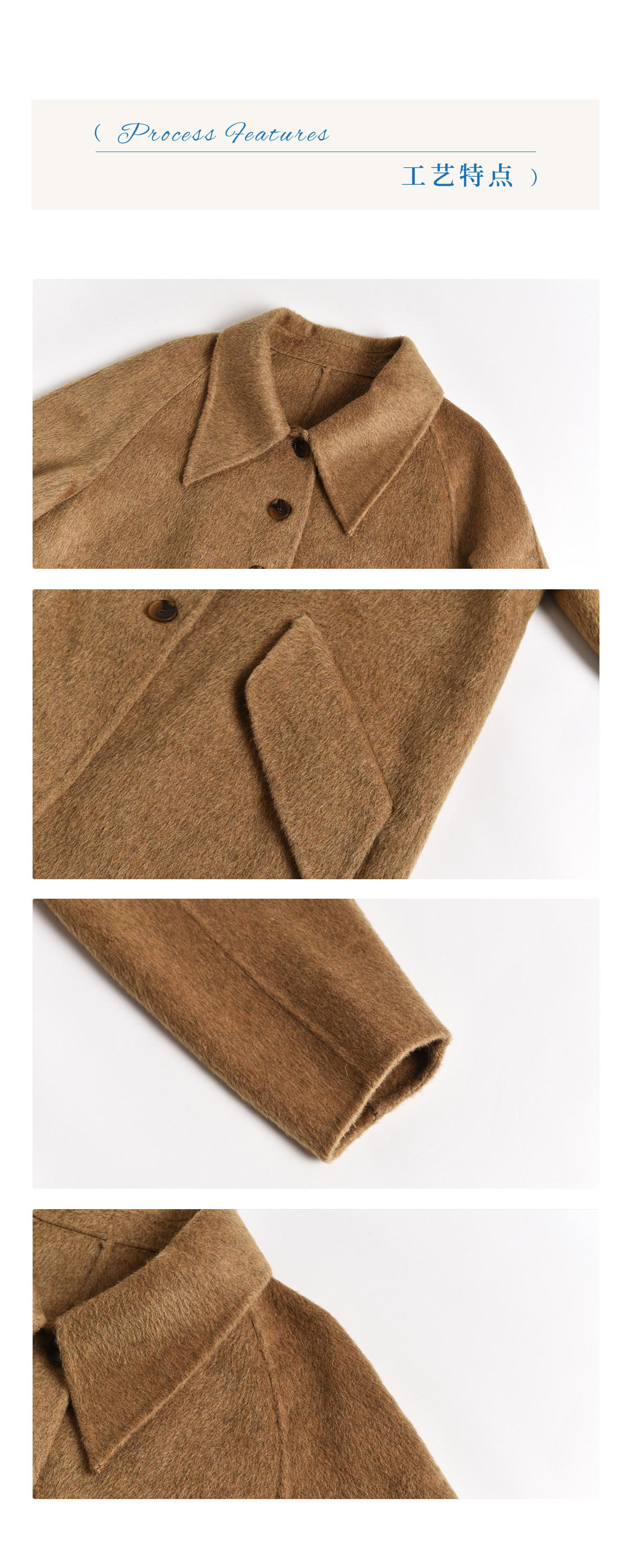 Materialzusammensetzung Schafwolle 89,8 %, Maulbeerseide 5,8 %, Yak-Kaschmir 2,2 %, andere Materialien 2,2 %