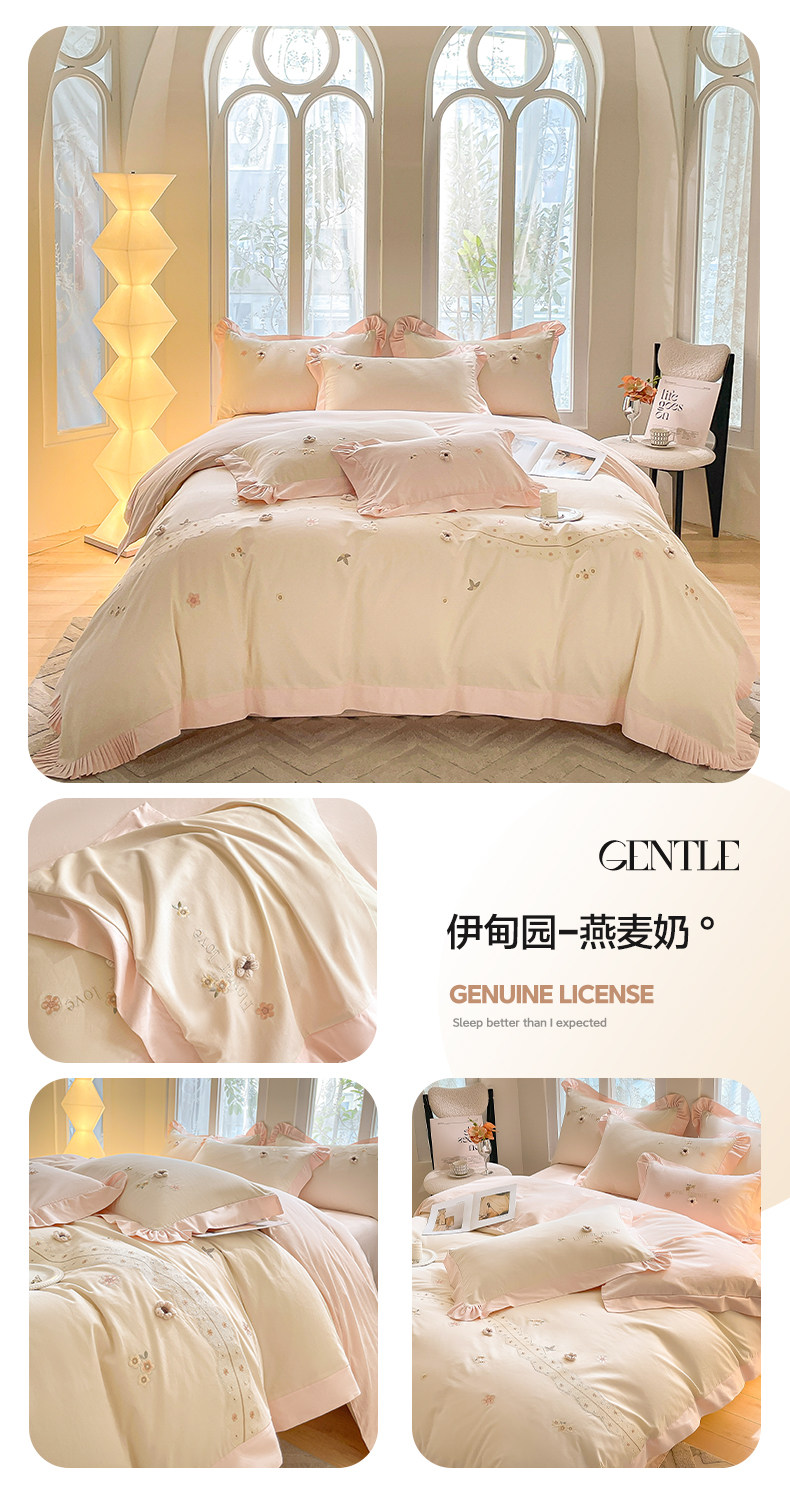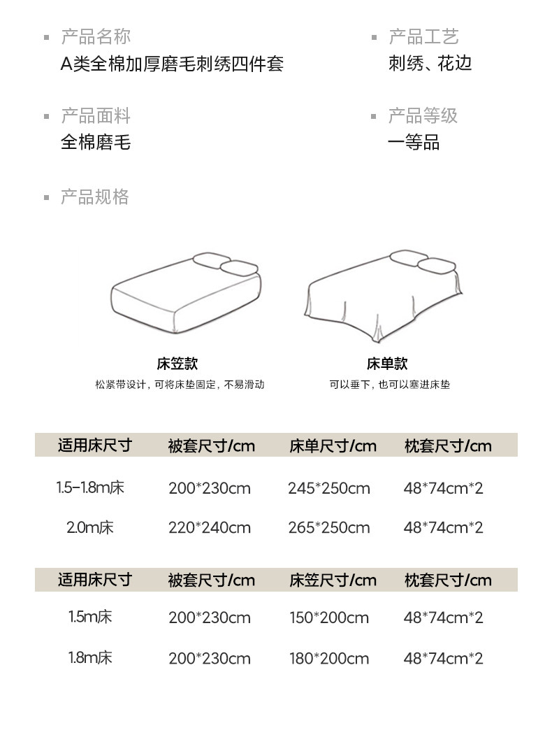 适用床尺寸 1.5床单款四件套【被套200x230】,1.8床单款四件套【被套200x230】,2.0床单款四件套【被套220x240】,1.5床笠款四件套【被套200x230】,1.8床笠款四件套【被套200x230】