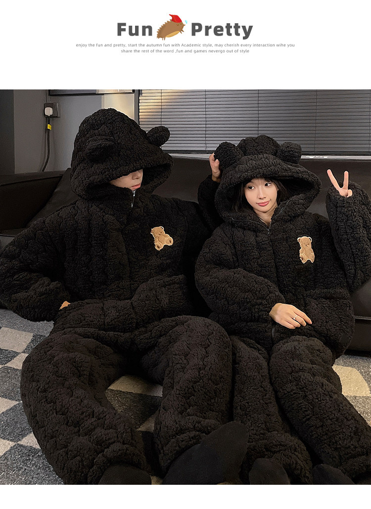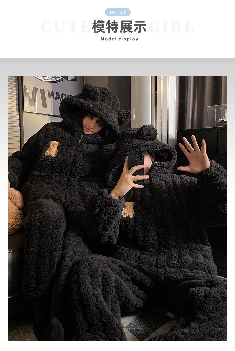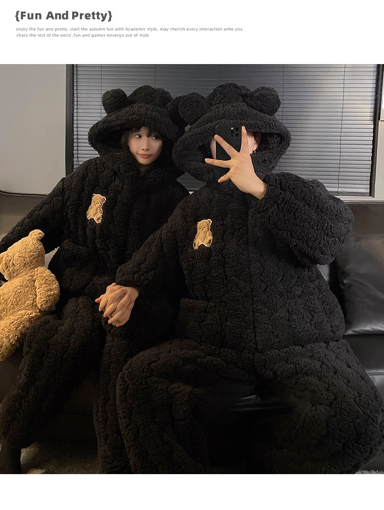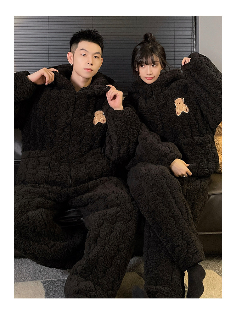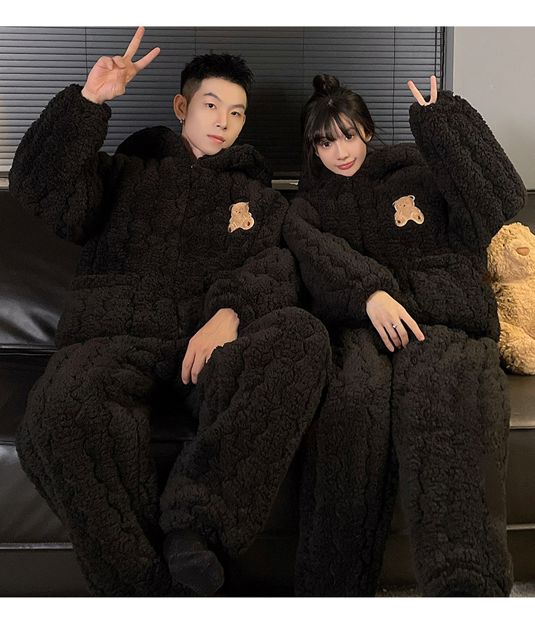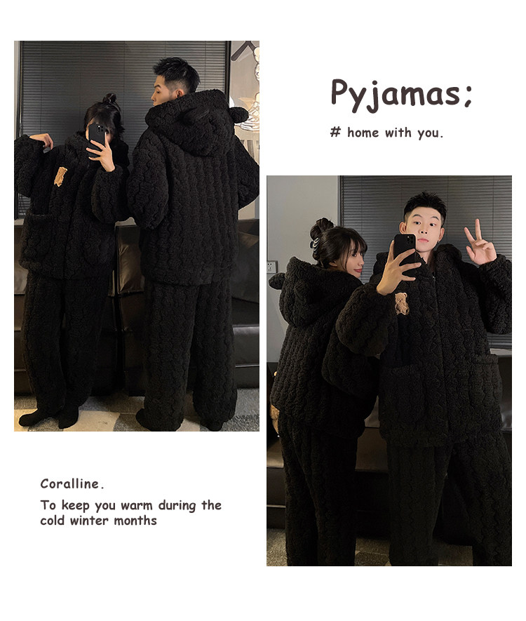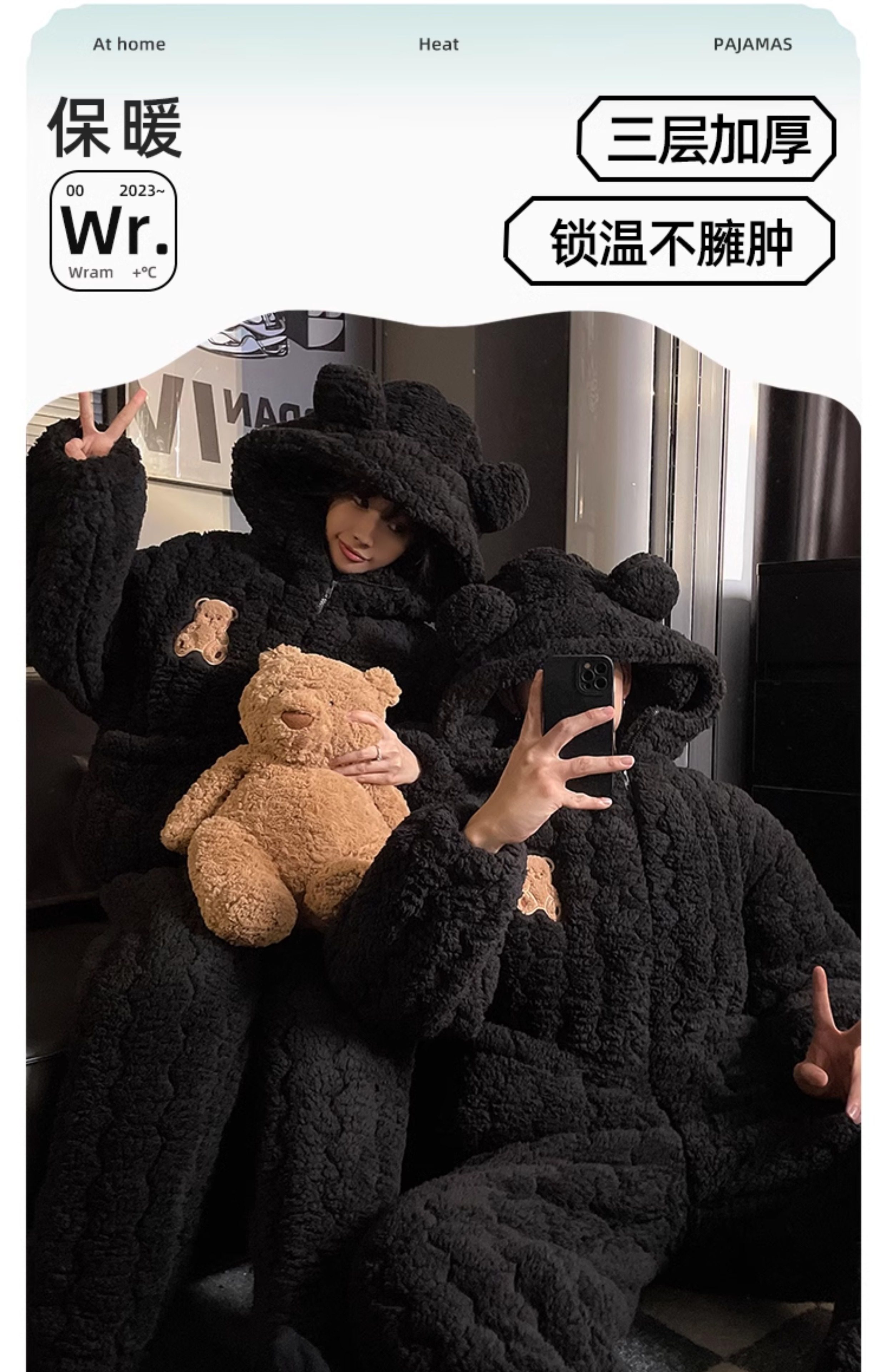 Couple's Pajamas for Women, Autumn and Winter, Three-Layer Quilted Coral Fleece, Thickened and Warm, Men's Hooded Loungewear Set for Winter