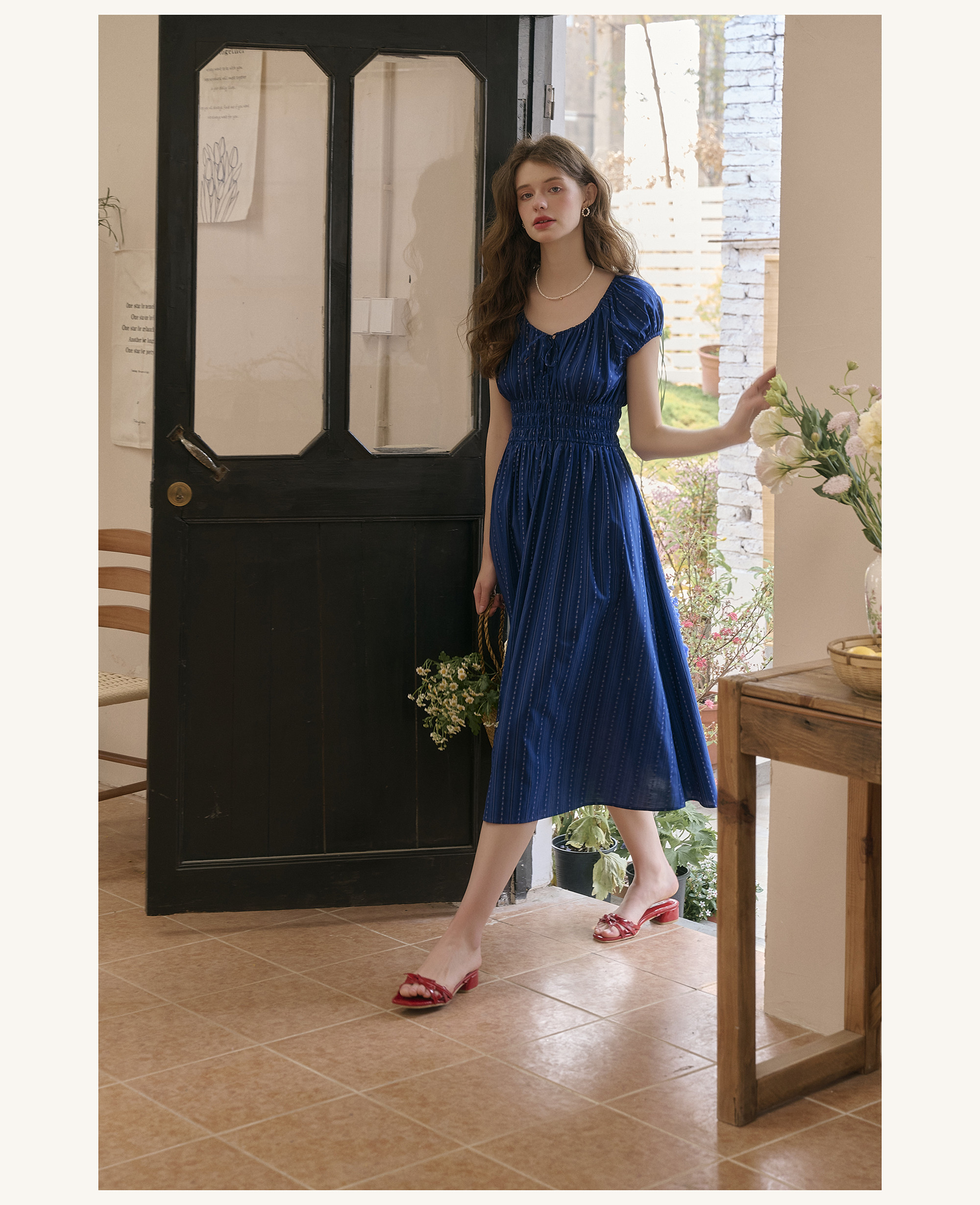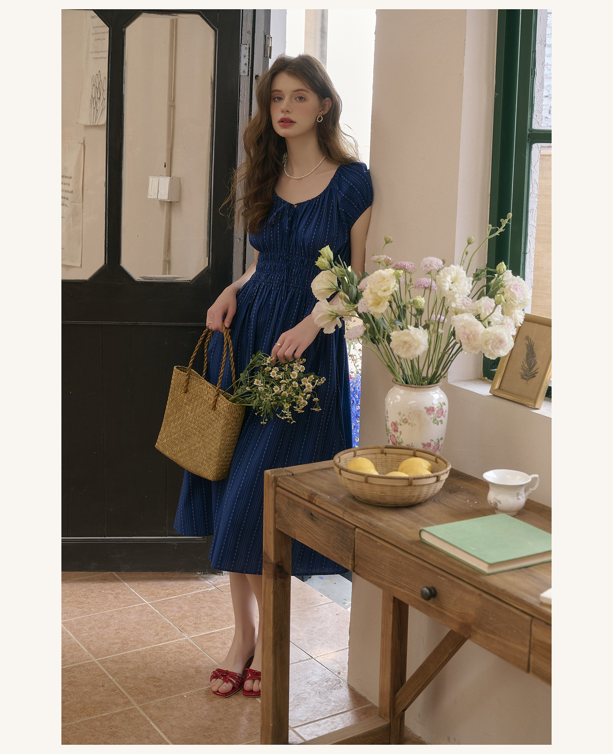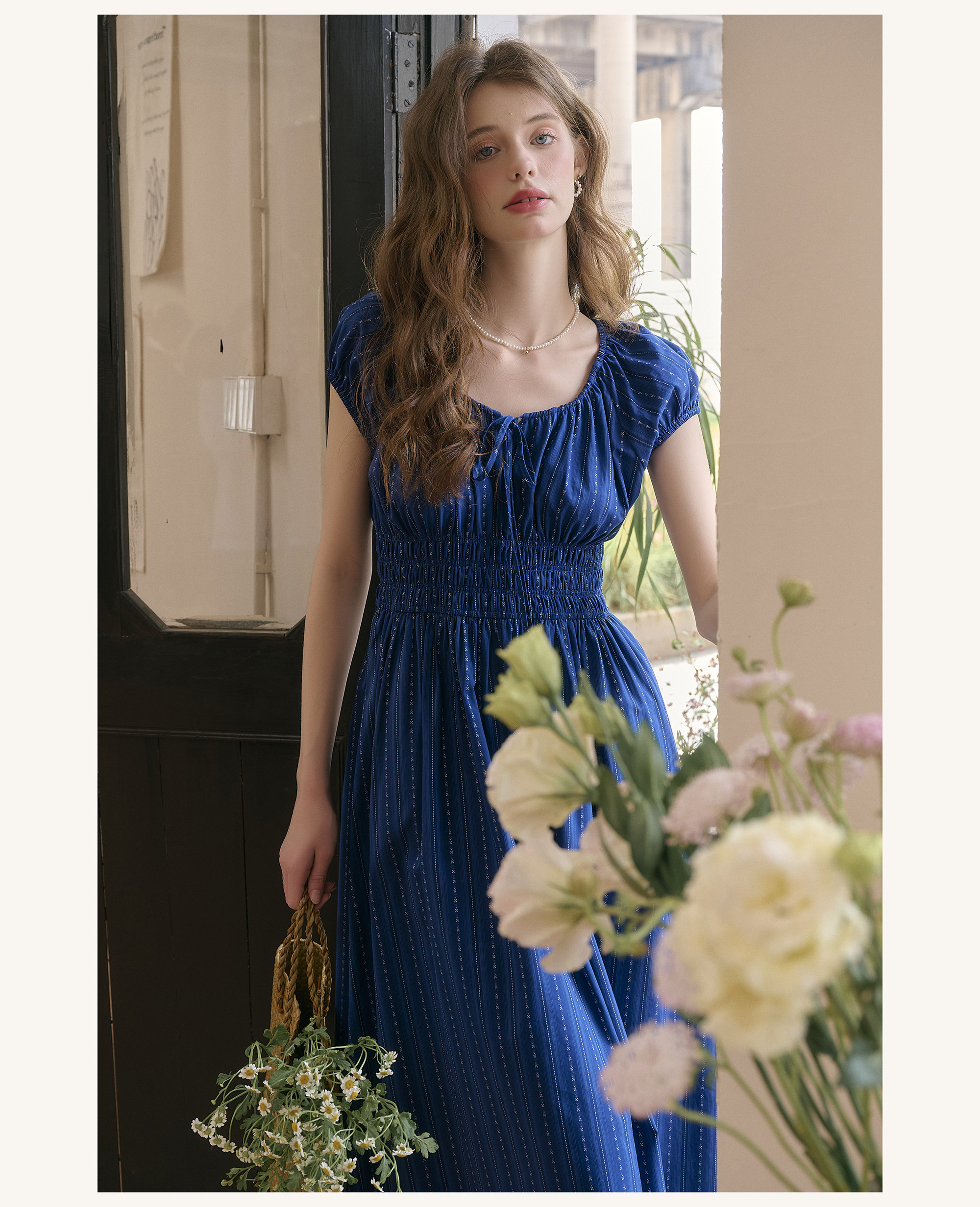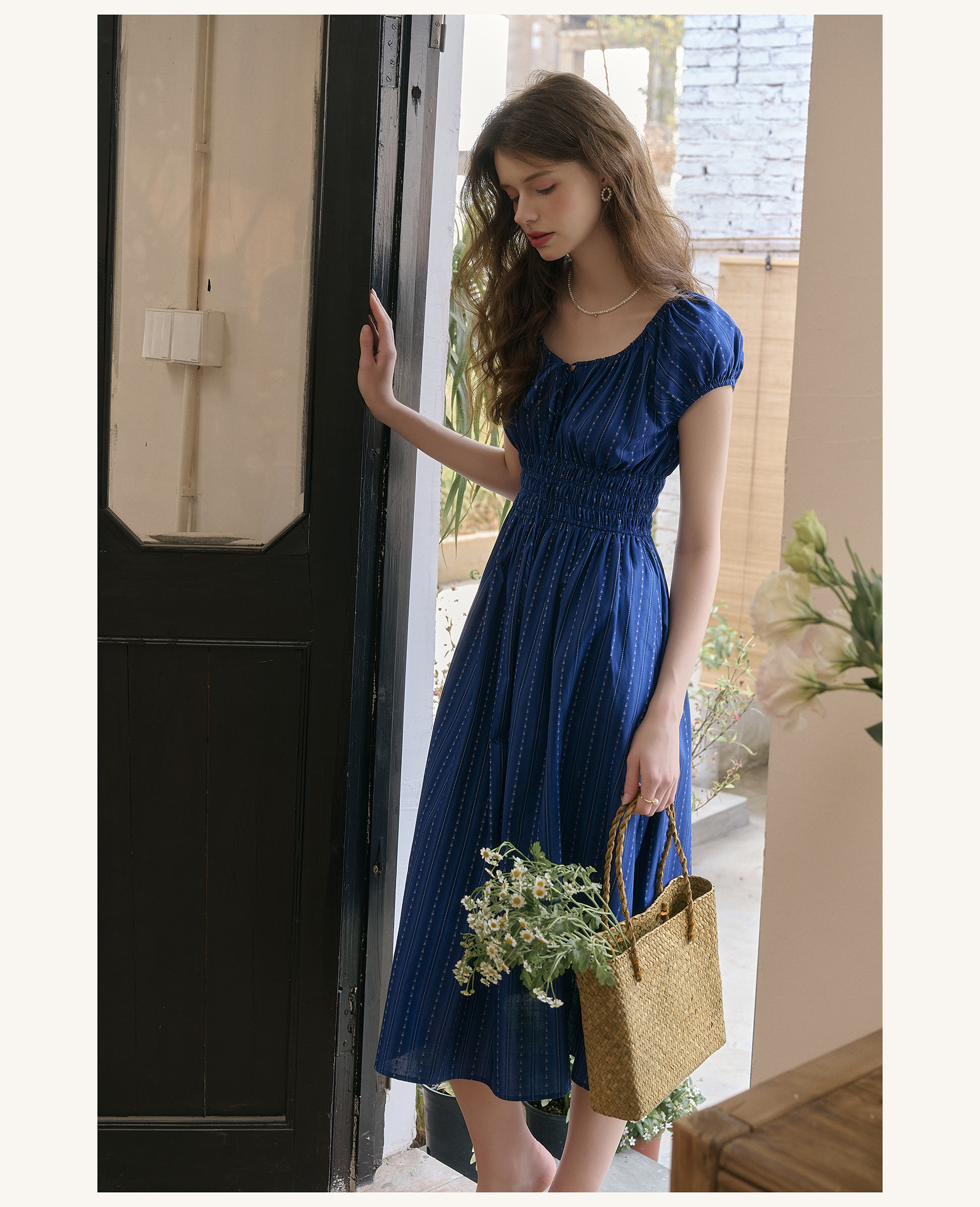 SimpleRetro Kleid mit verstellbarem Ausschnitt und Puffärmeln, französischer Taillenrock, blauer, schlankmachender langer Rock