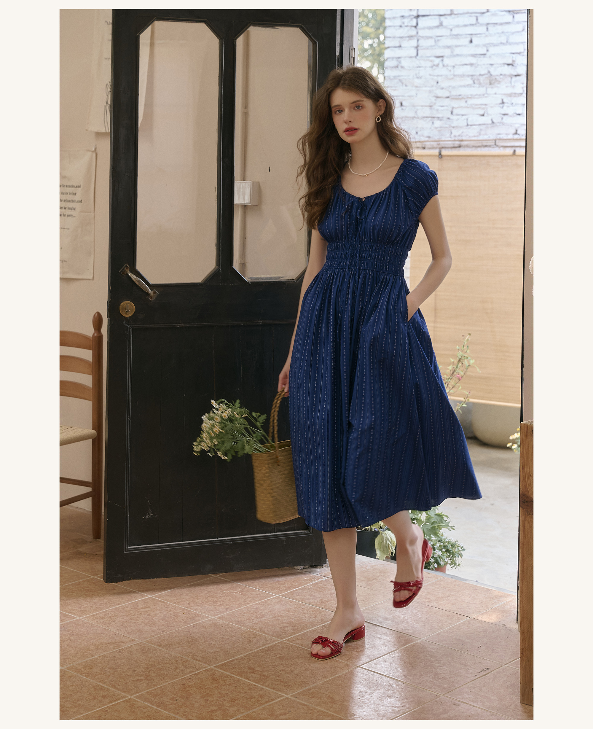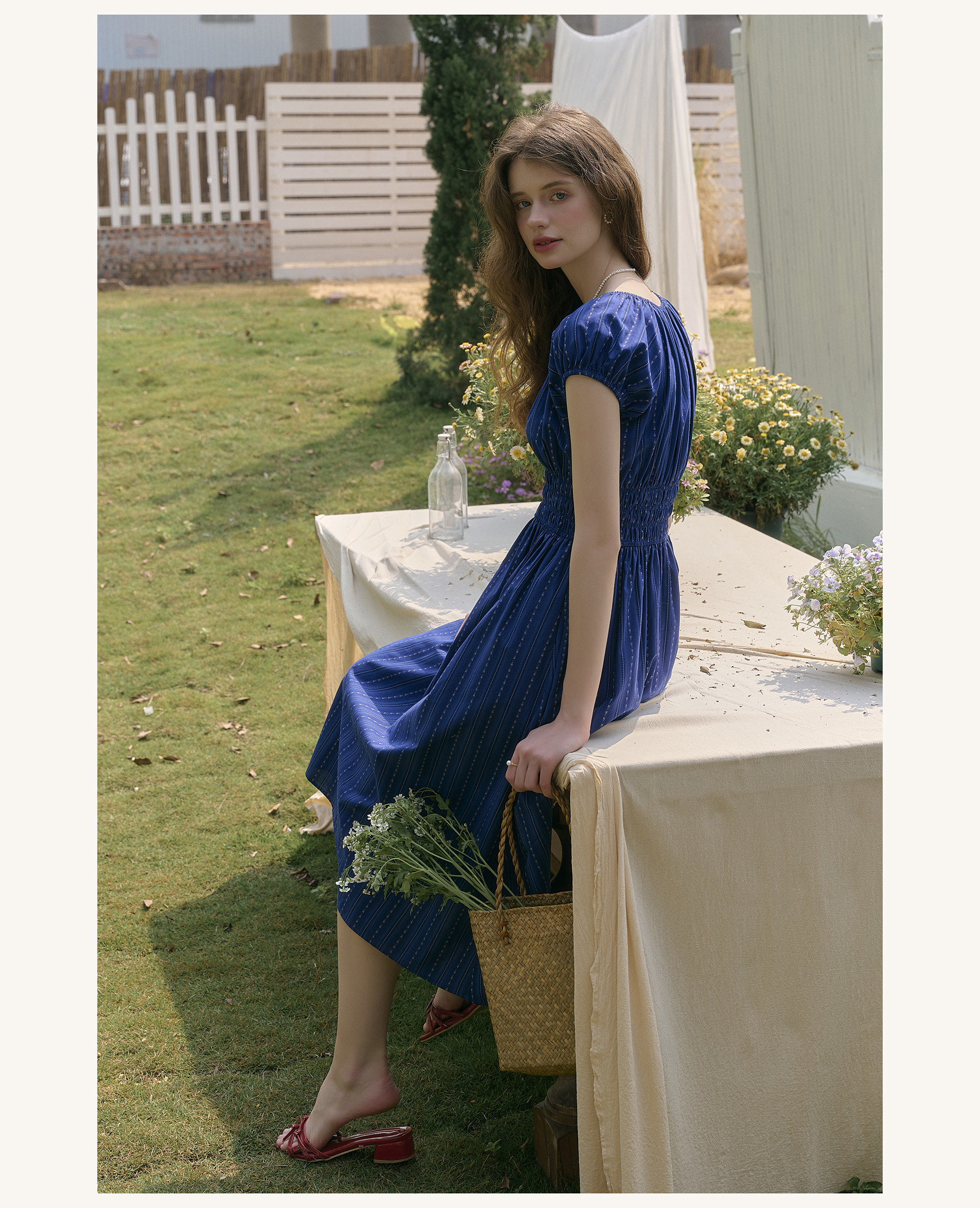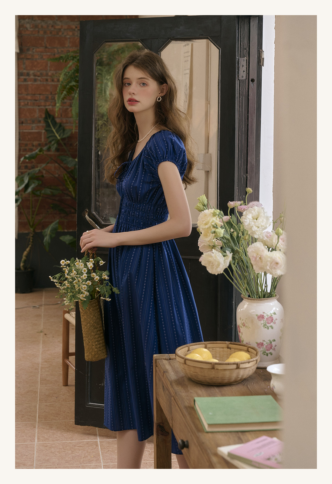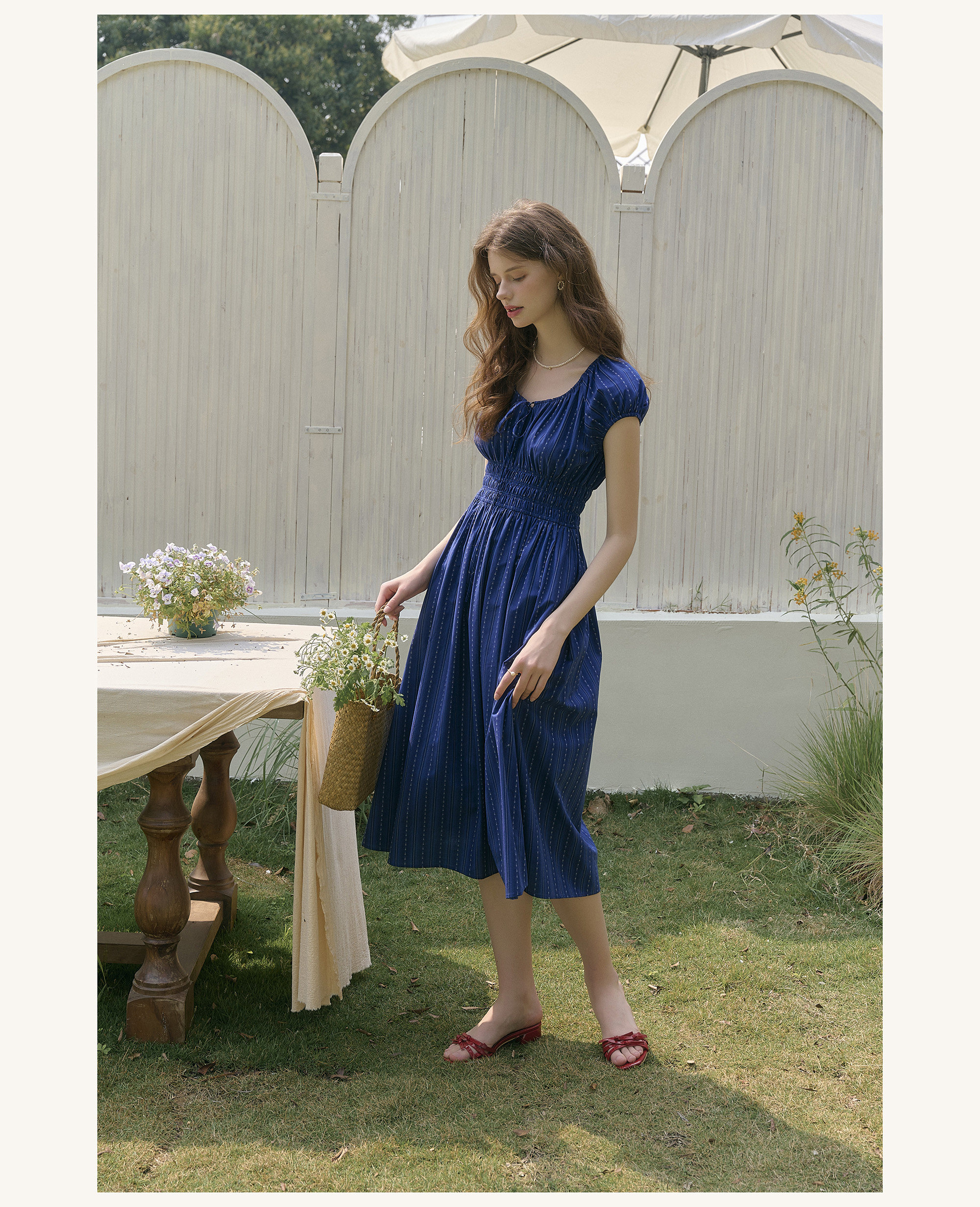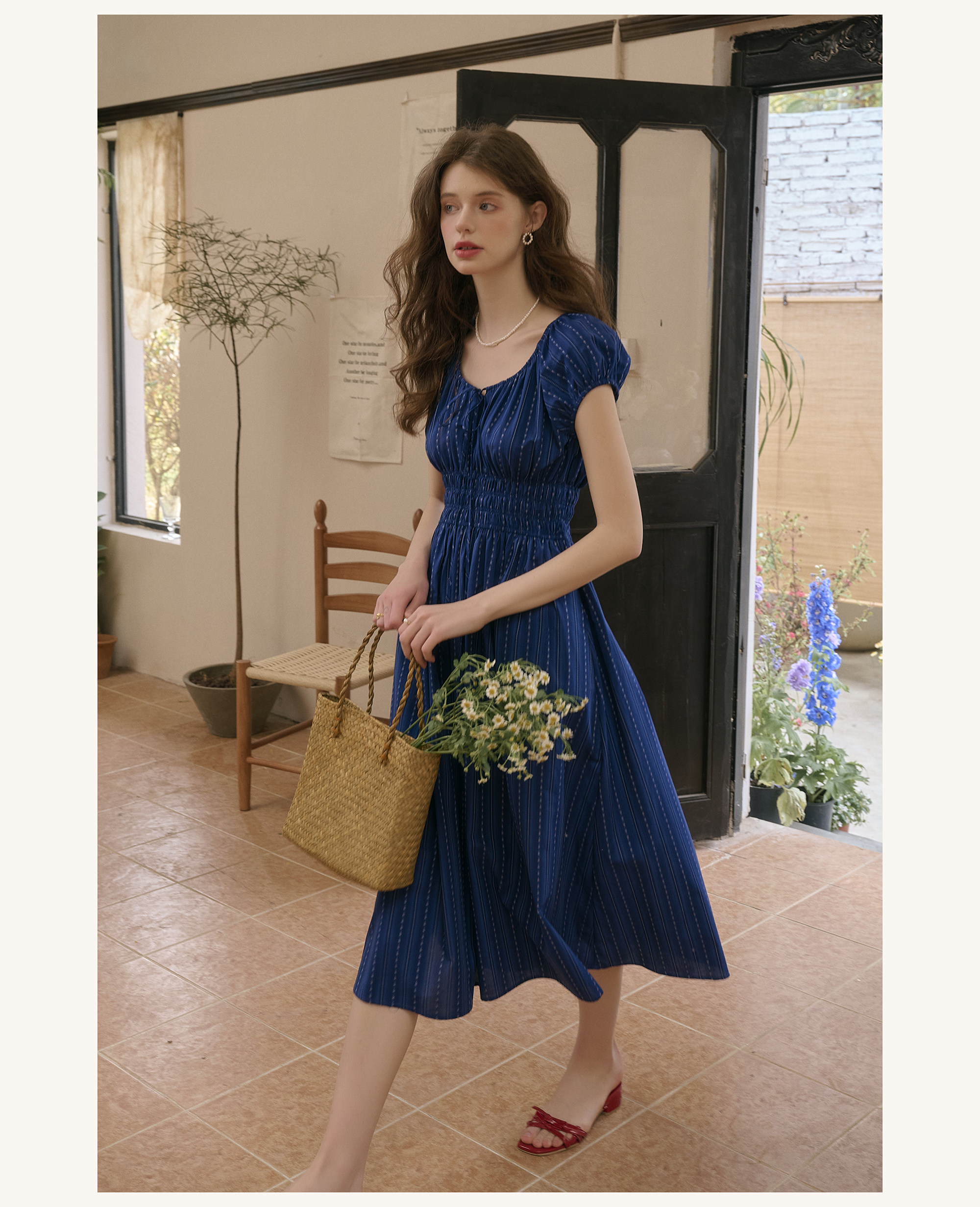 SimpleRetro Kleid mit verstellbarem Ausschnitt und Puffärmeln, französischer Taillenrock, blauer, schlankmachender langer Rock