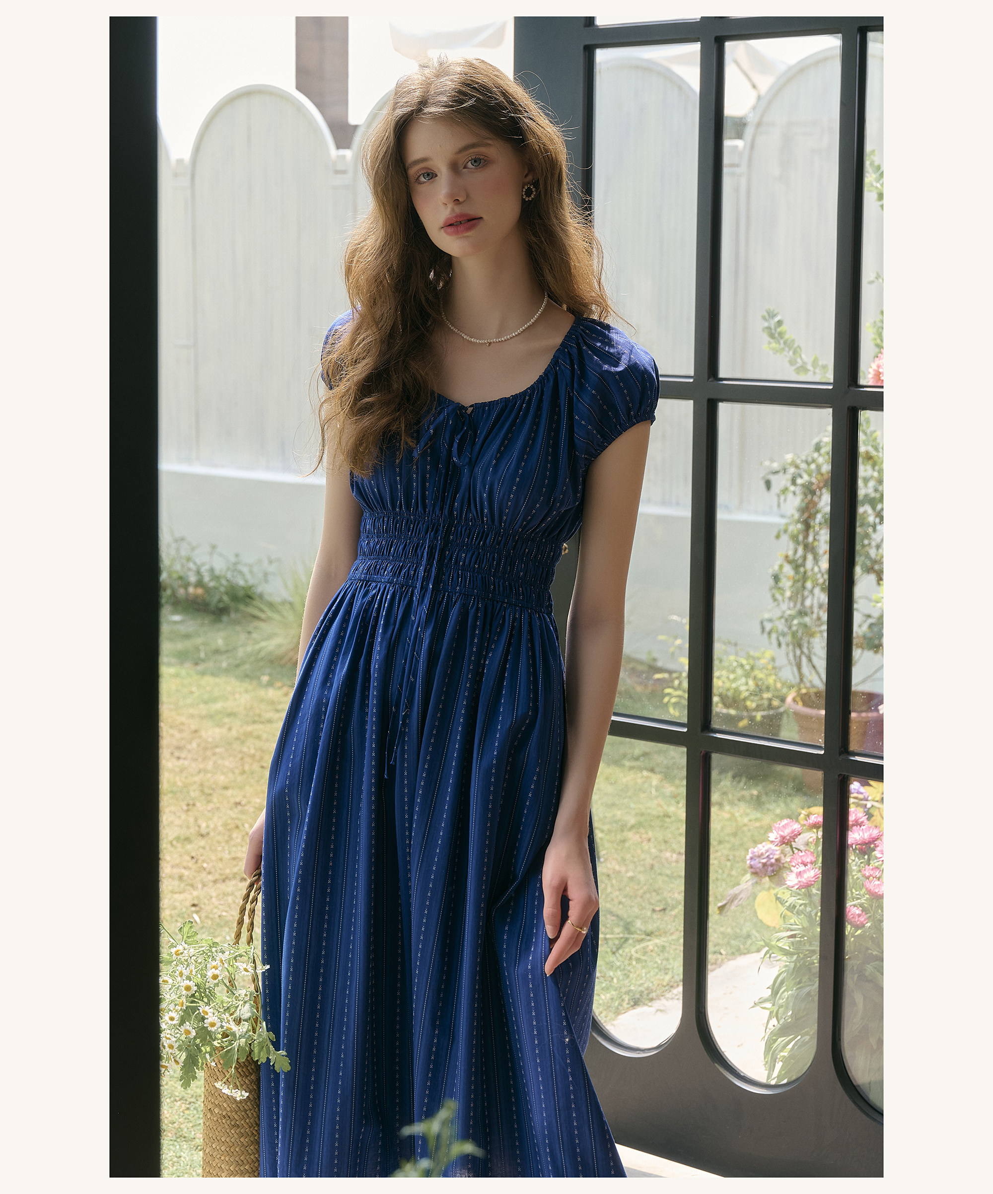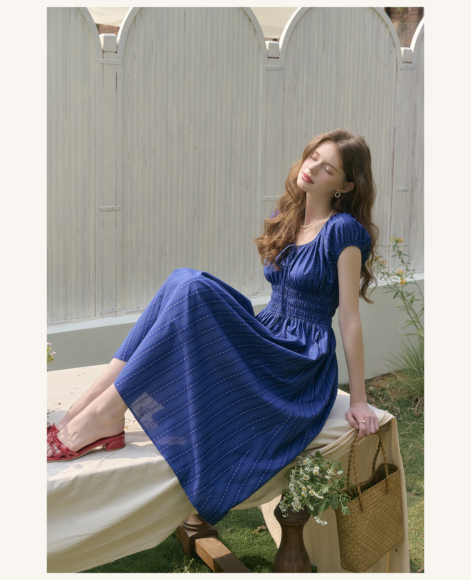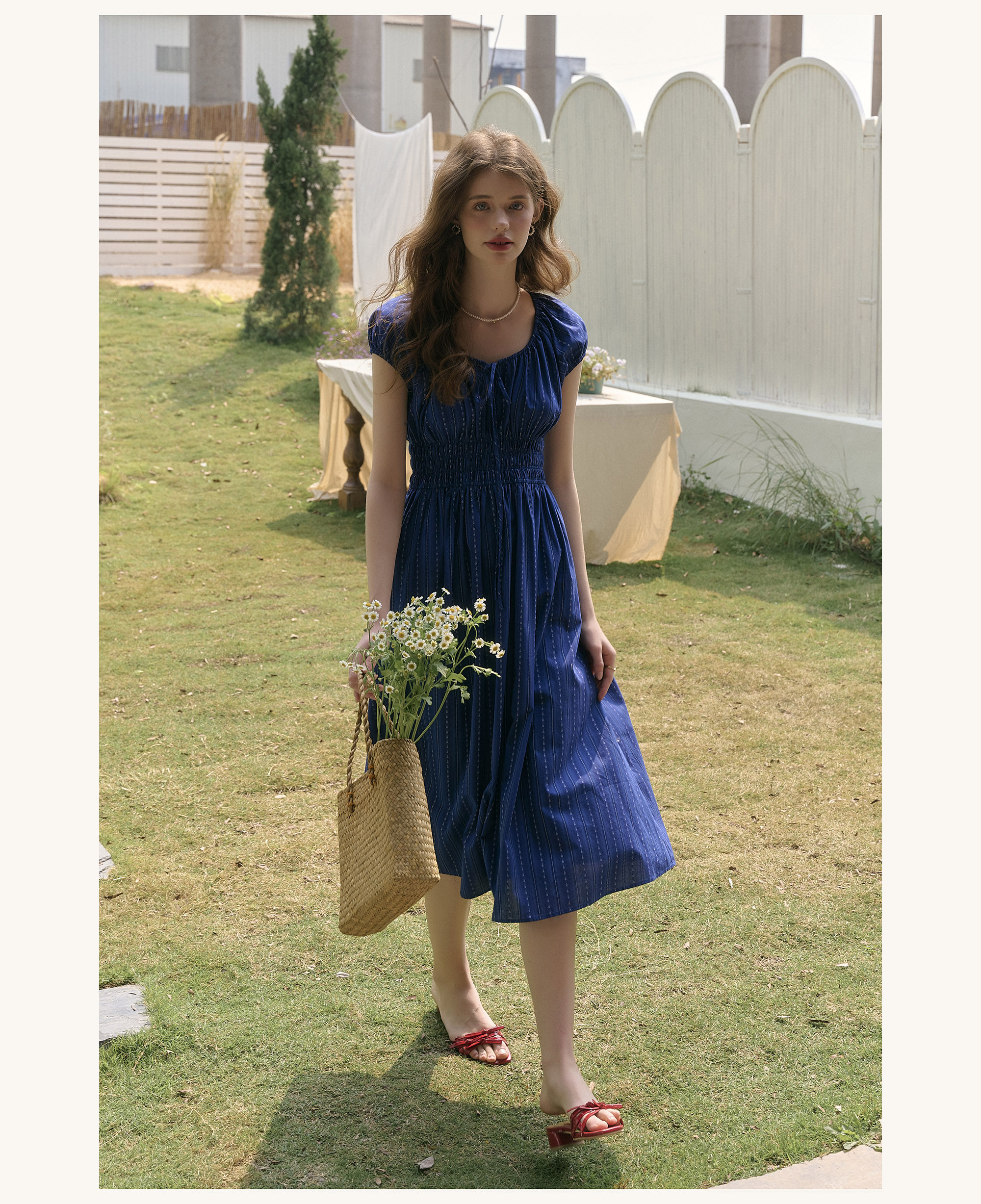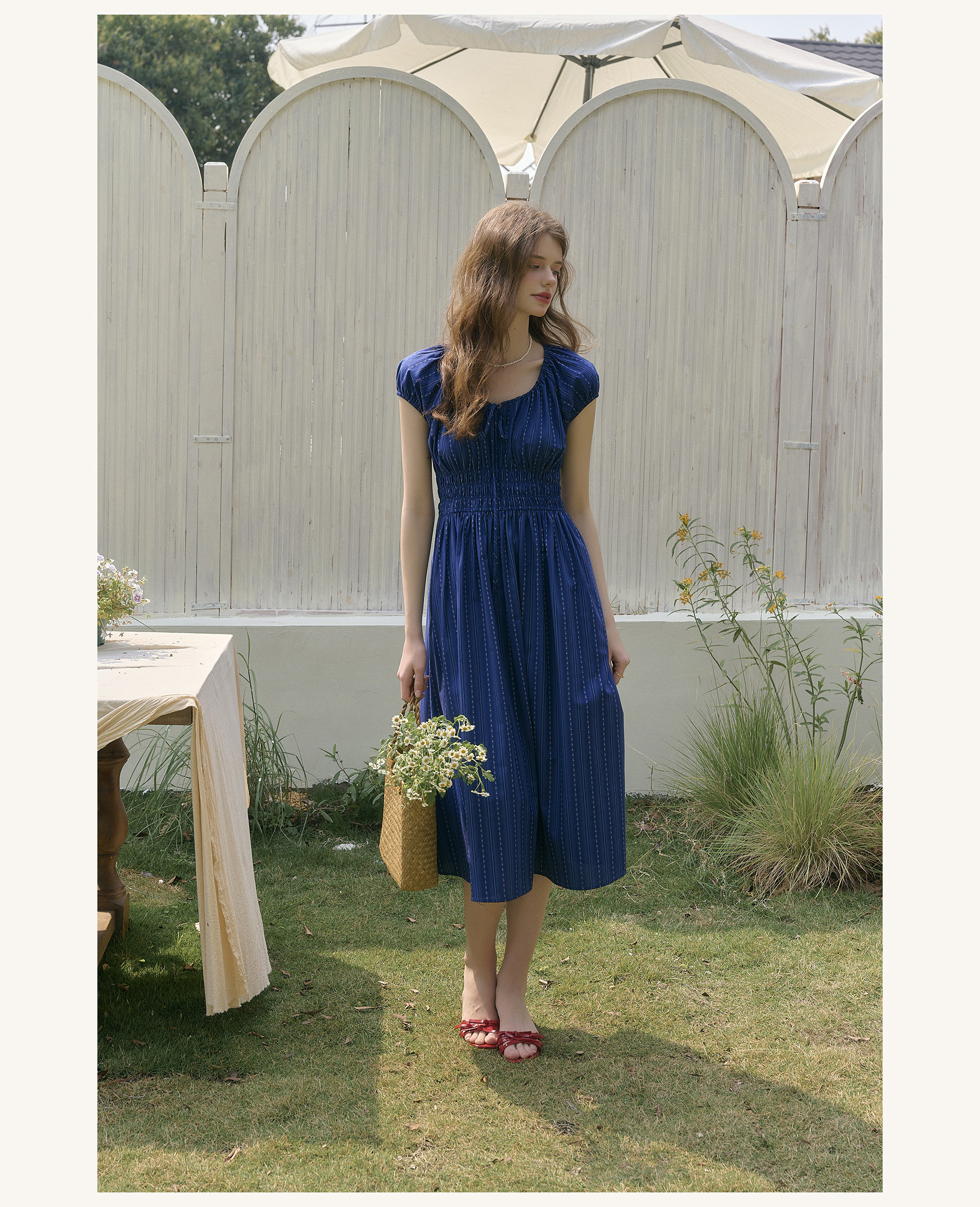 SimpleRetro Kleid mit verstellbarem Ausschnitt und Puffärmeln, französischer Taillenrock, blauer, schlankmachender langer Rock
