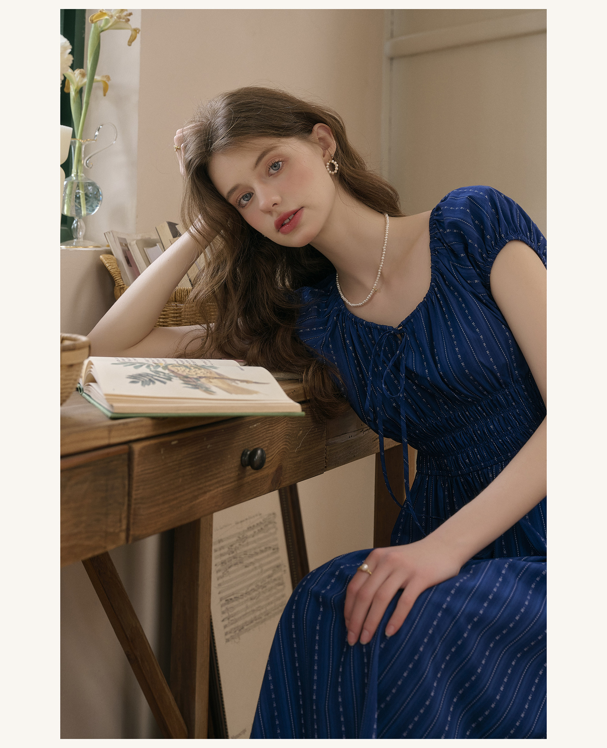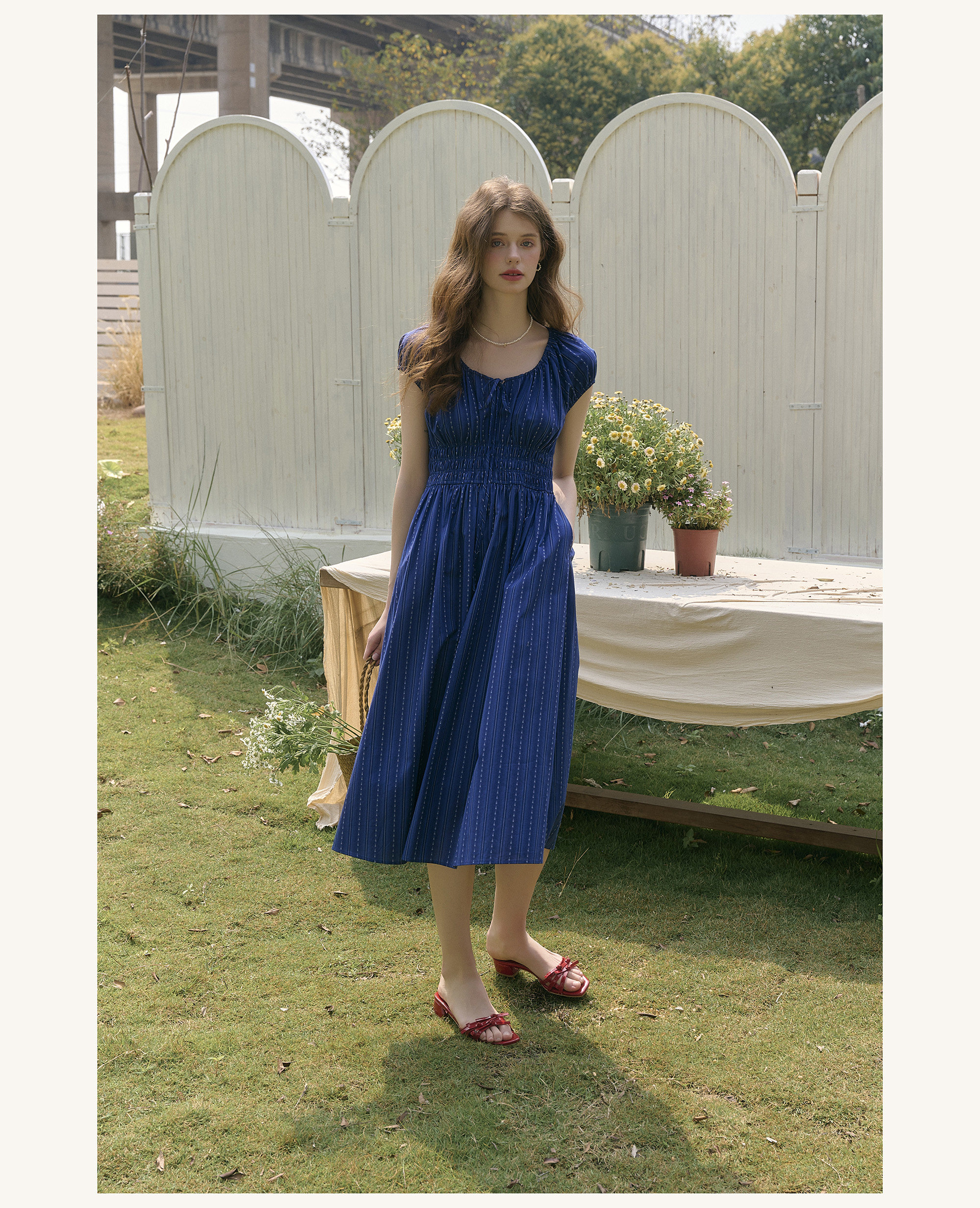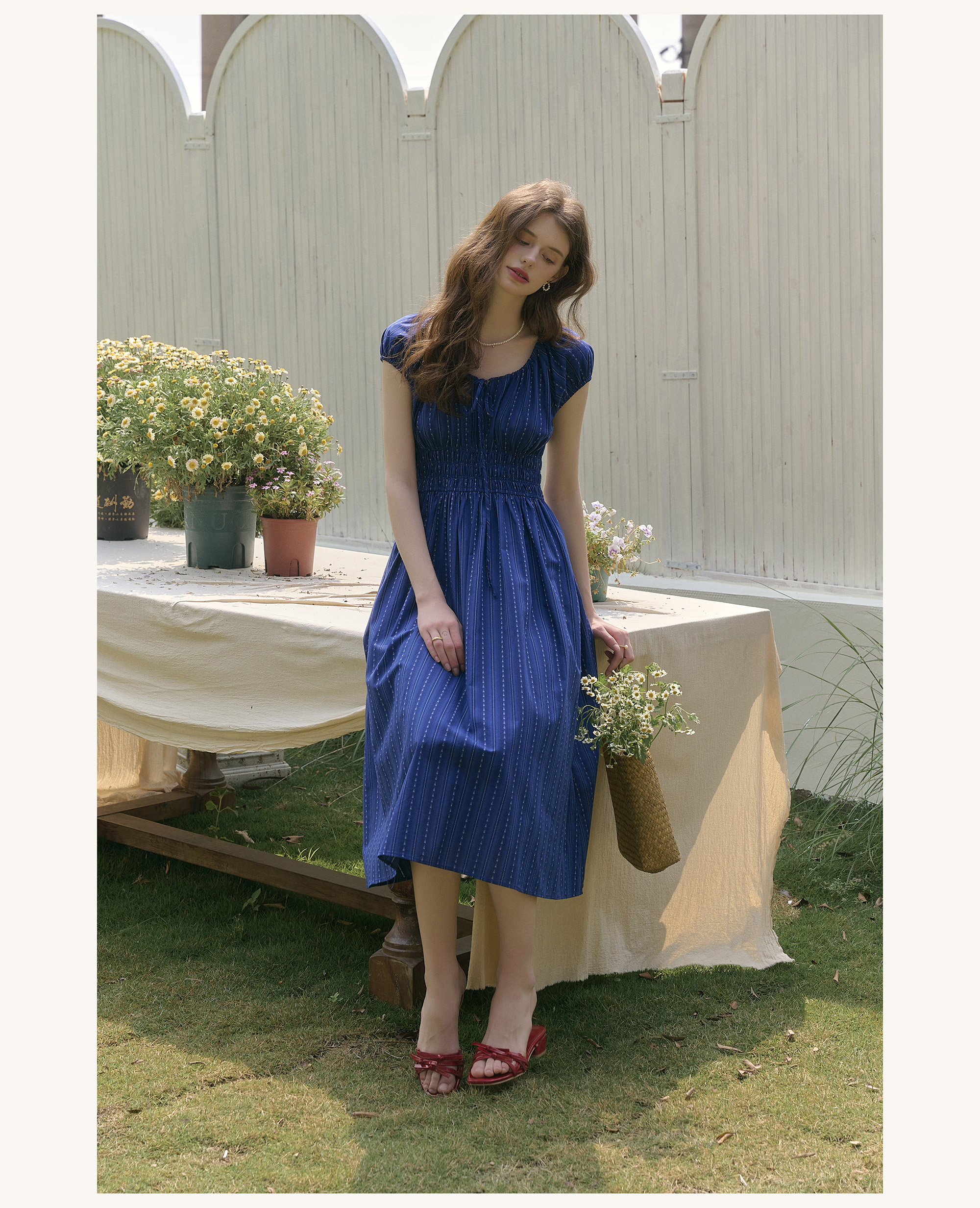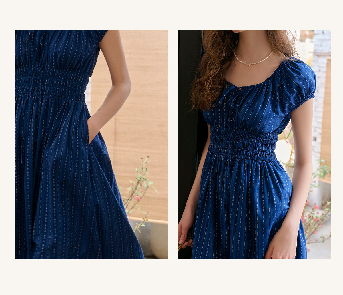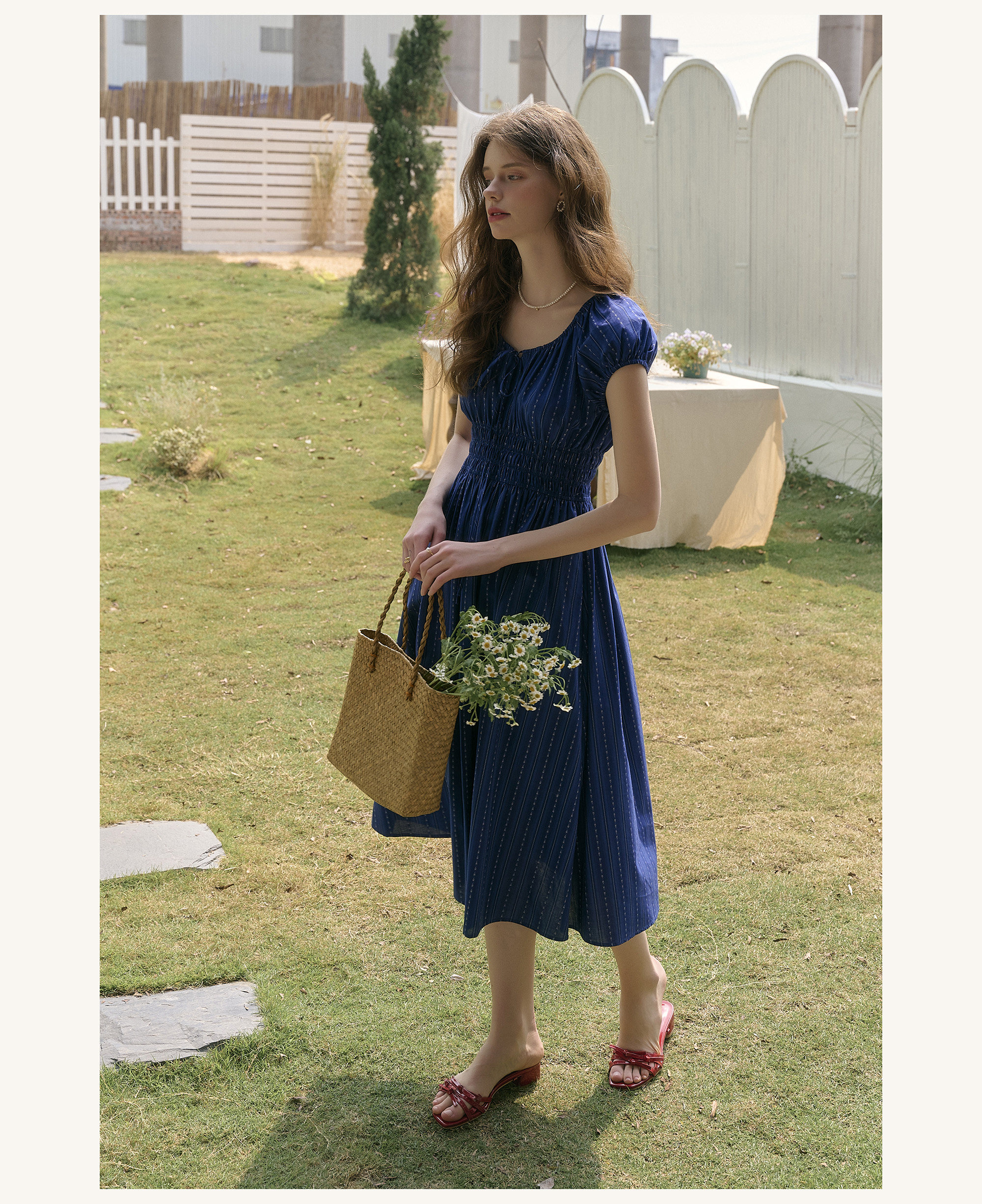 SimpleRetro Kleid mit verstellbarem Ausschnitt und Puffärmeln, französischer Taillenrock, blauer, schlankmachender langer Rock