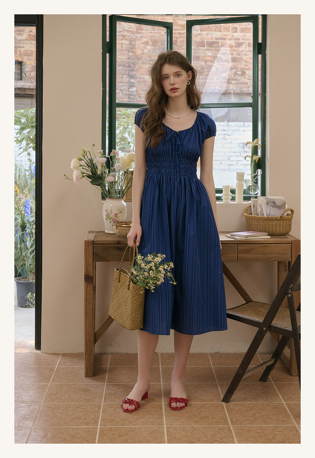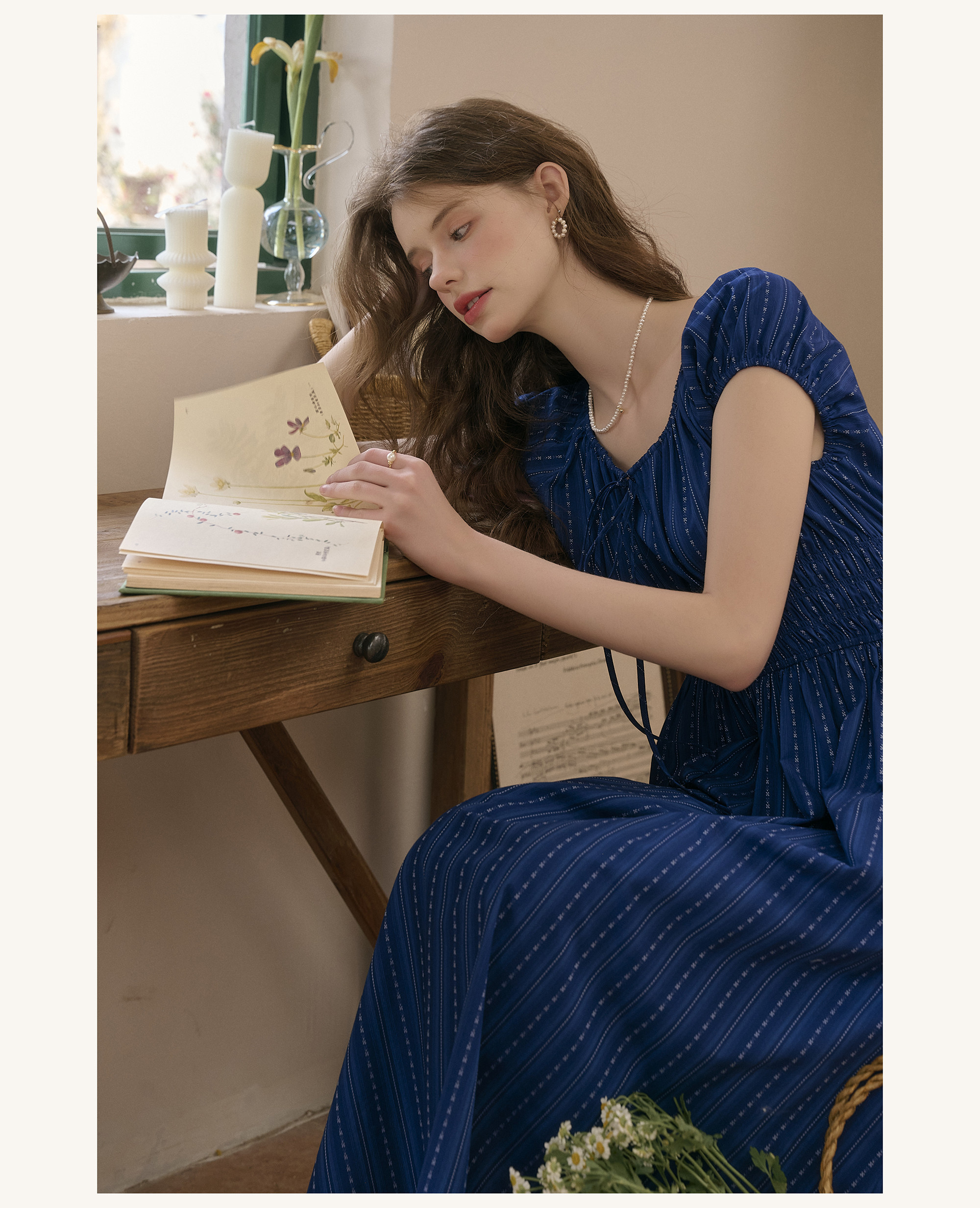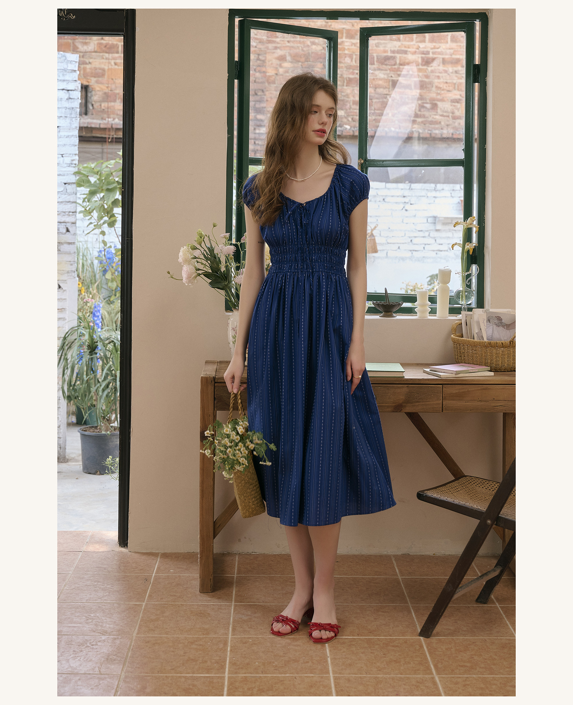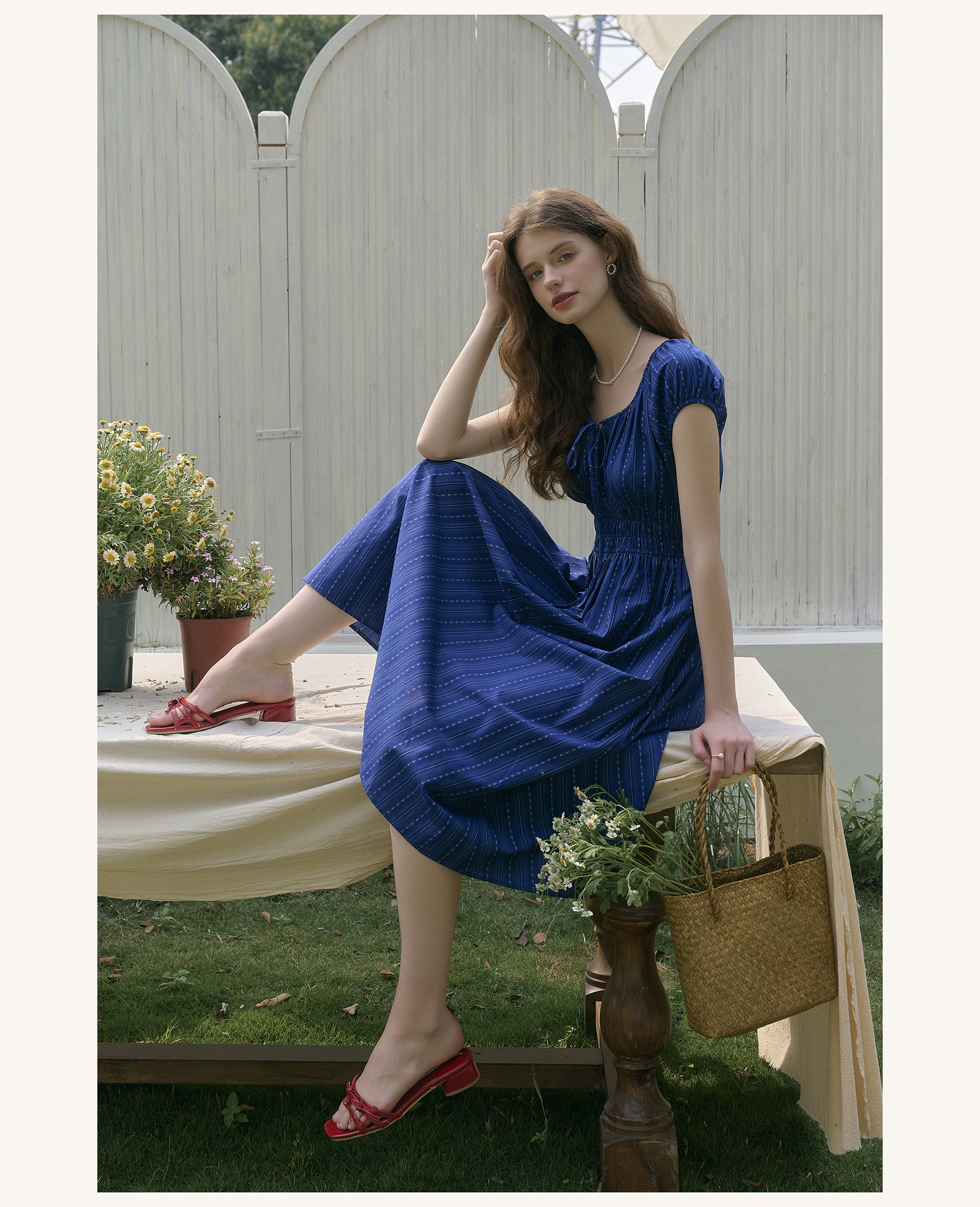 SimpleRetro Kleid mit verstellbarem Ausschnitt und Puffärmeln, französischer Taillenrock, blauer, schlankmachender langer Rock