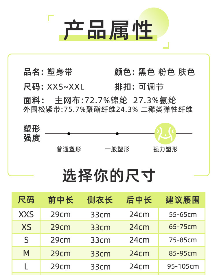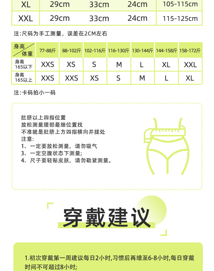 尺码 XXS【体重74-88斤,腰围55-65】,XS【体重88-102斤,腰围65-75】,S【体重102-116斤,腰围75-85】,M【体重116-130斤,腰围85-95】,L【体重130-144斤,腰围95-105】,XL【体重144-158斤,腰围105-115】,XXL【体重158-172斤,腰围115-125】