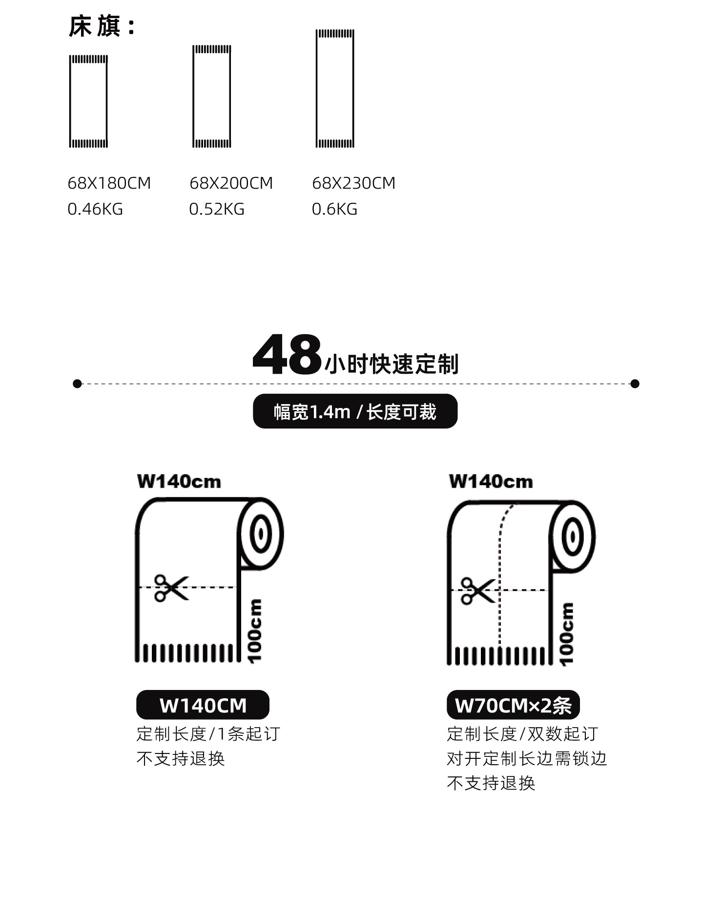 尺寸 70*180cm床旗酒店民宿单人床专用,70*200cm床旗酒店民宿单人床专用,70*230cm床旗酒店民宿双人床专用,140*180cm适合沙发/办公室/单人床用,140*200cm适合沙发/办公室/单人床用,140*230cm适合沙发/车/双人床用,140*260cm适合沙发和queensize双人床用,140*280cm适合酒店民宿Kingsize双人床用,宽度140cm定制长度每米价格