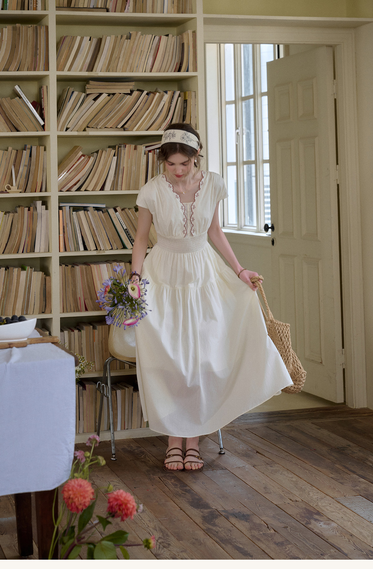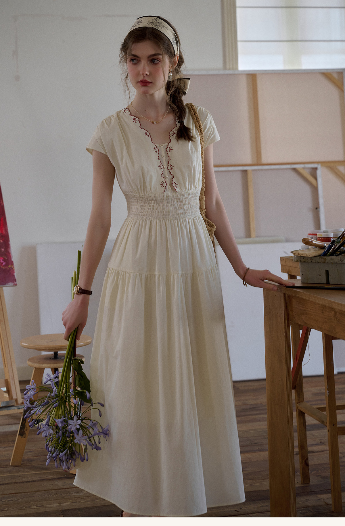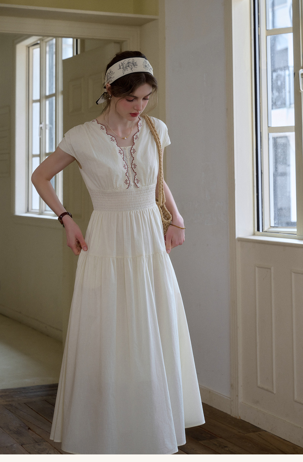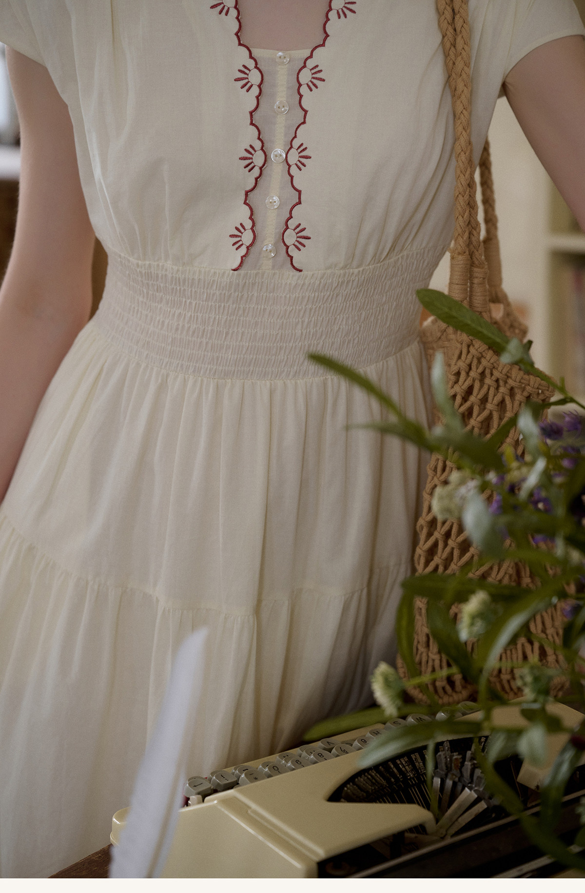 SimpleRetro Qingyuan Flower Language 60S Baumwolle pastoraler Stil besticktes französisches Taillenkleid langer Rock