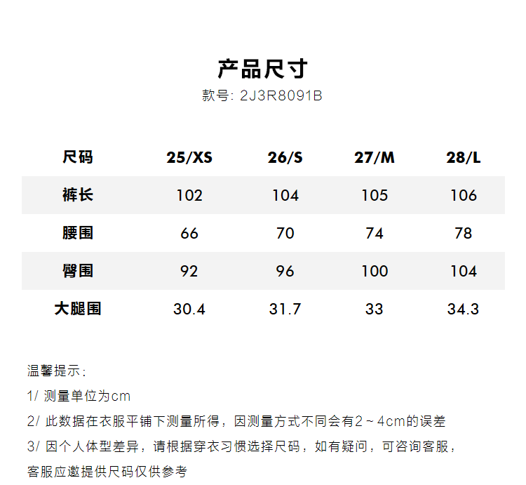 Outseam (cm) 99 cm 101.5 cm 104 cm 106.5 cm 109 cm
