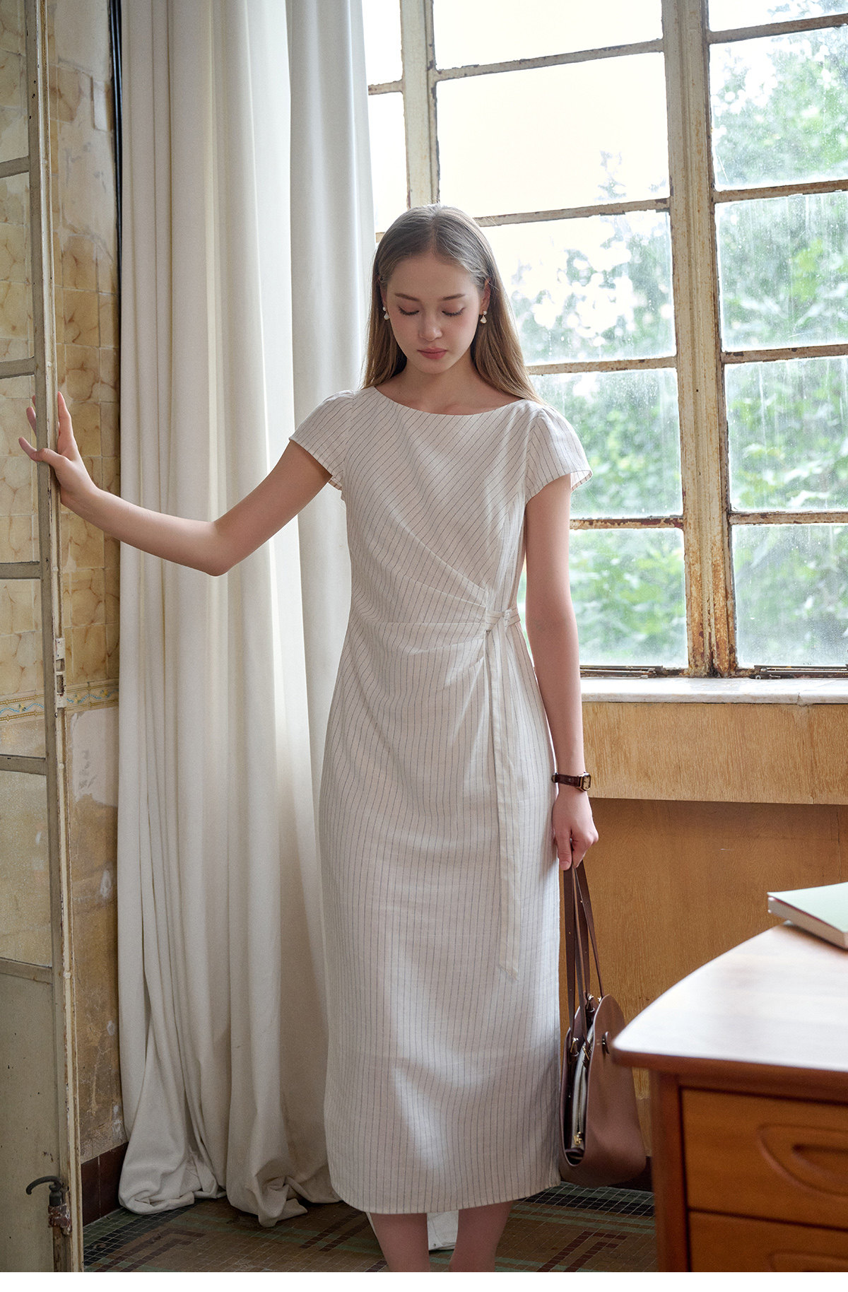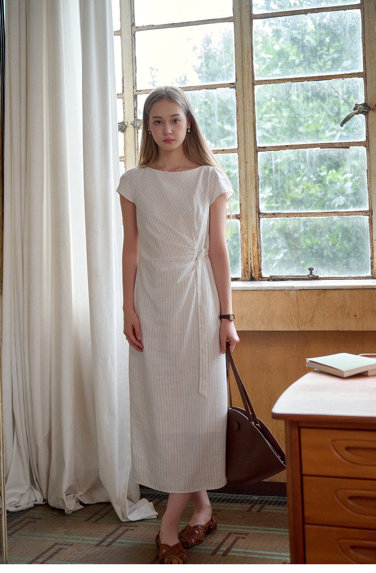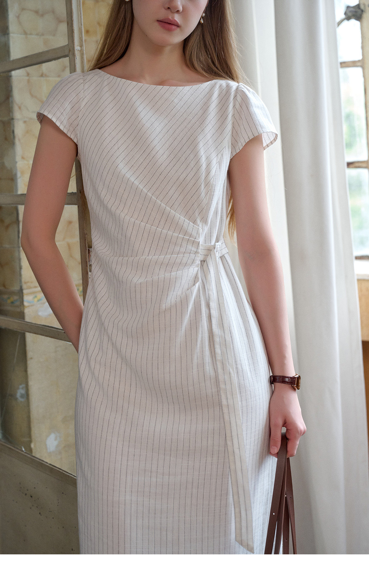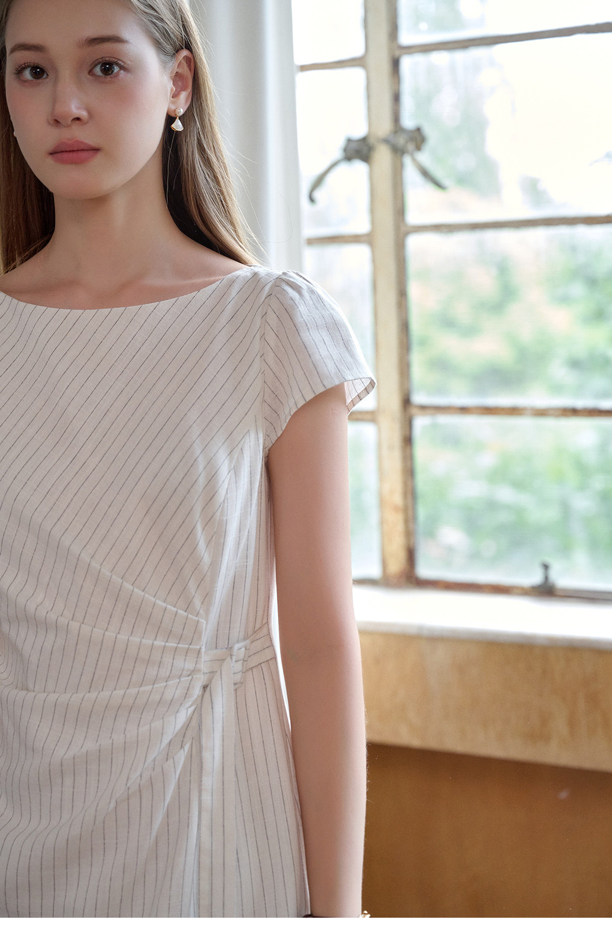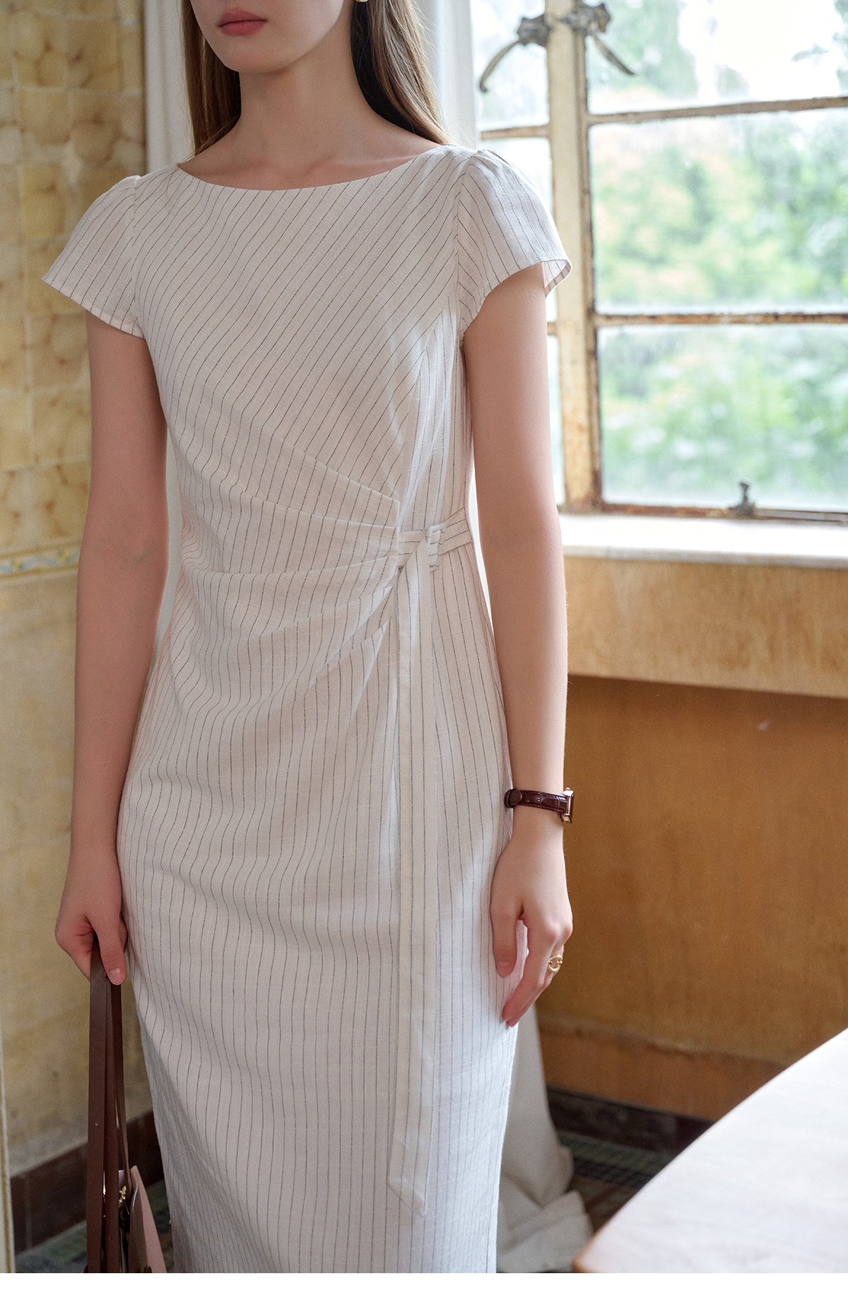 SimpleRetro白露清歌 法式简约亚麻不规则收褶可调节条纹连衣裙女