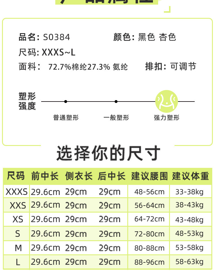 Size XXXS weight 66-76Jin Jin is equal to 0.5kg, waist circumference 48-56,XXS weight 76-86 Jin Jin equals 0.5 kg, waist circumference 56-64,XS weight 86-96Jin Jin is equal to 0.5kg, waist circumference 64-72,S weight 96-106 Jin Jin equals 0.5 kg, waist circumference 72-80,M weight 106-116 Jin Jin equals 0.5 kg, waist circumference 80-88,L weight 116-126 Jin Jin equals 0.5 kg, waist circumference 88-96