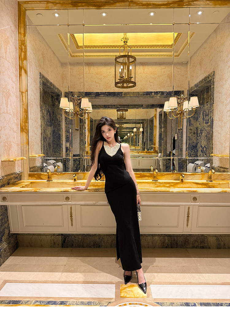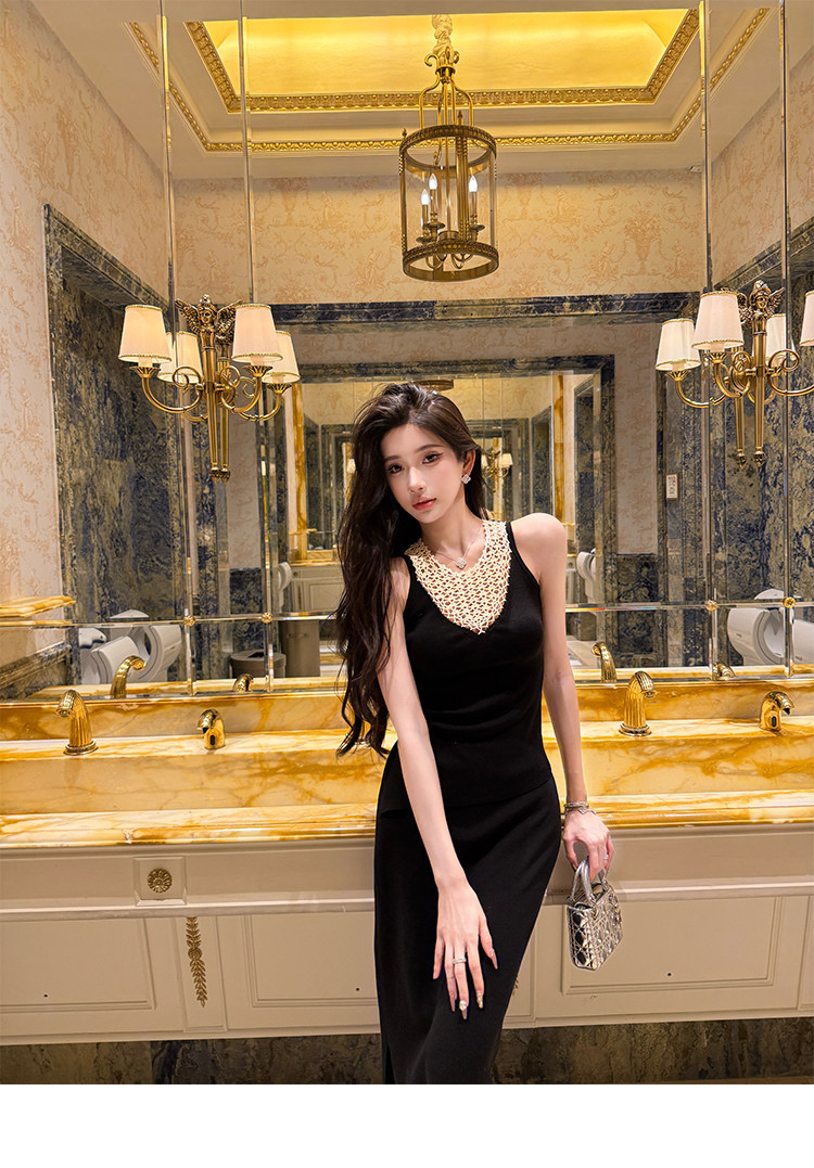 Элегантный комплект для женщин: вязаный топ с ажурными вставками и юбка с высоким разрезом по бокам.