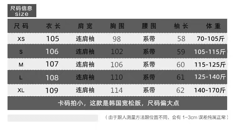 Size XS 70-105Jin Jin is equal to 0.5kg,S 105-115Jin Jin equals 0.5 kg,M 115-125Jin Jin equals 0.5 kg,L 125-140Jin Jin equals 0.5 kg,XL 140-155 Jin Jin equals 0.5 kg