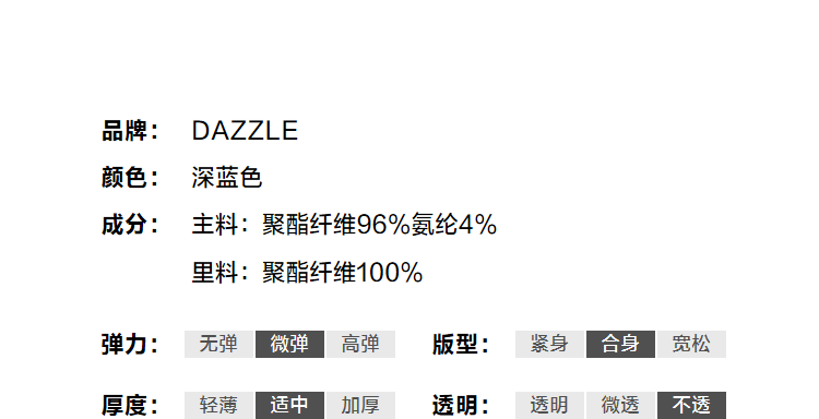 Material Composition 96% Polyester Fiber, 4% Polyurethane Elastic Fiber (Spandex)