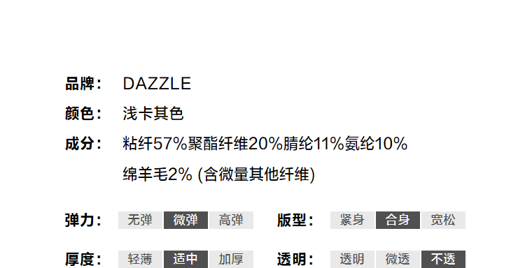 Composición de materiales Fibra de viscosa (fibra de viscosa) 57% Fibra de poliéster 20% Fibra de poliacrilonitrilo (fibra acrílica) 11% Fibra elástica de poliuretano (spandex) 10% Lana de oveja 2%