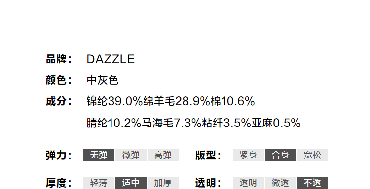 Composición de materiales Fibra de poliamida (nylon) 39%, lana de oveja 28,9%, algodón 10,6%, fibra de poliacrilonitrilo (fibra acrílica) 10,2%, otros 11,3%