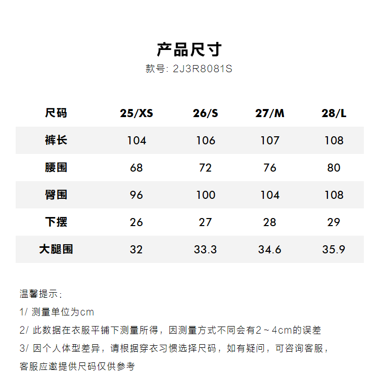 Outseam (cm) 99 cm 101.5 cm 104 cm 106.5 cm 109 cm