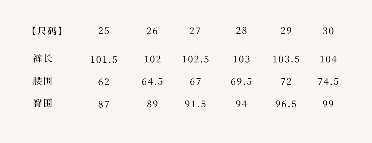 Outseam (cm) 99 cm 101.5 cm 104 cm 106.5 cm 109 cm