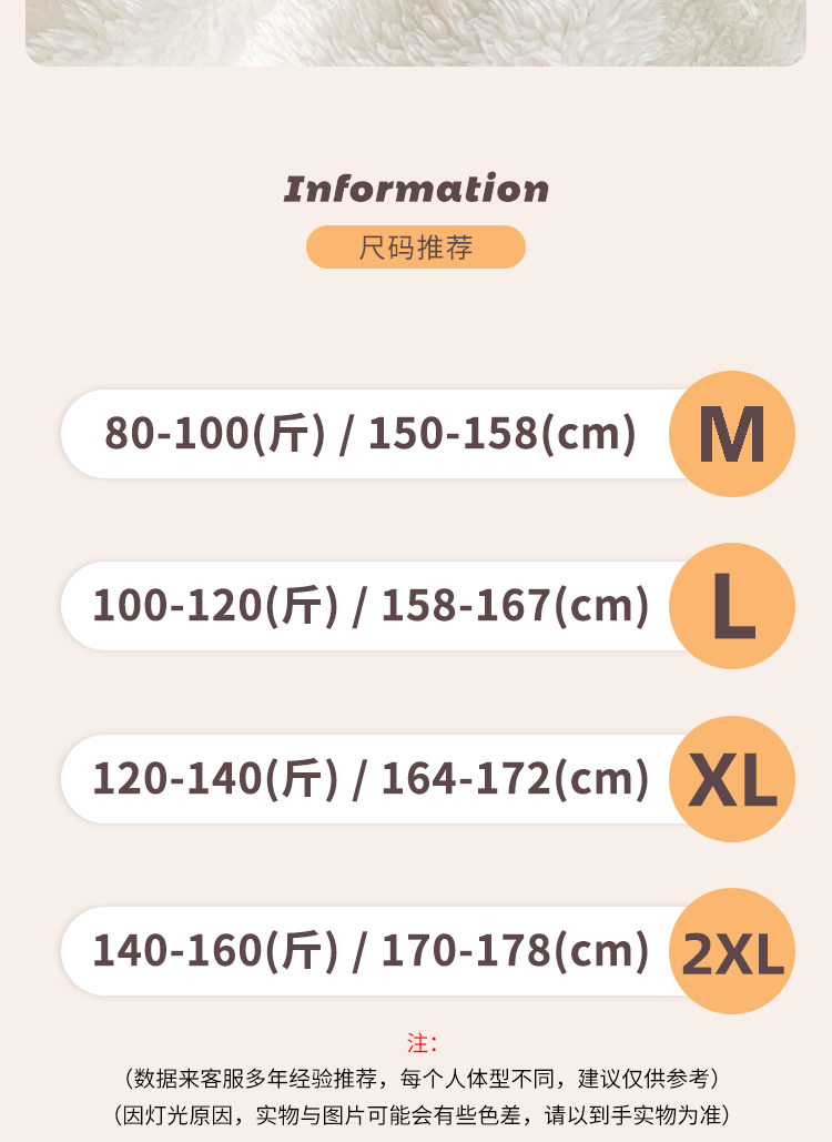 Größe M-Größe für Frauen (empfohlen 80–100 Jin Jin entspricht 0,5 kg),Größe L für Frauen (empfohlen 100–120 Jin Jin entspricht 0,5 kg),XL-Größe für Frauen (empfohlen 120–140 Jin Jin entspricht 0,5 kg),XXL-Größe weiblich (empfohlen 140-160 Jin Jin entspricht 0,5 kg)