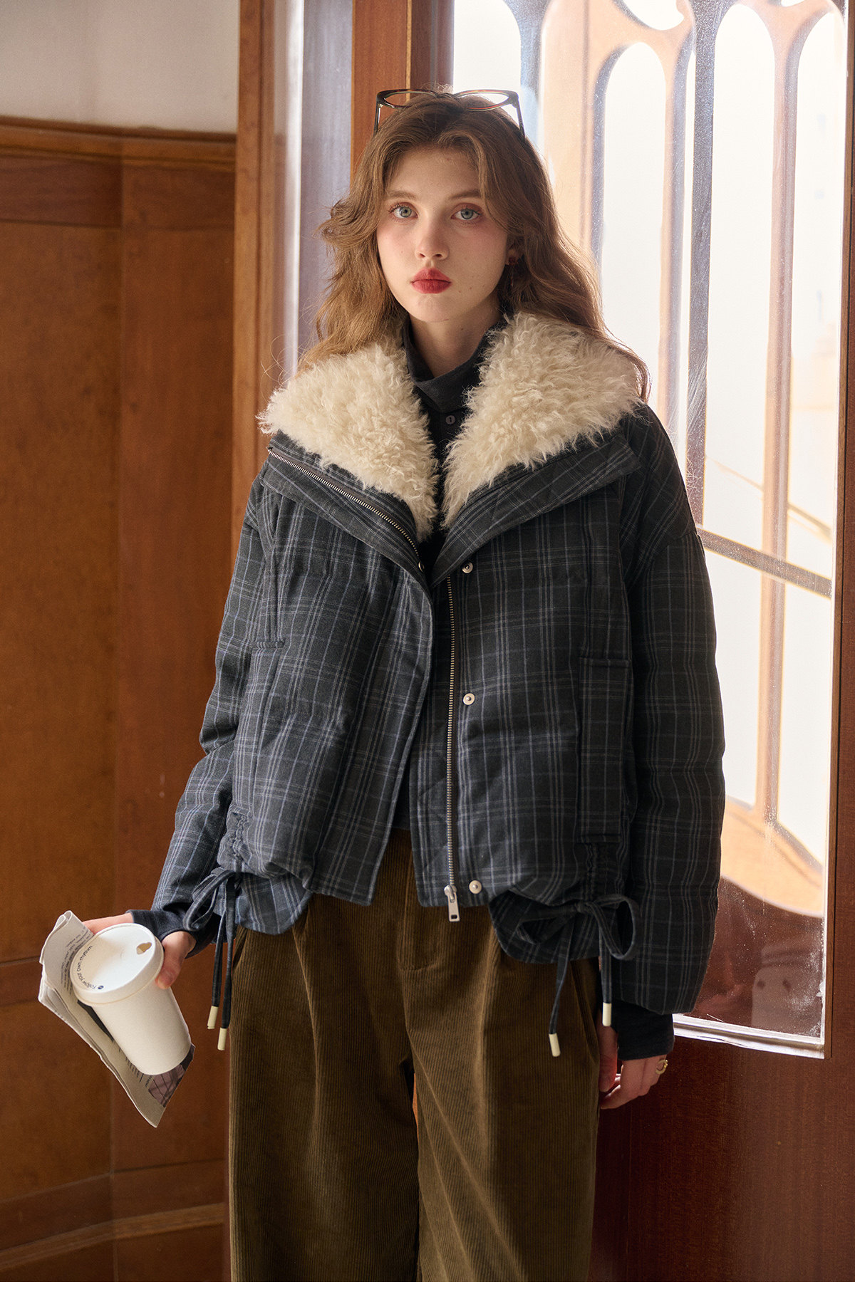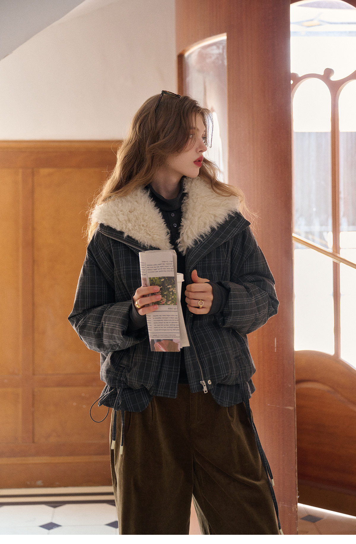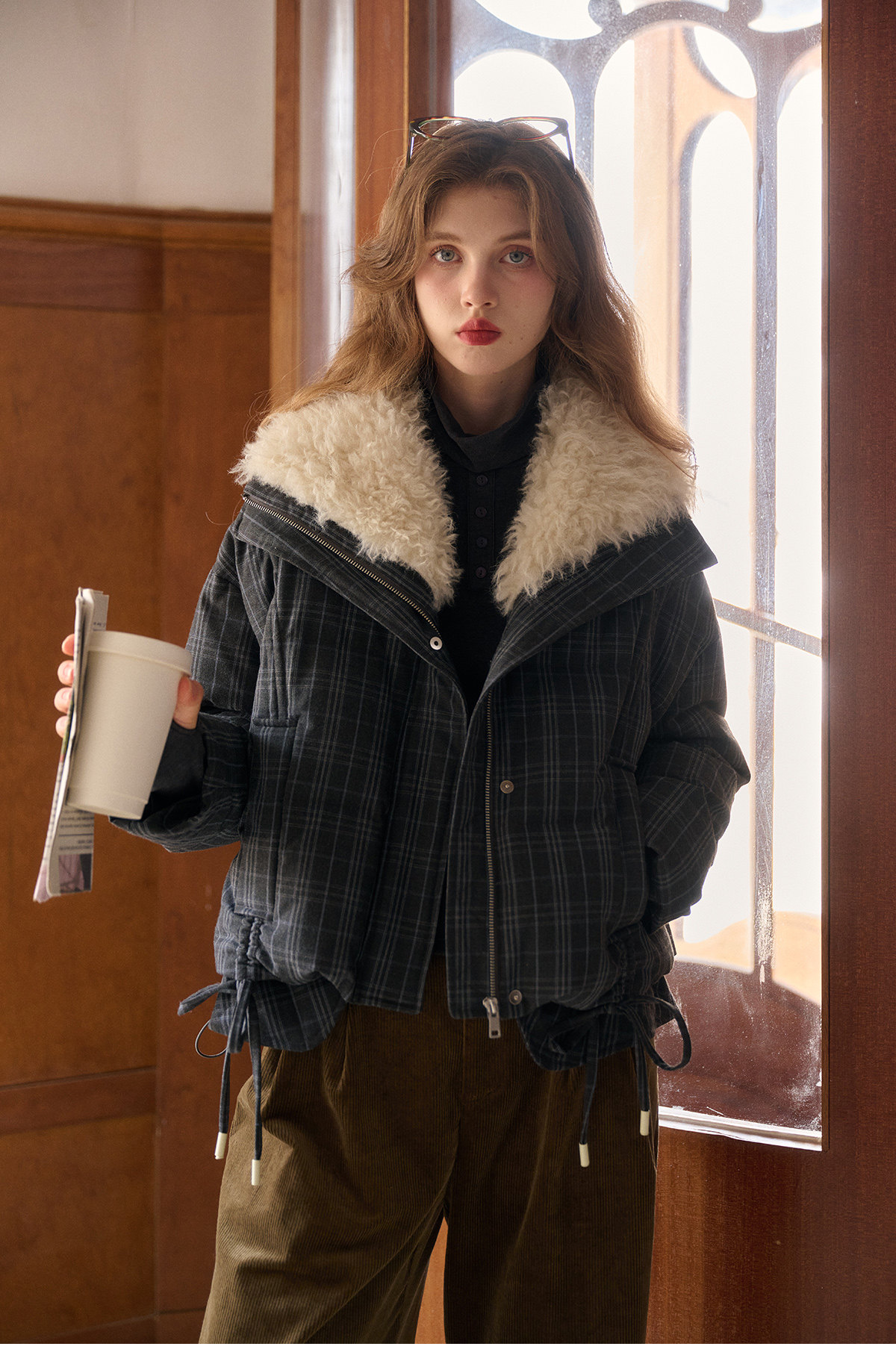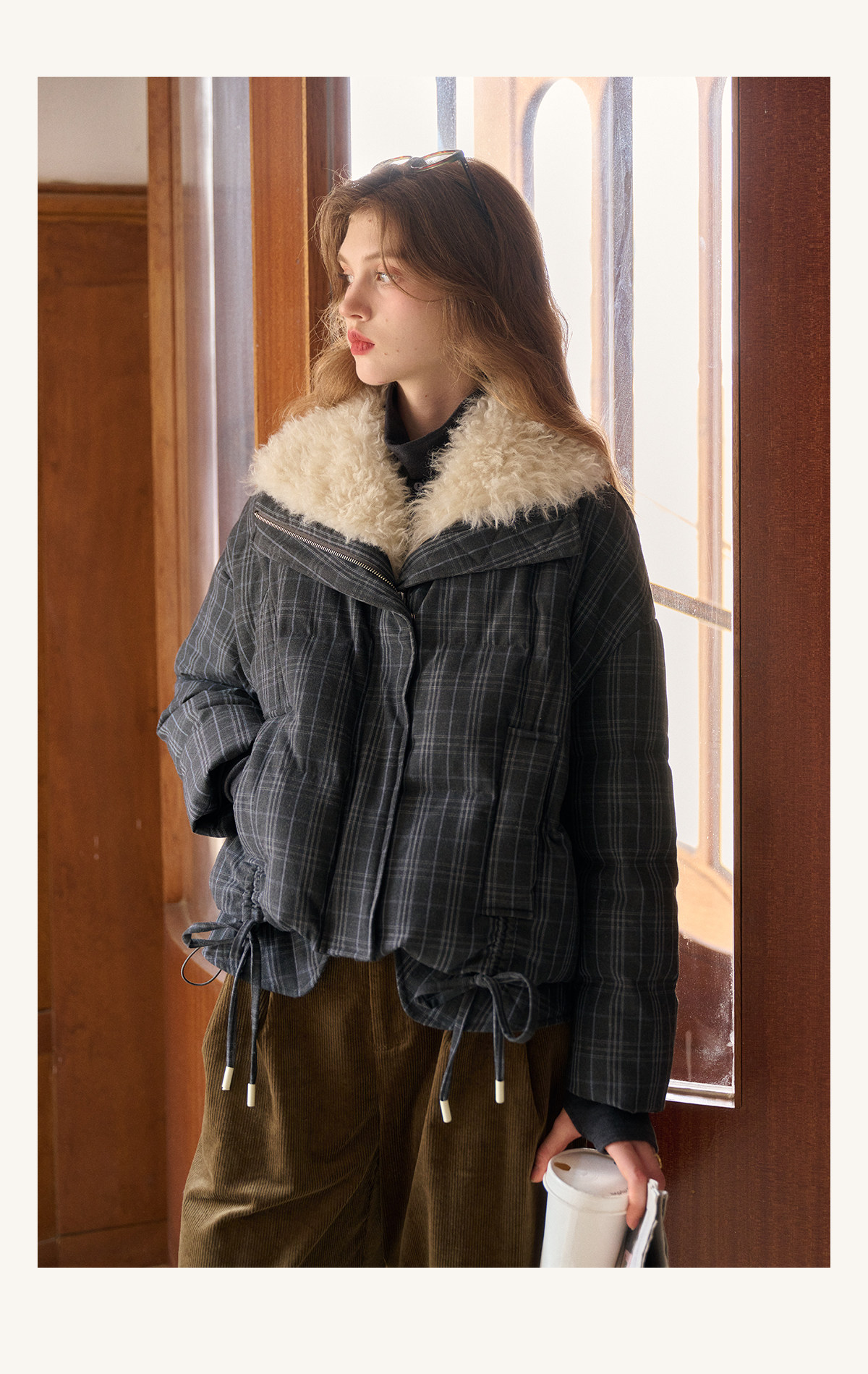 Simpleretro Snow Echo 90 White Duck down Plush Large Lapel Short Plaid down Jacket for Women Winter