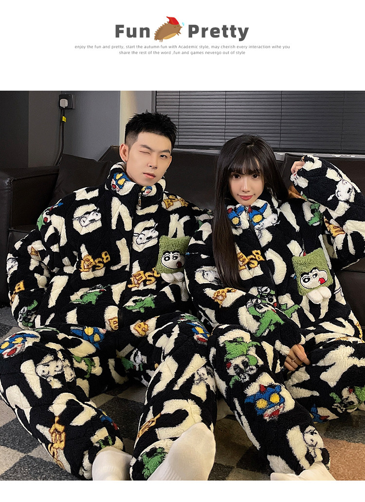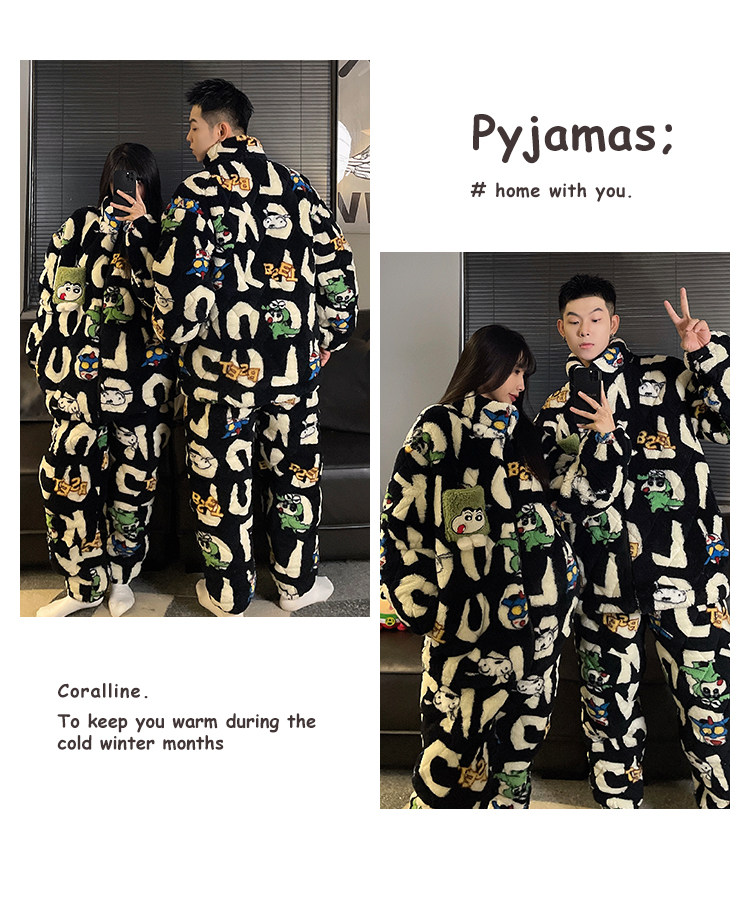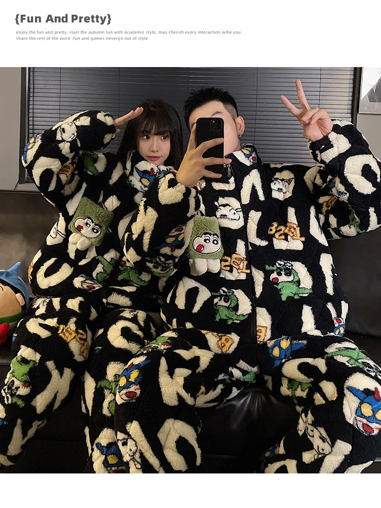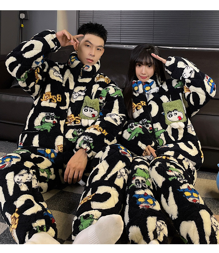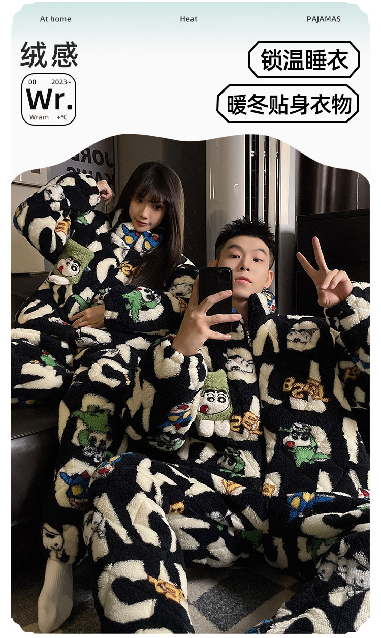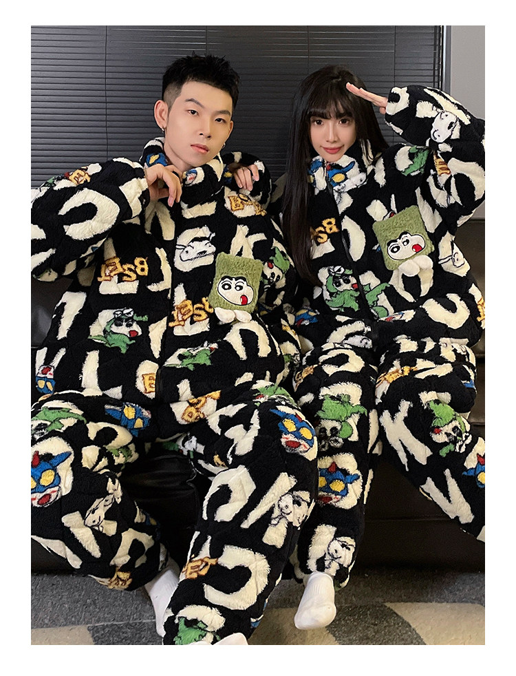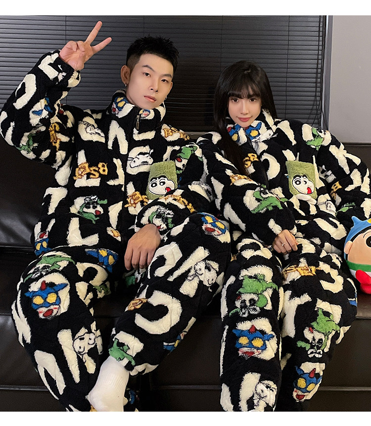 Crayon Shin-Chan Couple Pajamas for Women, Autumn and Winter, Three-Layer Quilted Coral Fleece, Thickened Men's Loungewear, Hunan Province Clothing