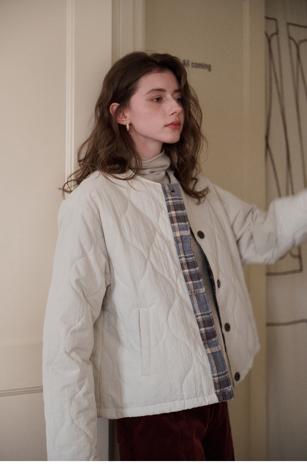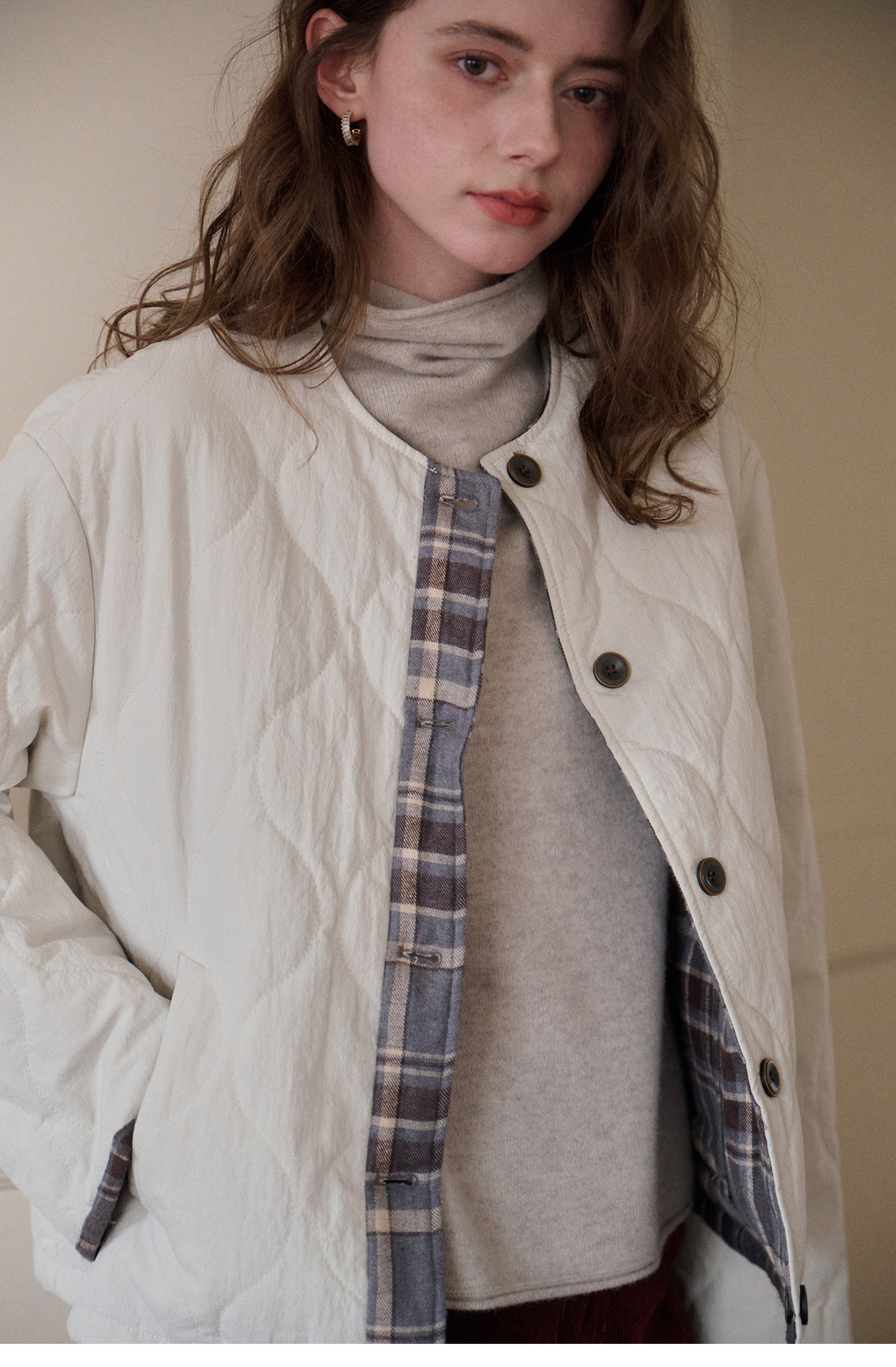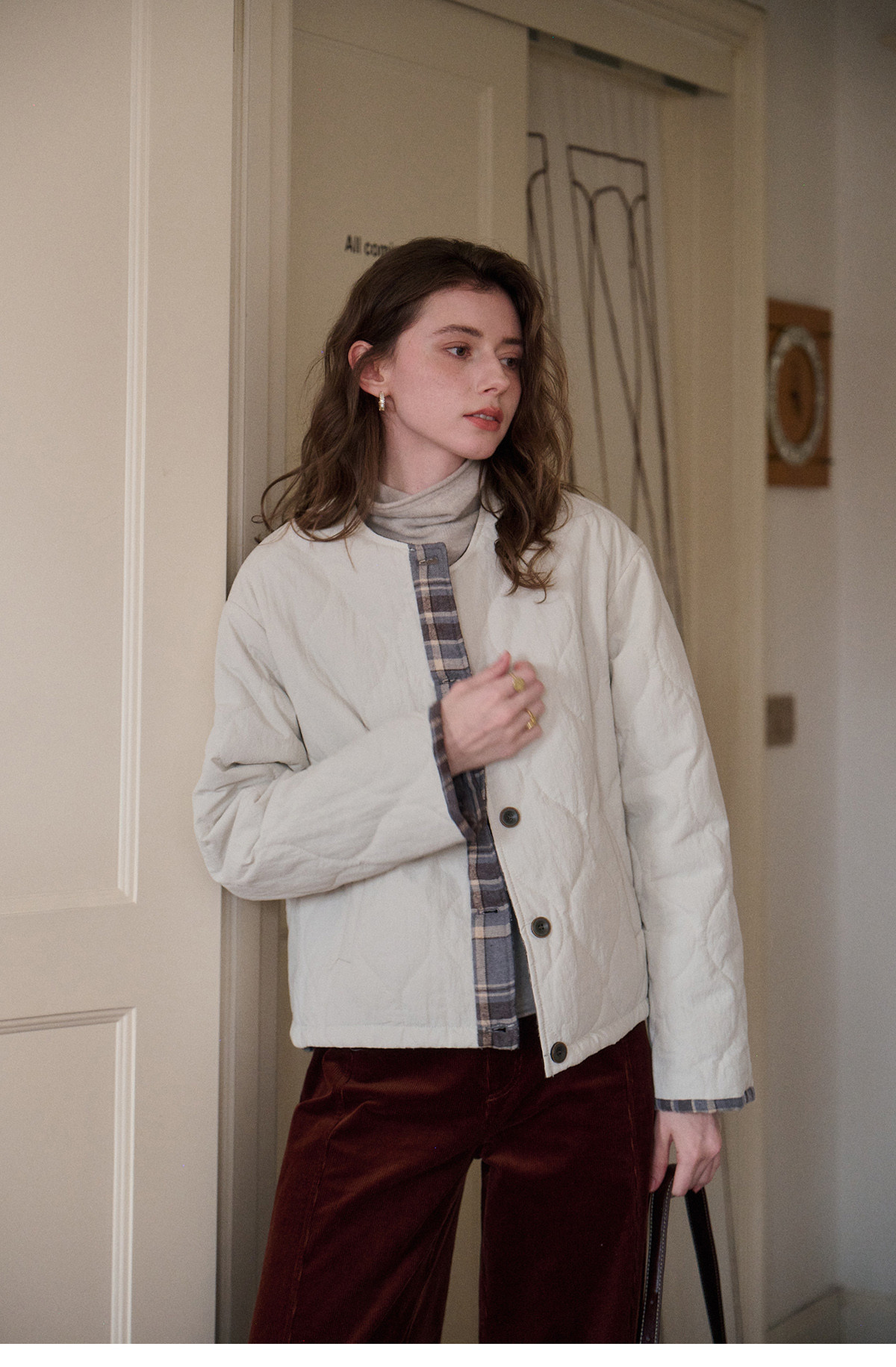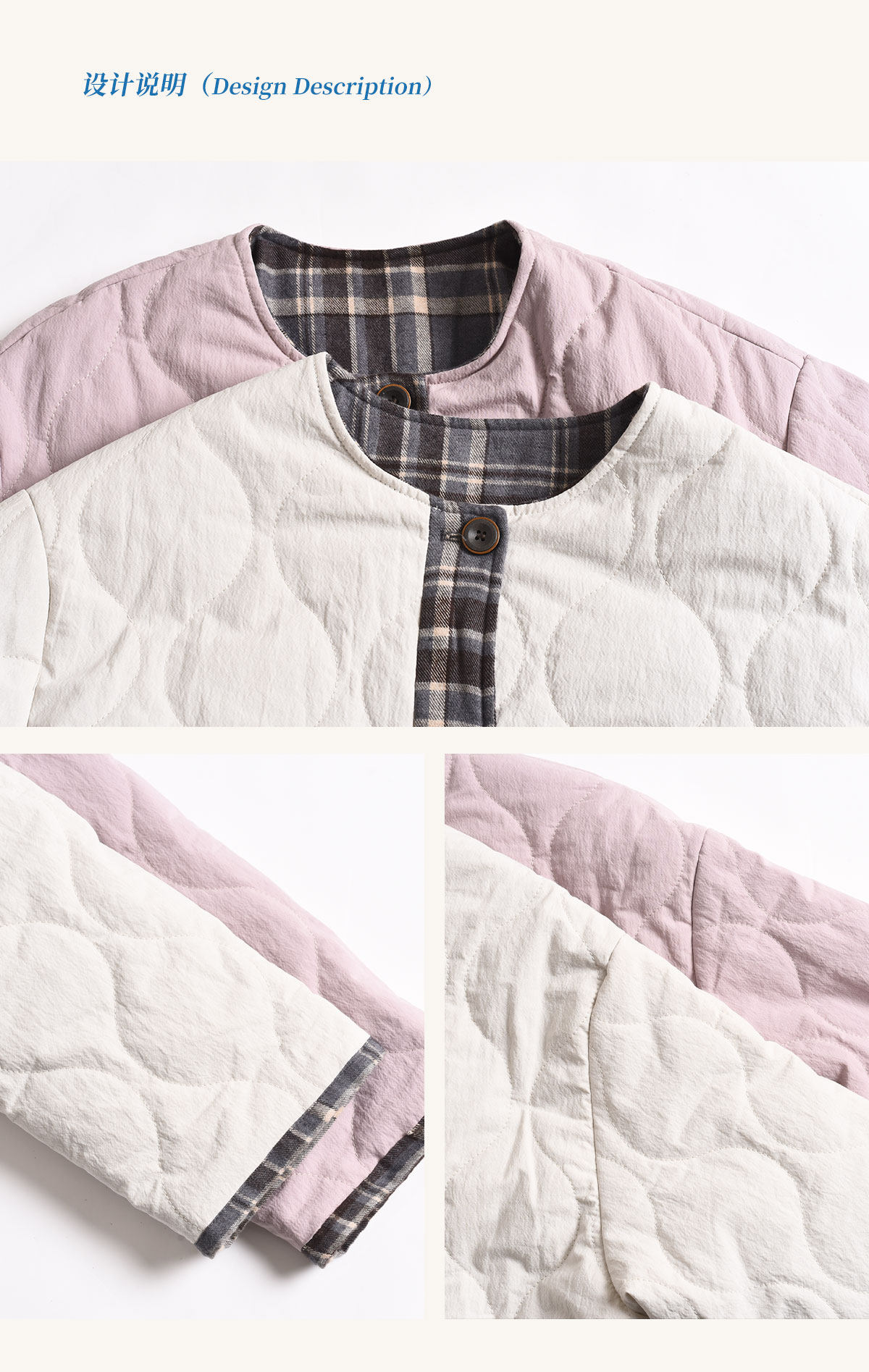 SimpleRetro香草戚风 洋气轻薄两面穿短款棉服外套女菱格圆领上衣