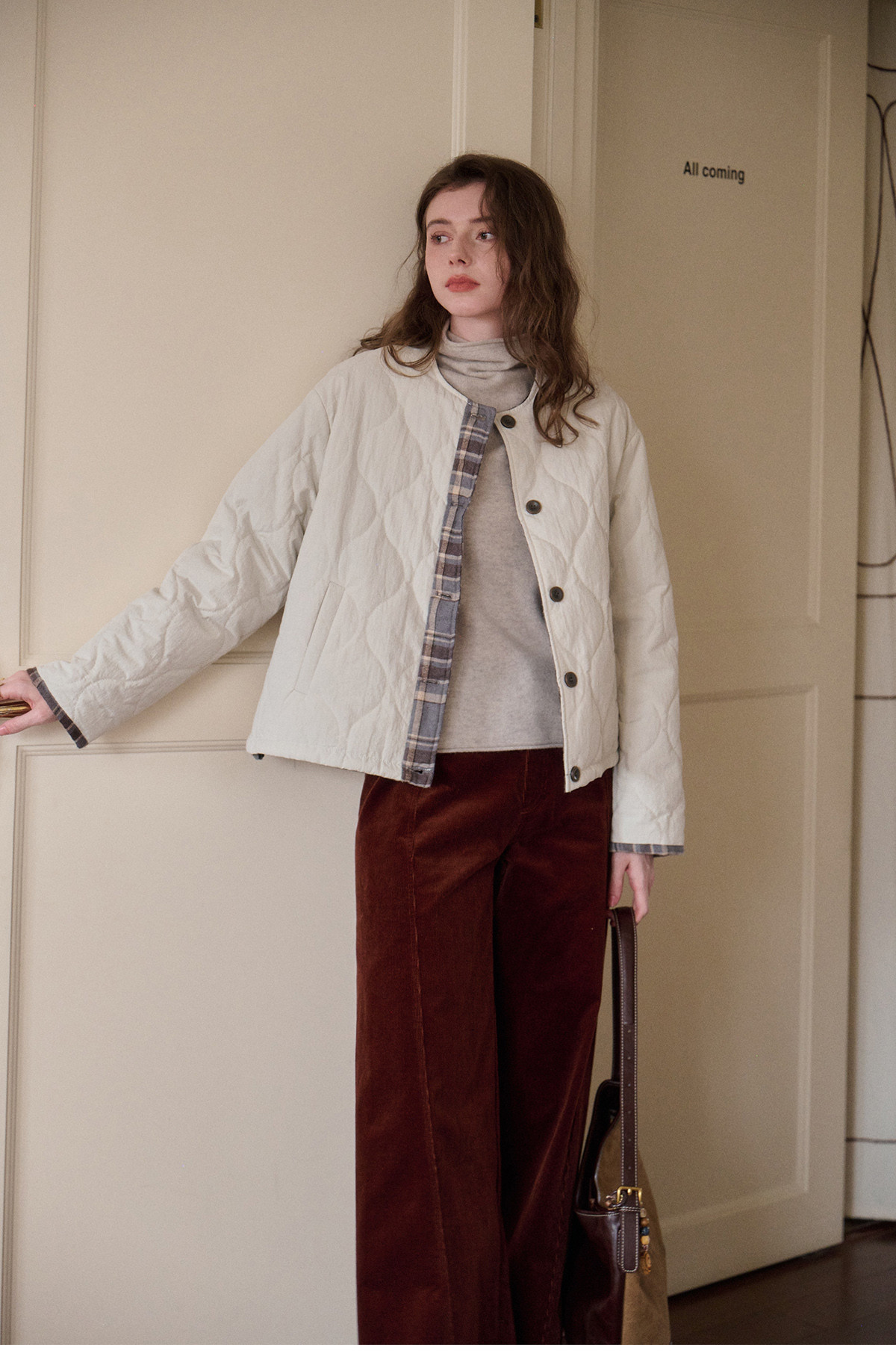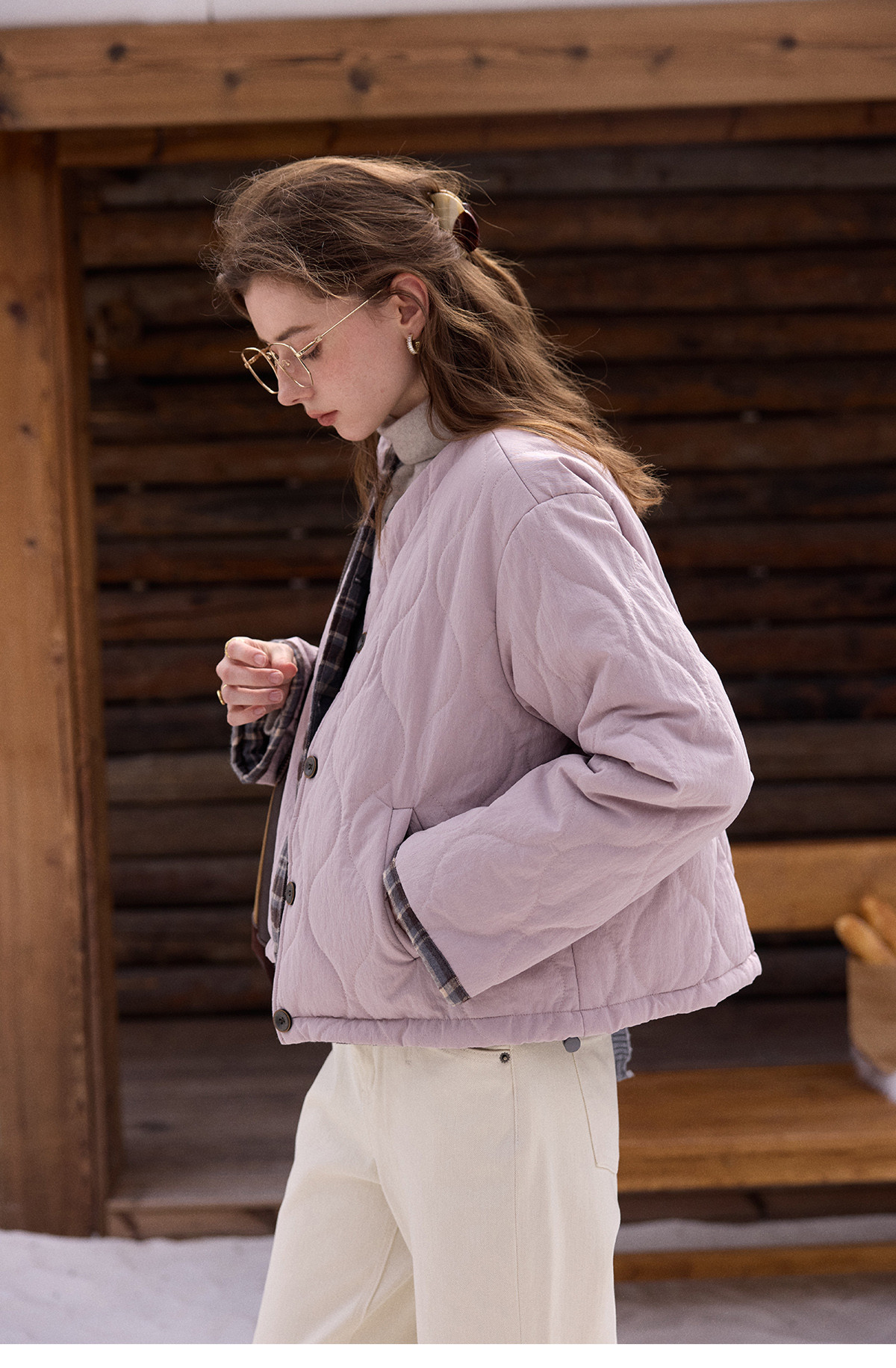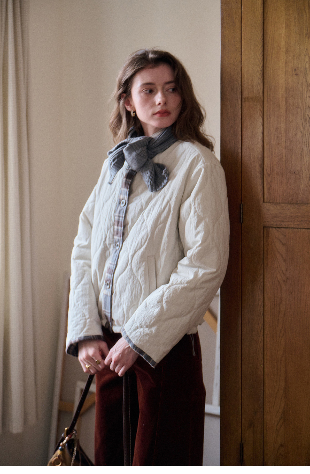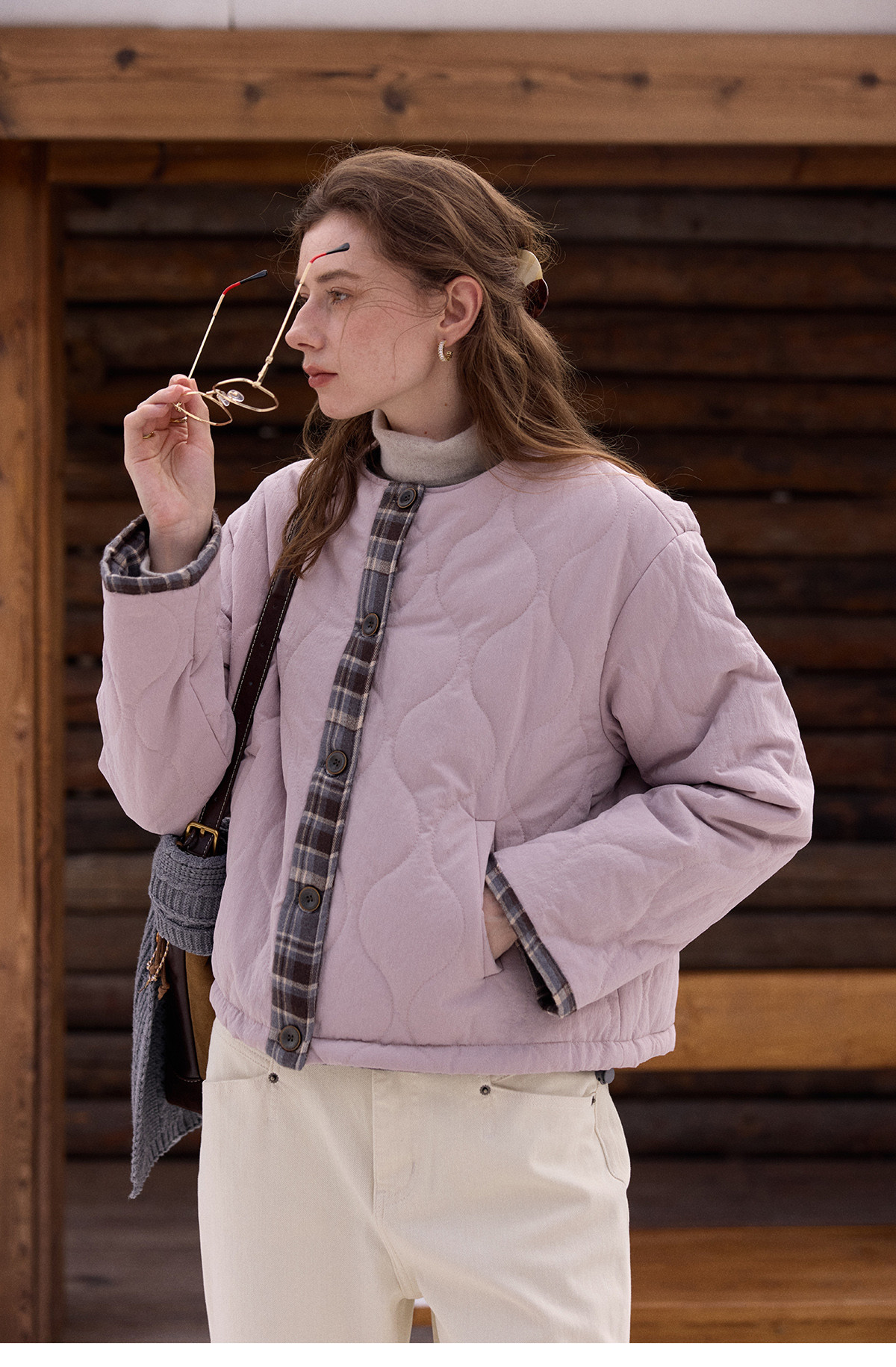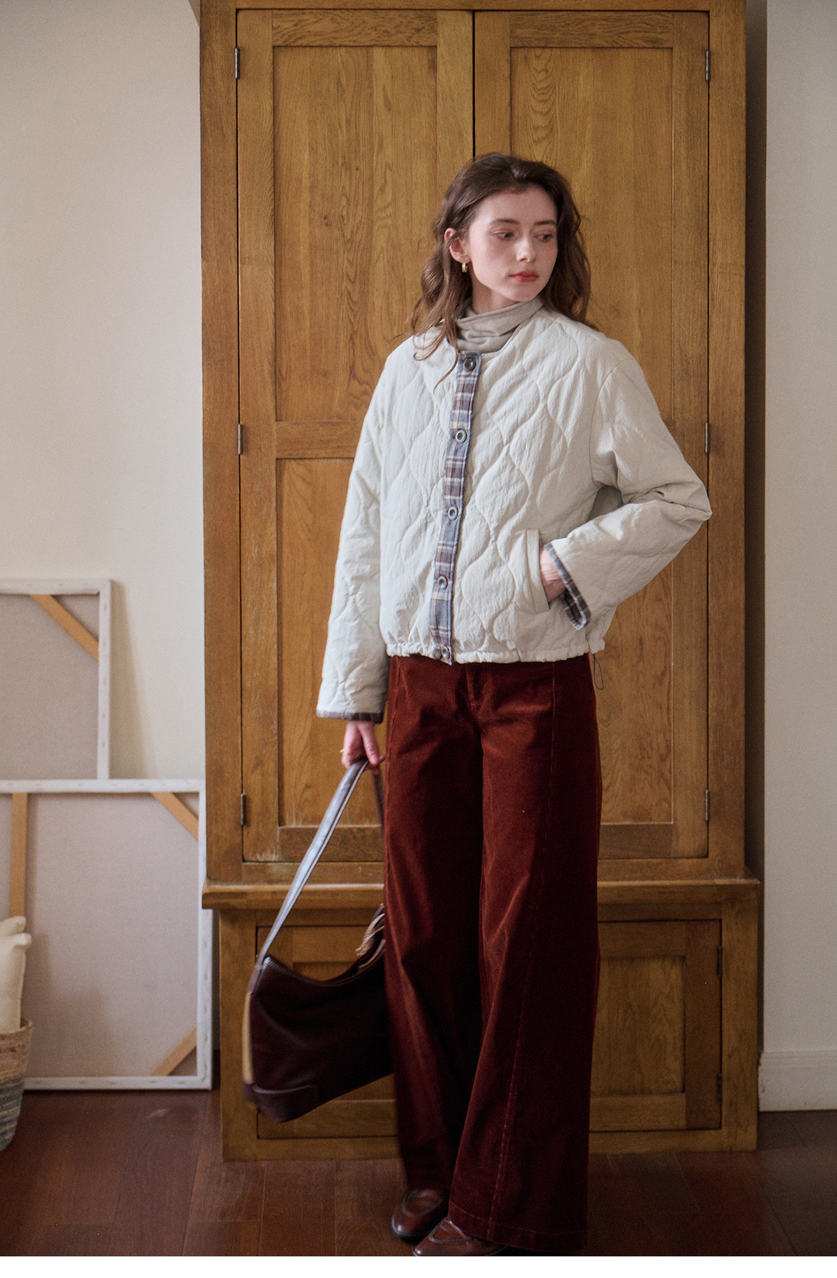 SimpleRetro香草戚风 洋气轻薄两面穿短款棉服外套女菱格圆领上衣