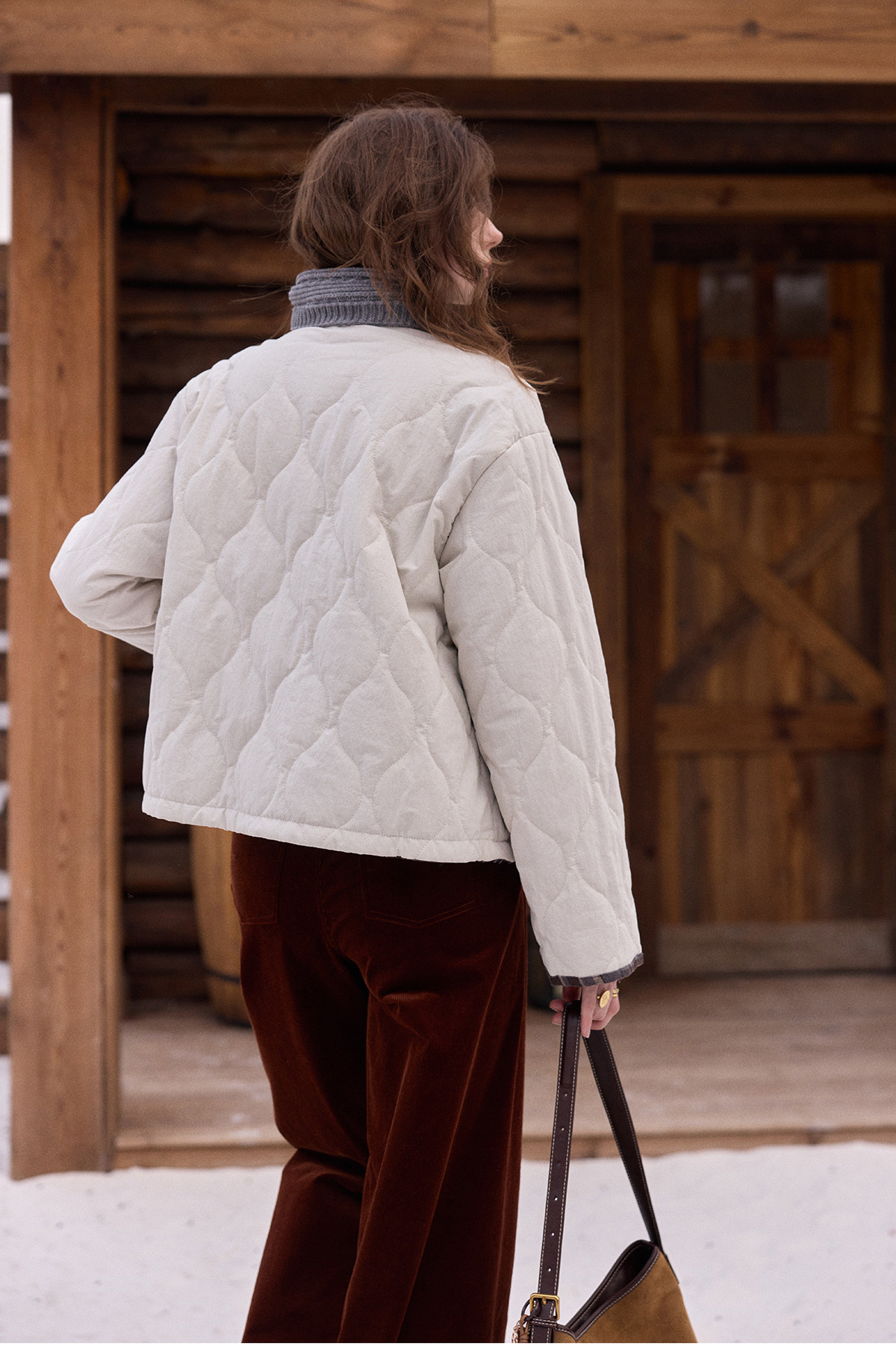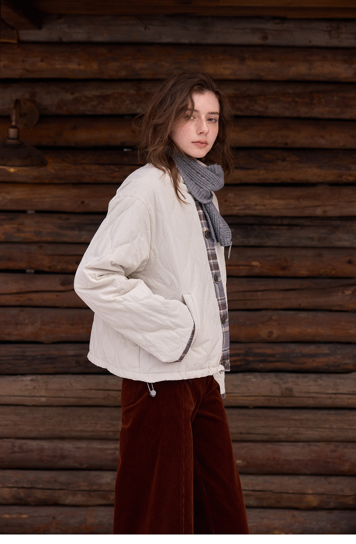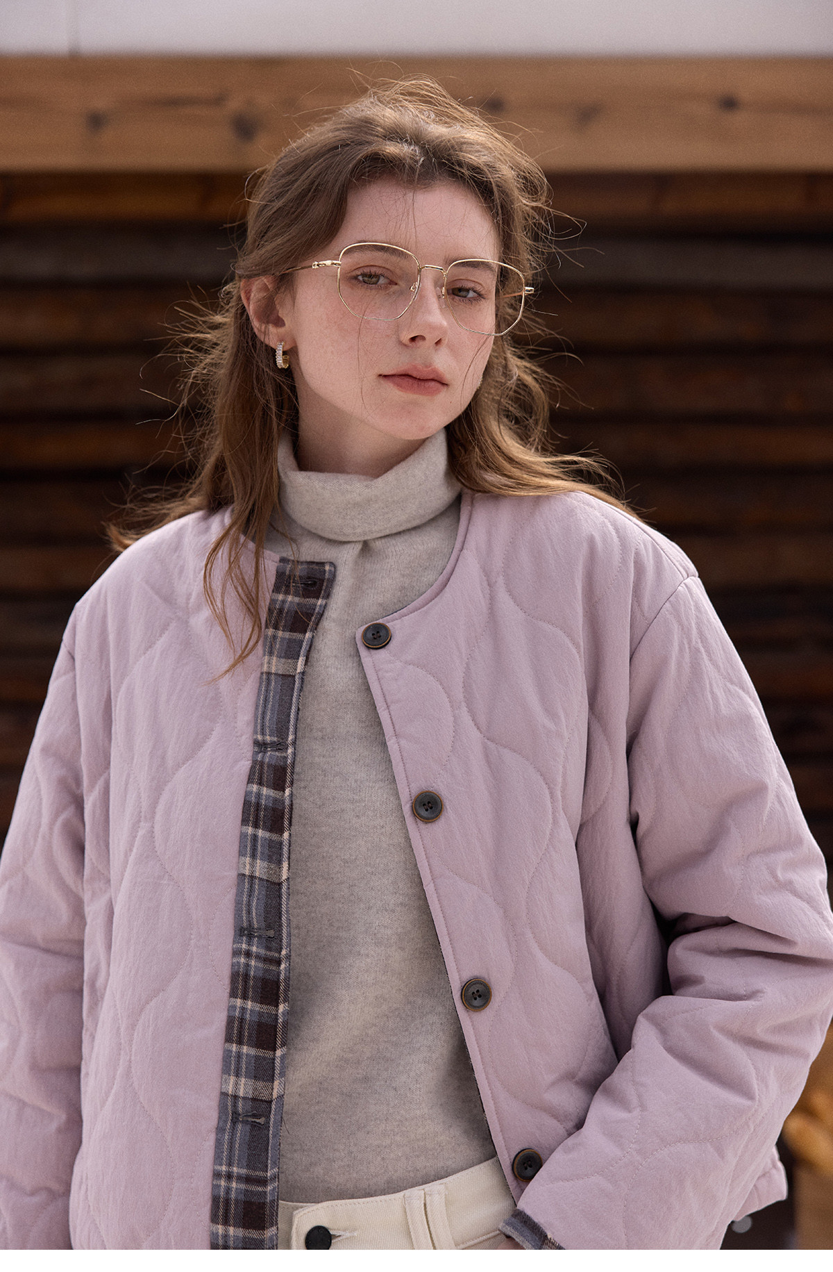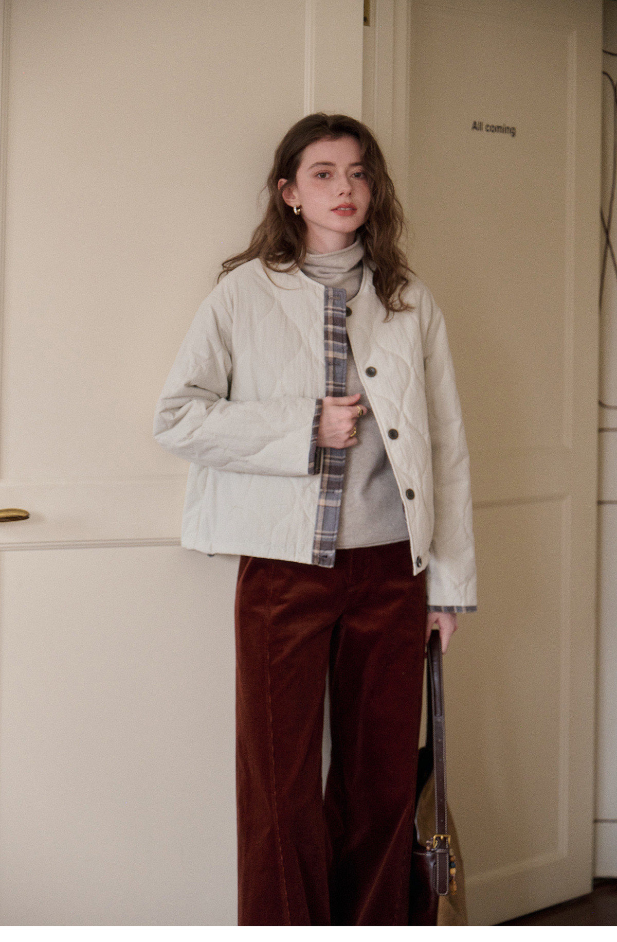 SimpleRetro香草戚风 洋气轻薄两面穿短款棉服外套女菱格圆领上衣