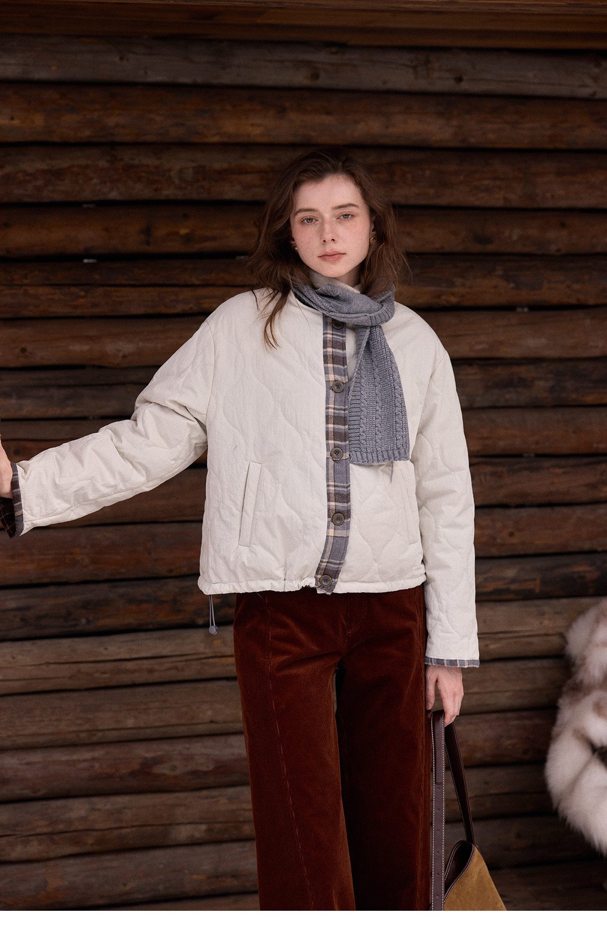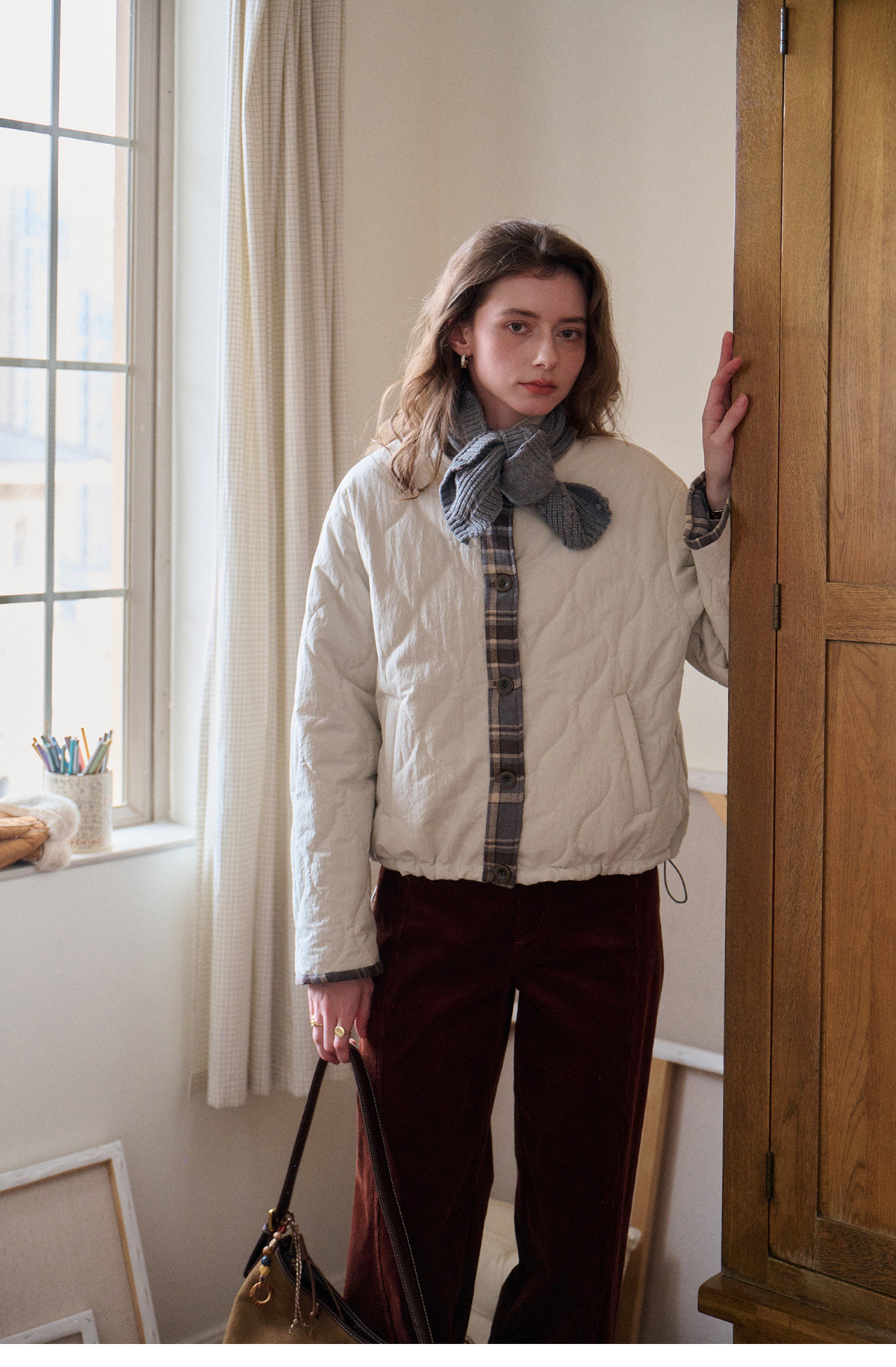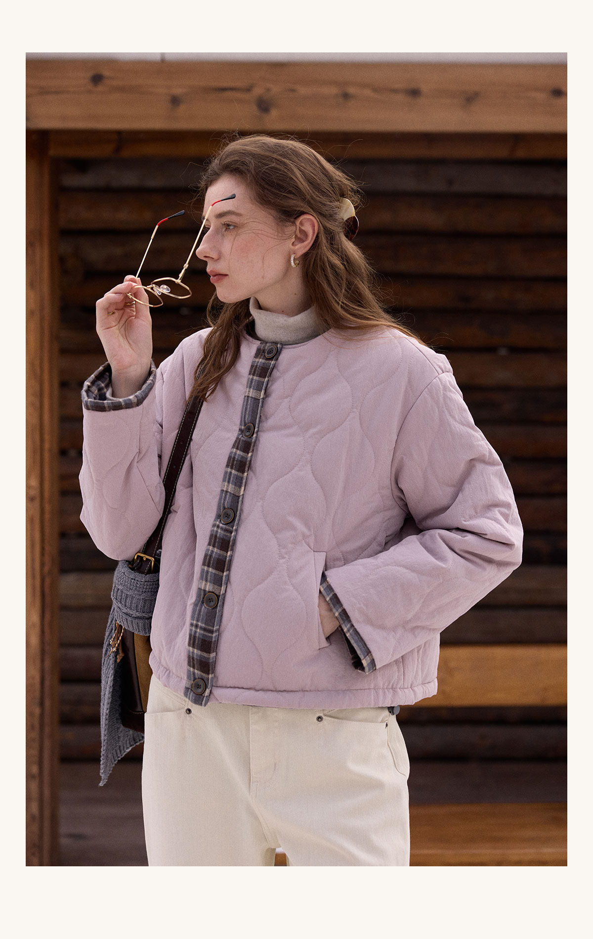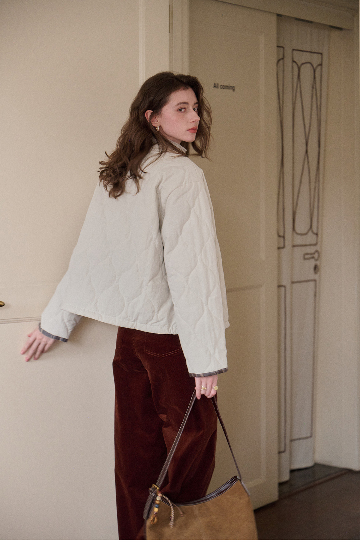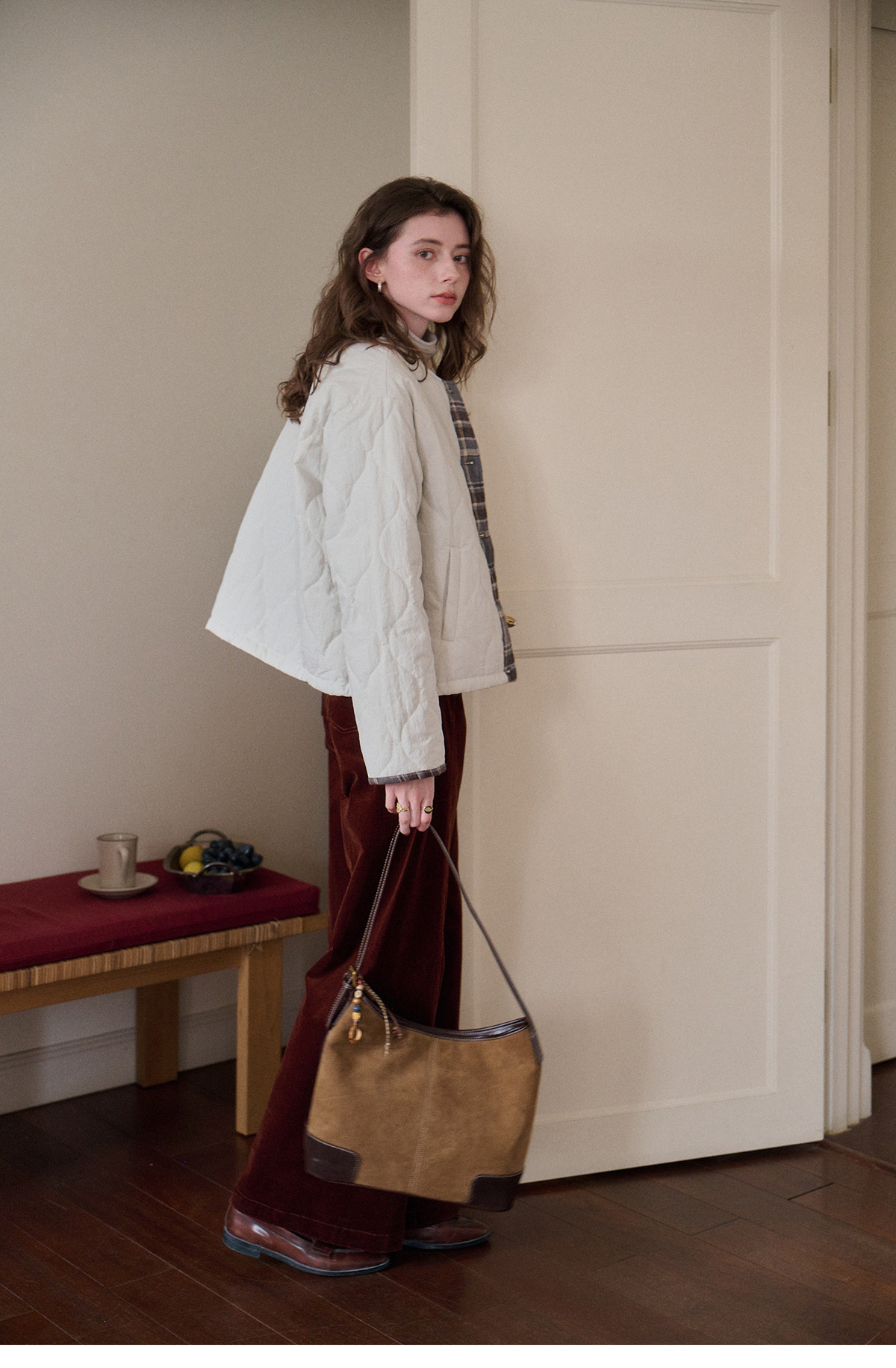 SimpleRetro香草戚风 洋气轻薄两面穿短款棉服外套女菱格圆领上衣