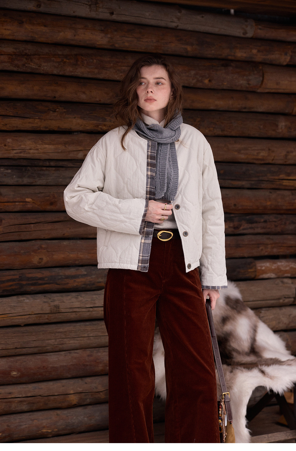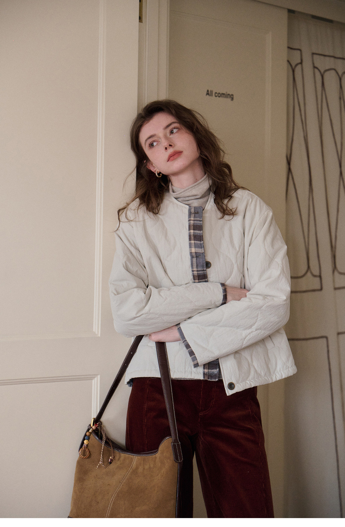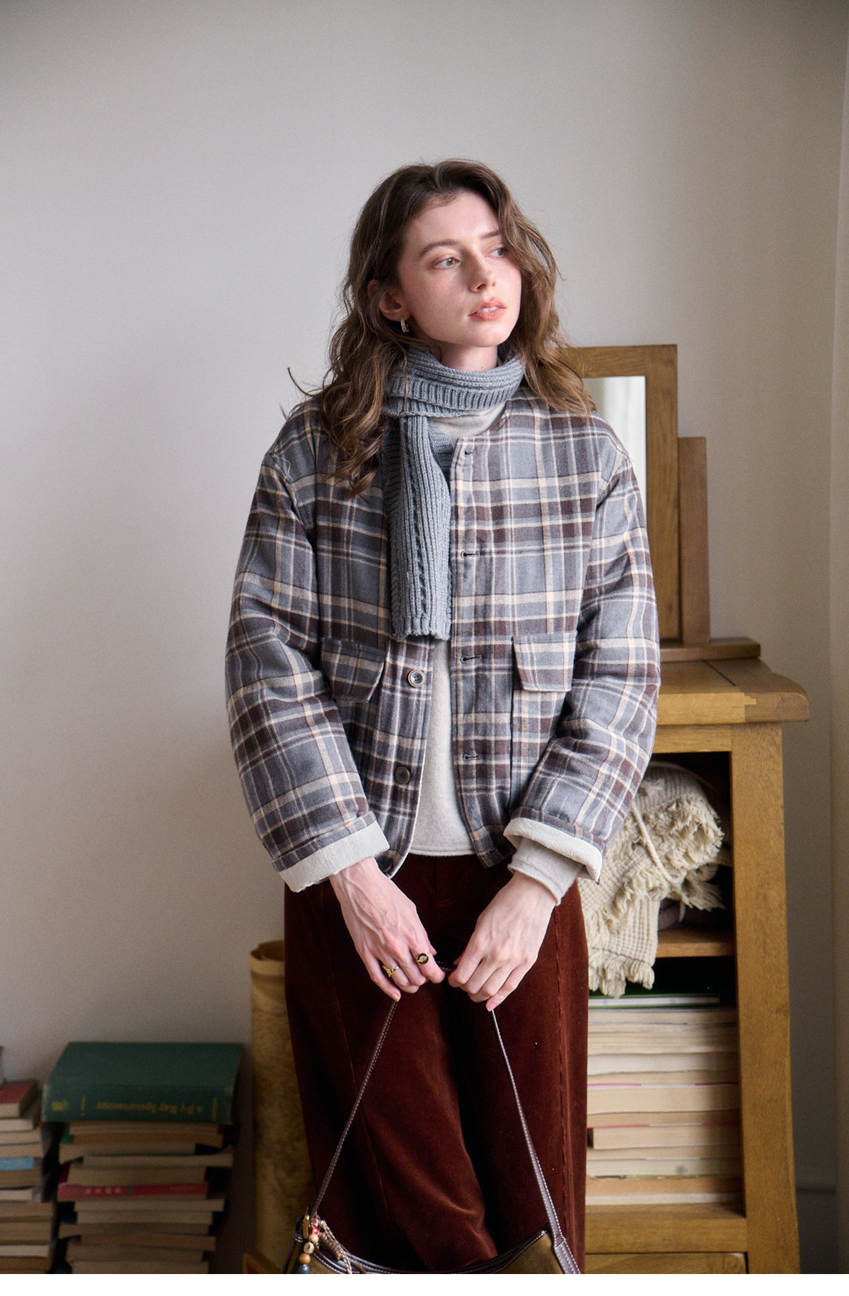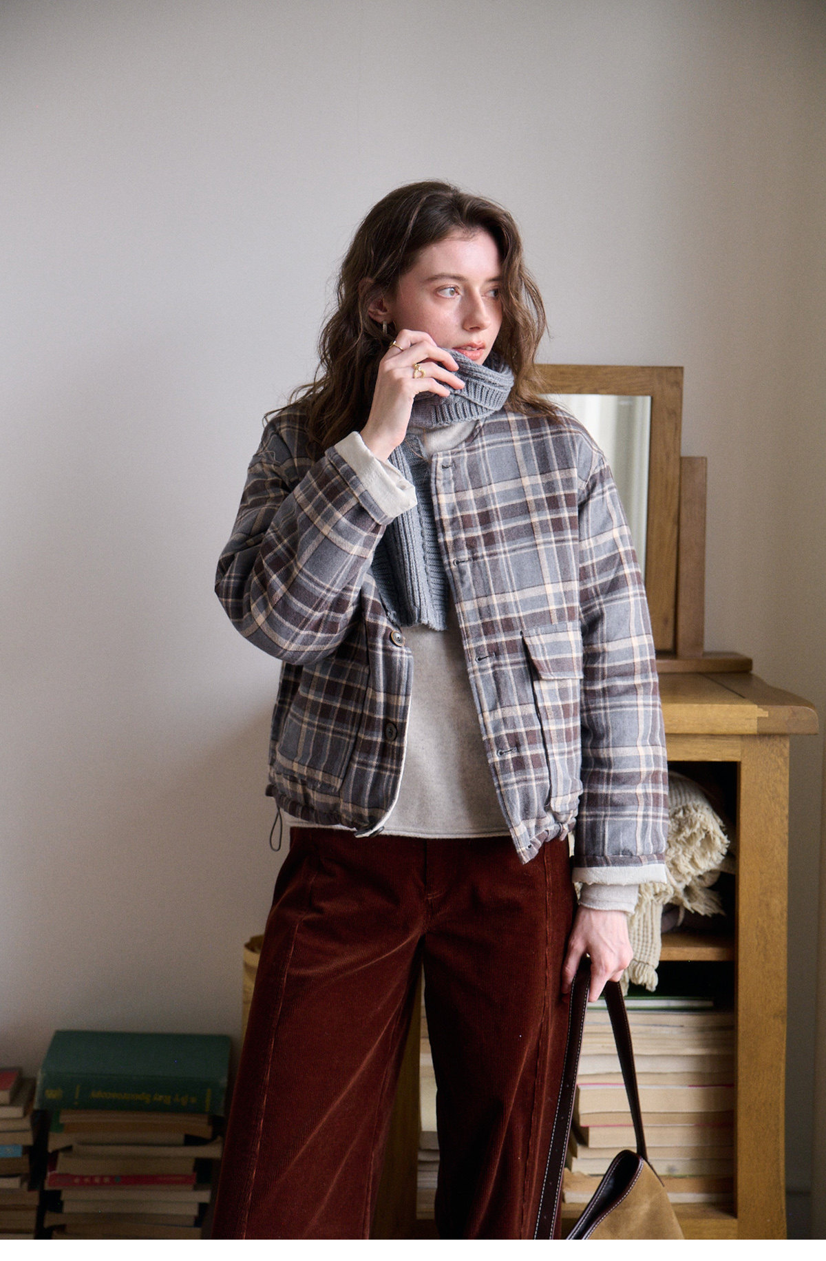 SimpleRetro香草戚风 洋气轻薄两面穿短款棉服外套女菱格圆领上衣