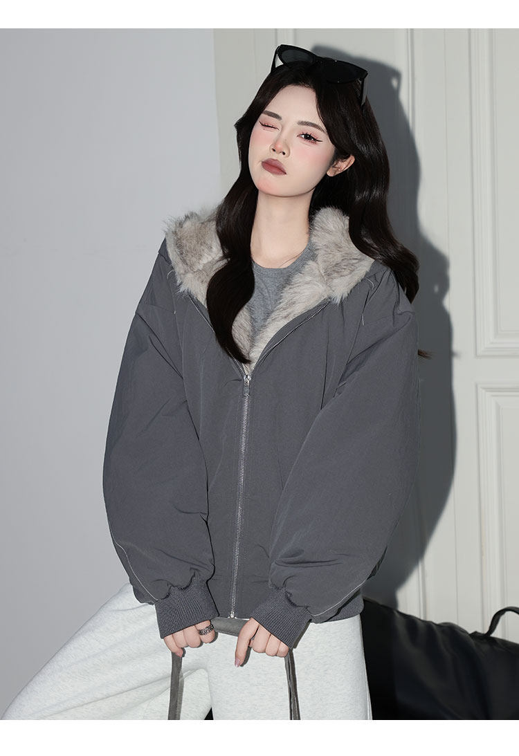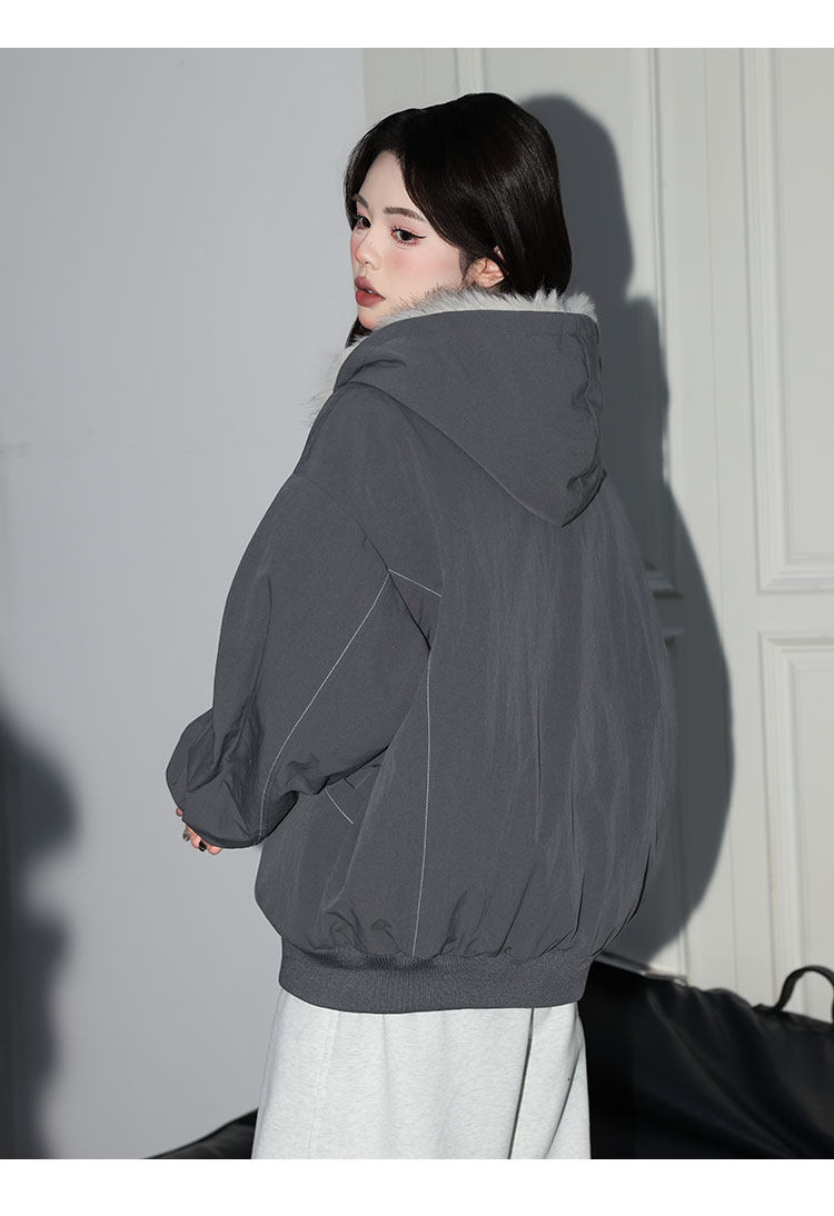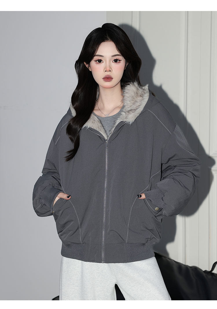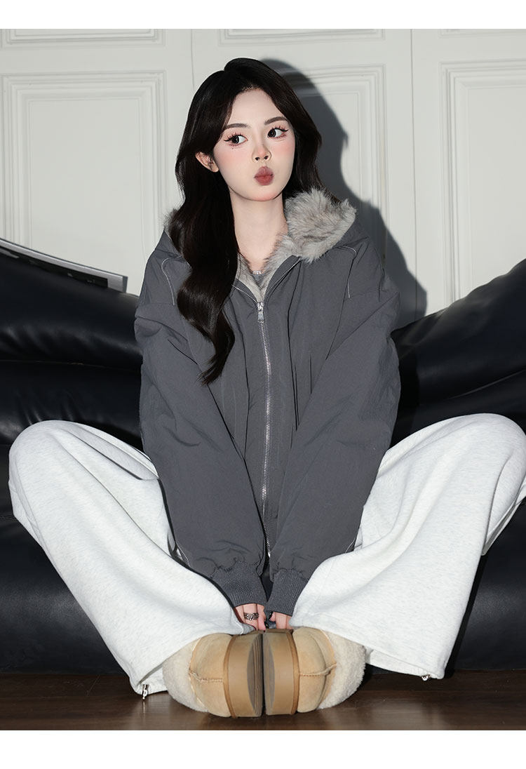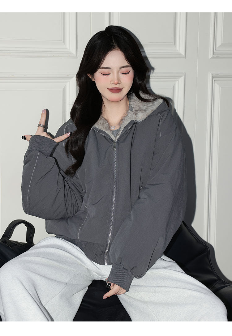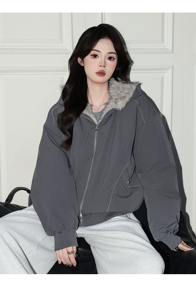 Forever 21 American Retro Gray Hooded down Jacket for Women, Loose Fit, Plush Warm Jacket