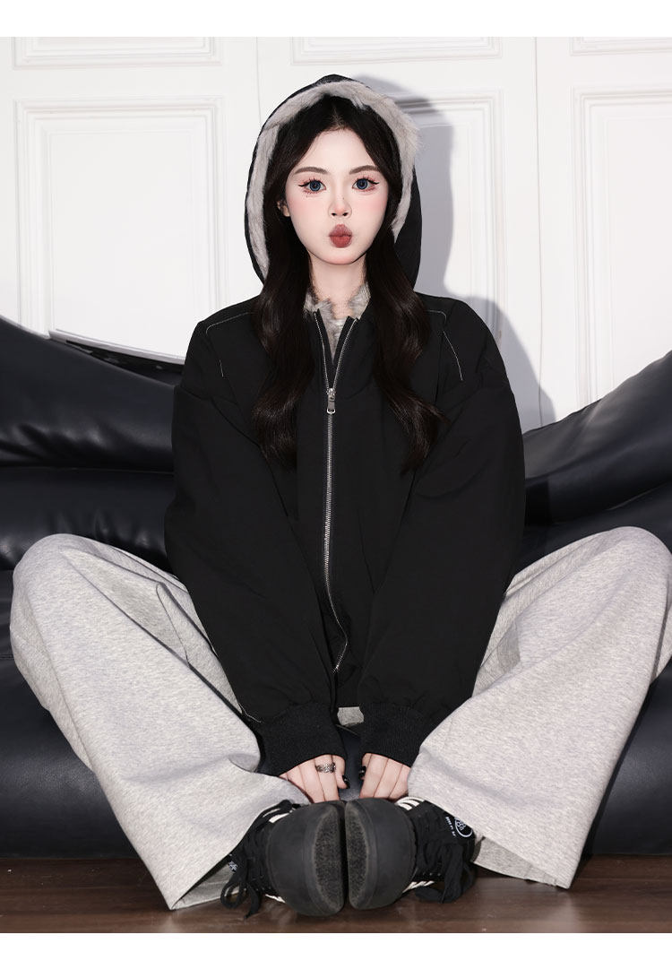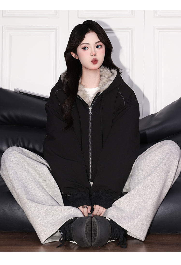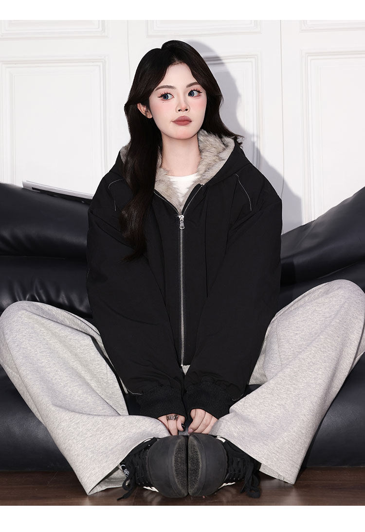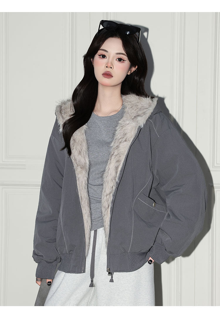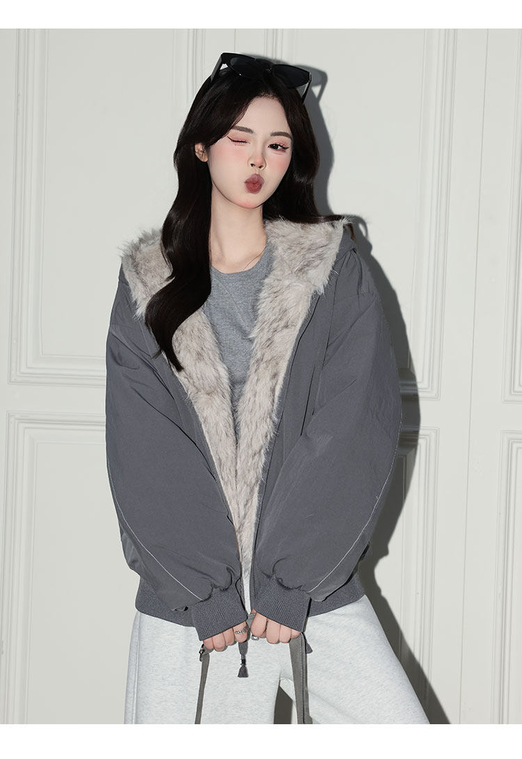 Forever 21 American Retro Gray Hooded down Jacket for Women, Loose Fit, Plush Warm Jacket