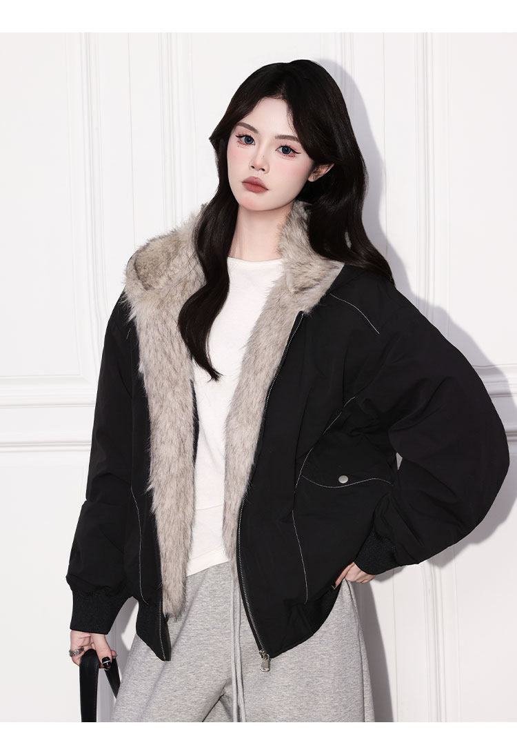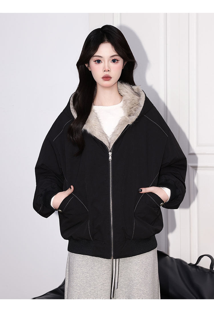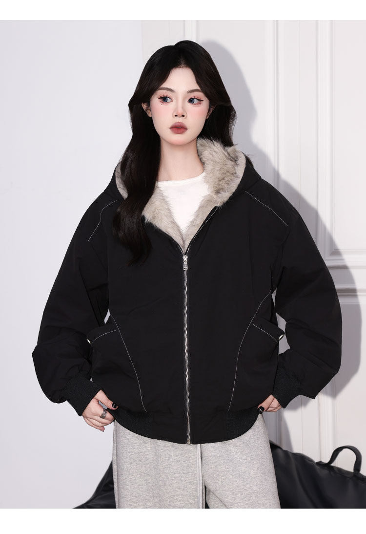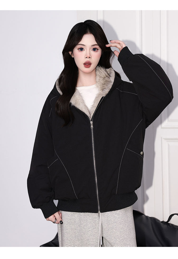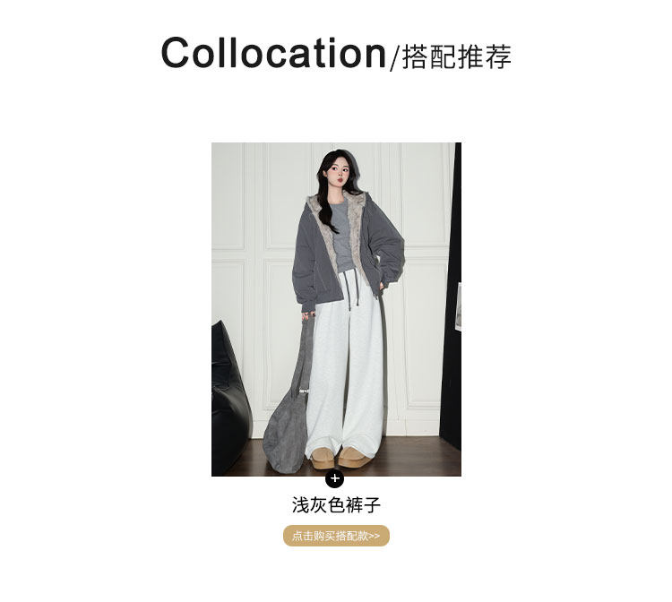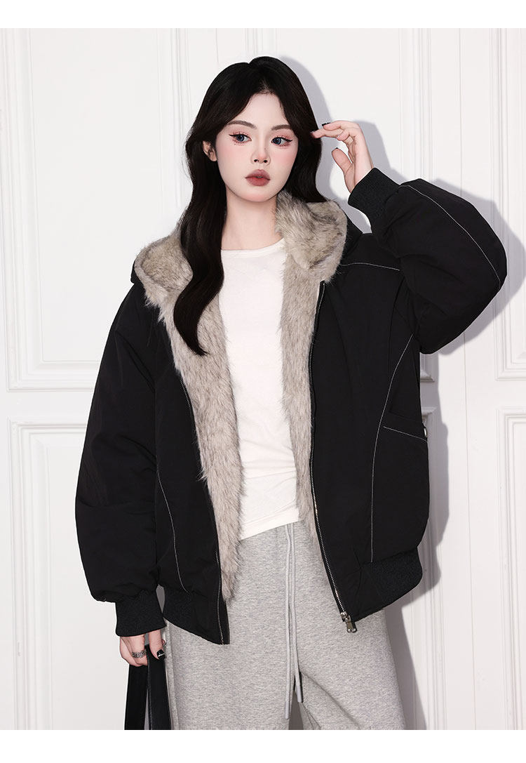 Forever 21 American Retro Gray Hooded down Jacket for Women, Loose Fit, Plush Warm Jacket