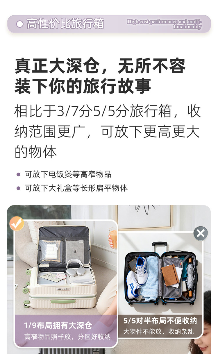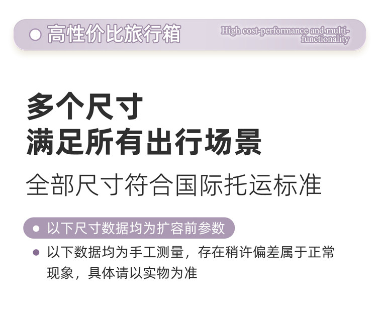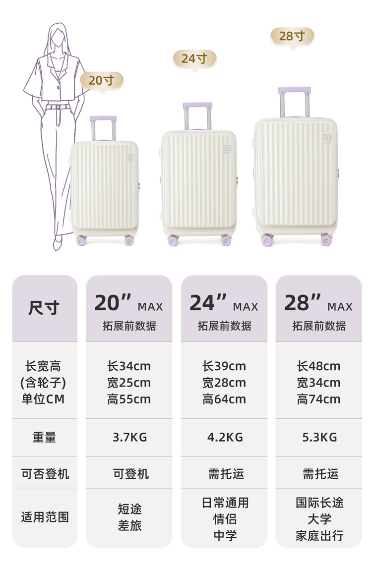 Размер Бортовой чемодан (подходит для коротких поездок продолжительностью от 1 до 5 дней),24inch Транспортировочная коробка (подходит для путешествий на 7–10 дней *большинство девушек выбирают),28inch Коробка для перевозки (Идеально подходит для дальних поездок, подготовки к школе, международных переездов и т.д. *Большая вместимость для удобной упаковки. Бесплатная страховка доставки для крупногабаритных товаров включена.)
