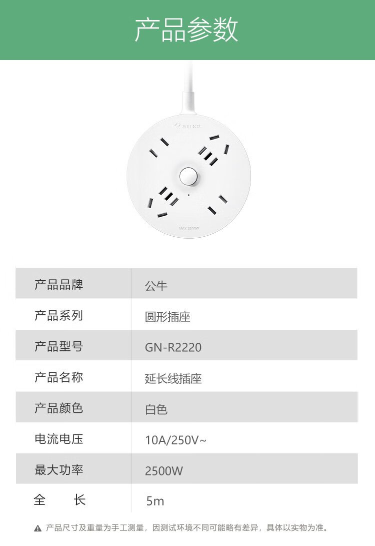 公牛(BULL)插座/插线板/插排/排插/拖线板 圆形插座4位总控 全长5米 GN-R2220