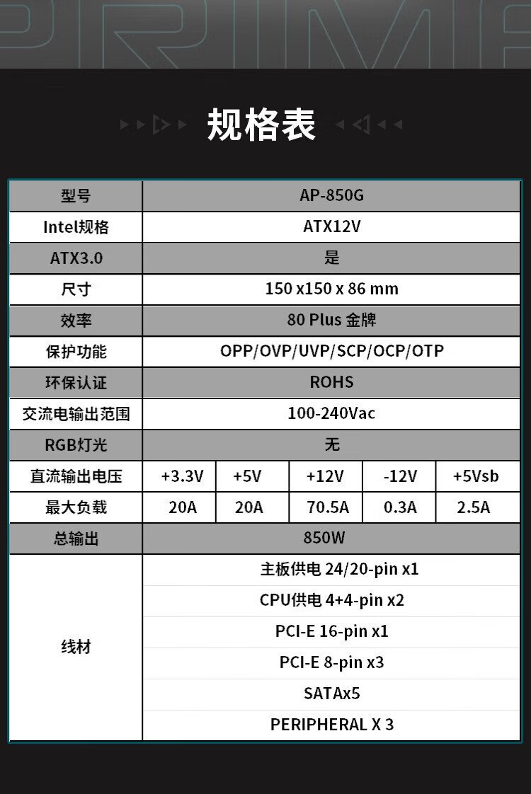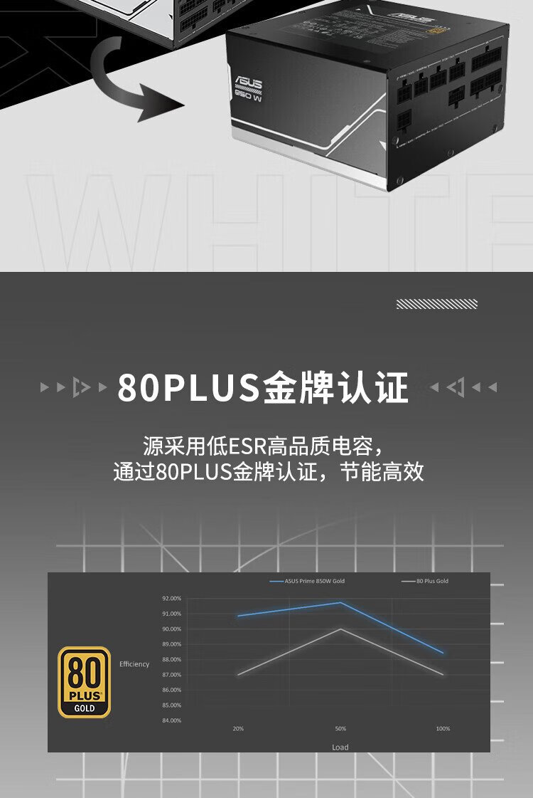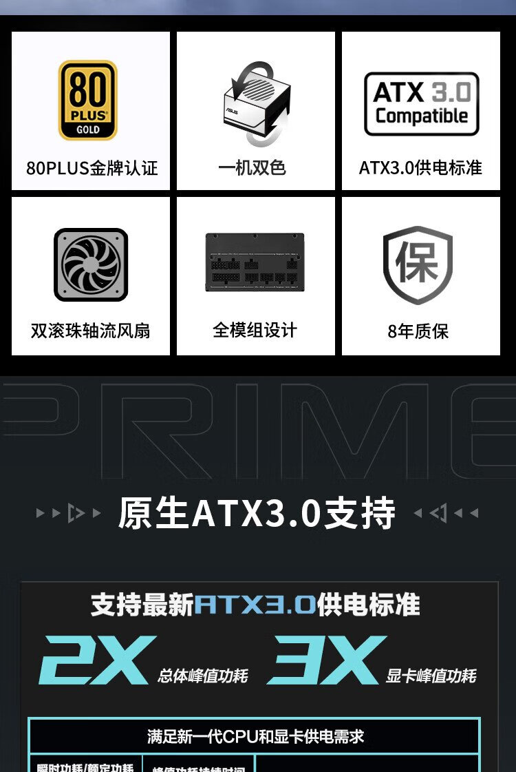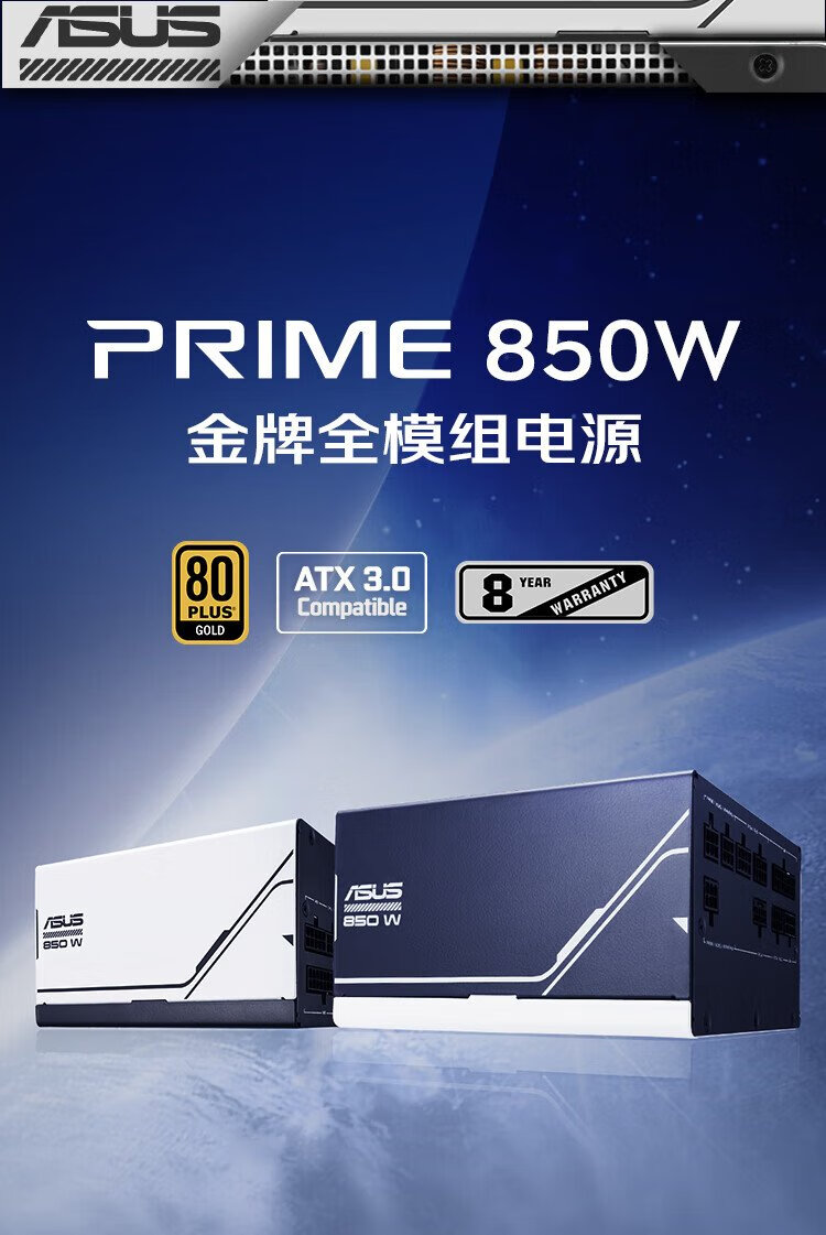 华硕PRIME 850W 金牌全模组电源 原生ATX3.0/支持50系显卡/PCIe5.0/一机双色/8年质保/80PLUS金牌认证