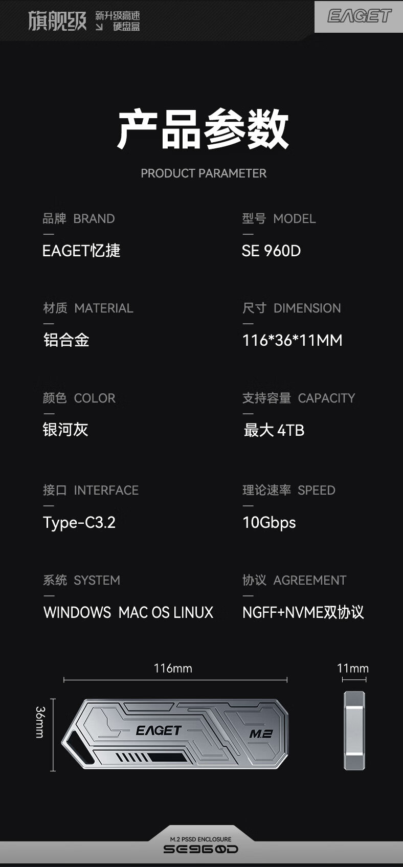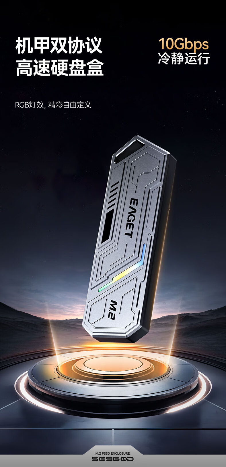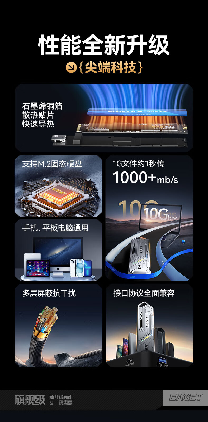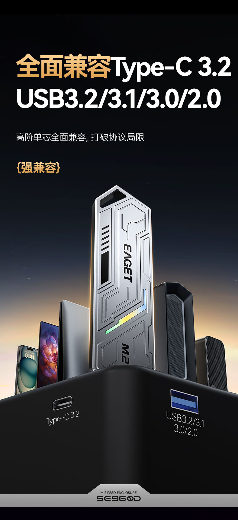 忆捷(EAGET)M.2 NVME/SATA双协议移动固态硬盘盒USB3.2/Type-c高速接口SSD固态硬盘外置盒笔记本台式通用