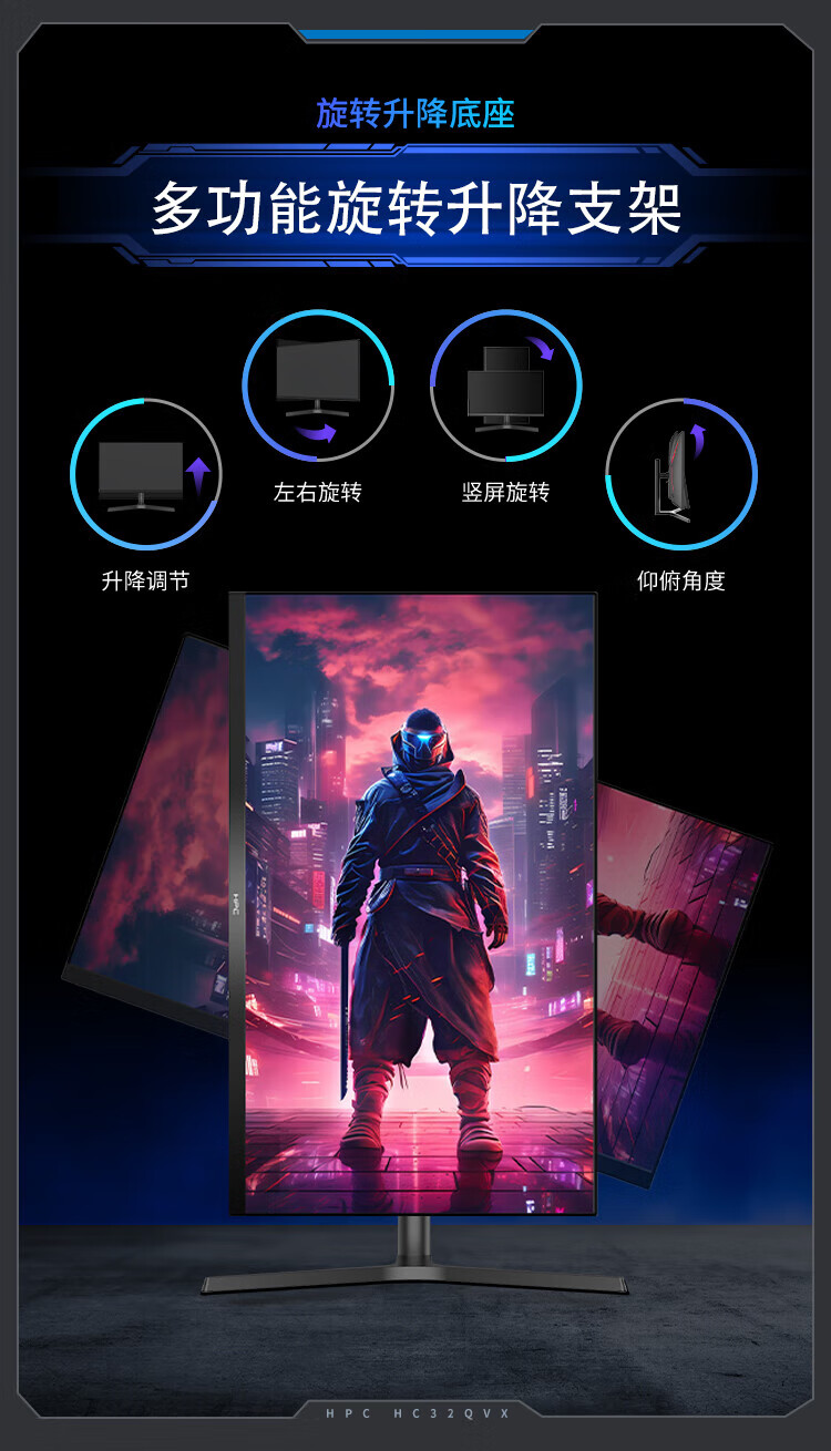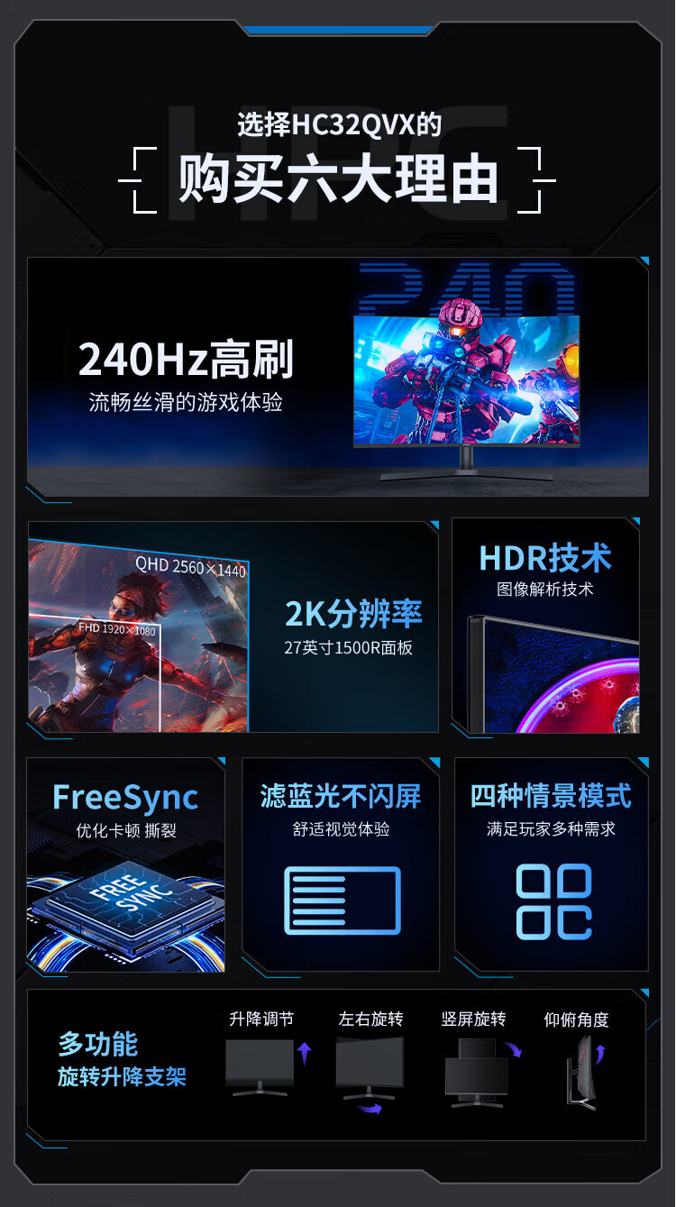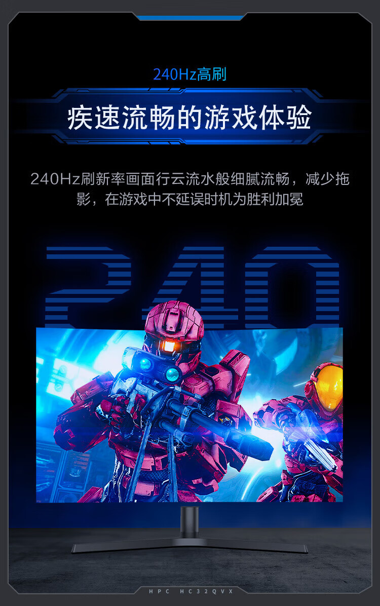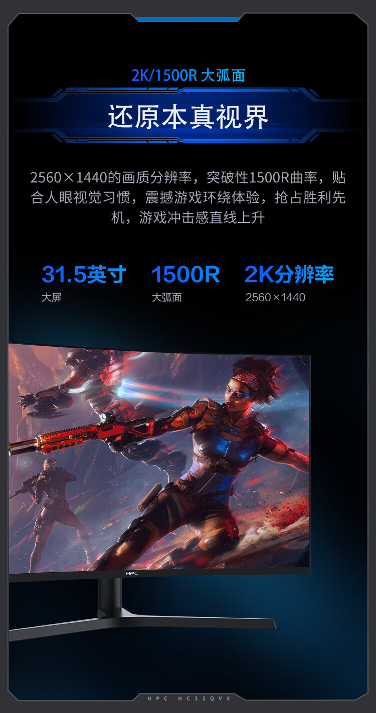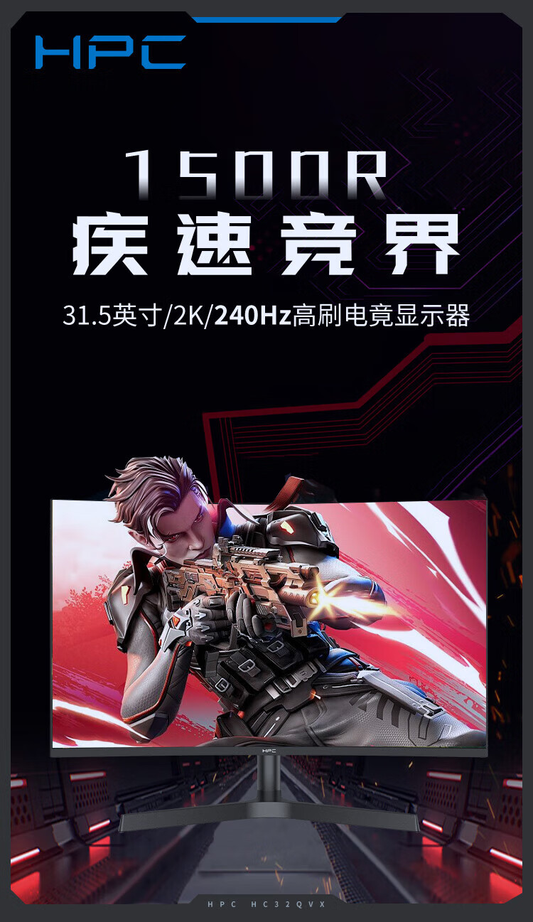 HPC 31.5英寸2K240Hz高刷电竞显示器 1500R曲面 HDR技术 滤蓝光 游戏电脑显示屏多功能支架 HC32QVX